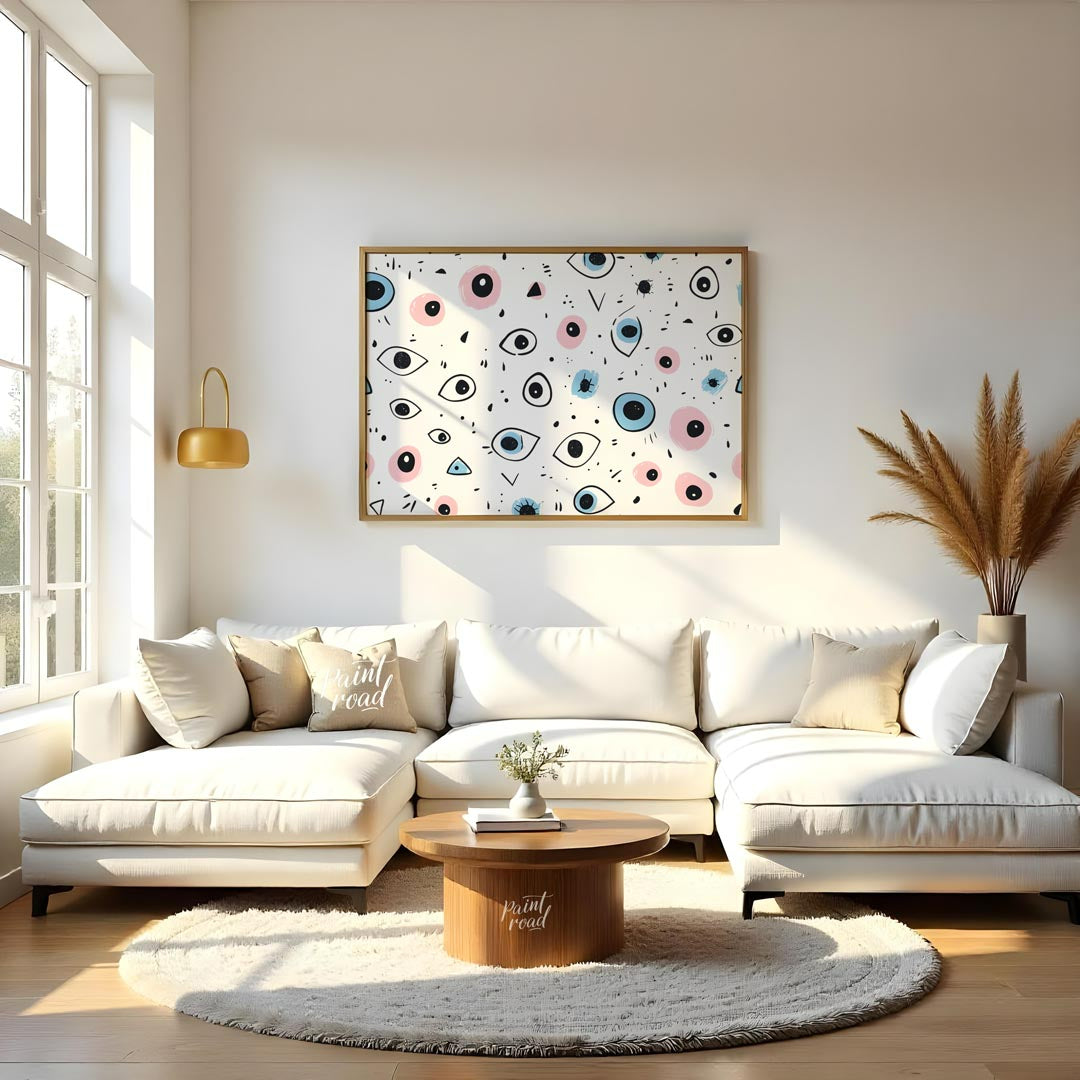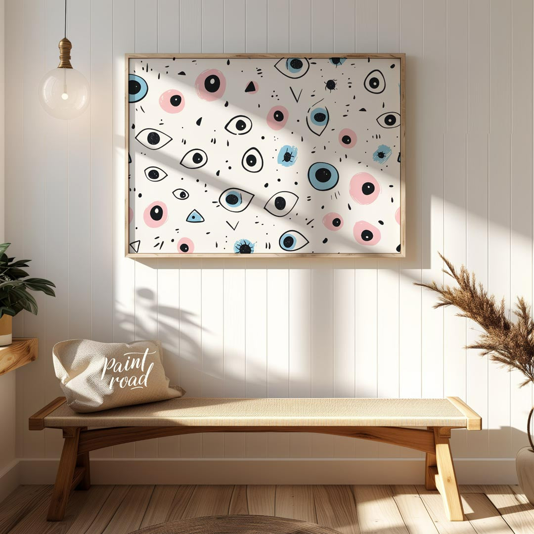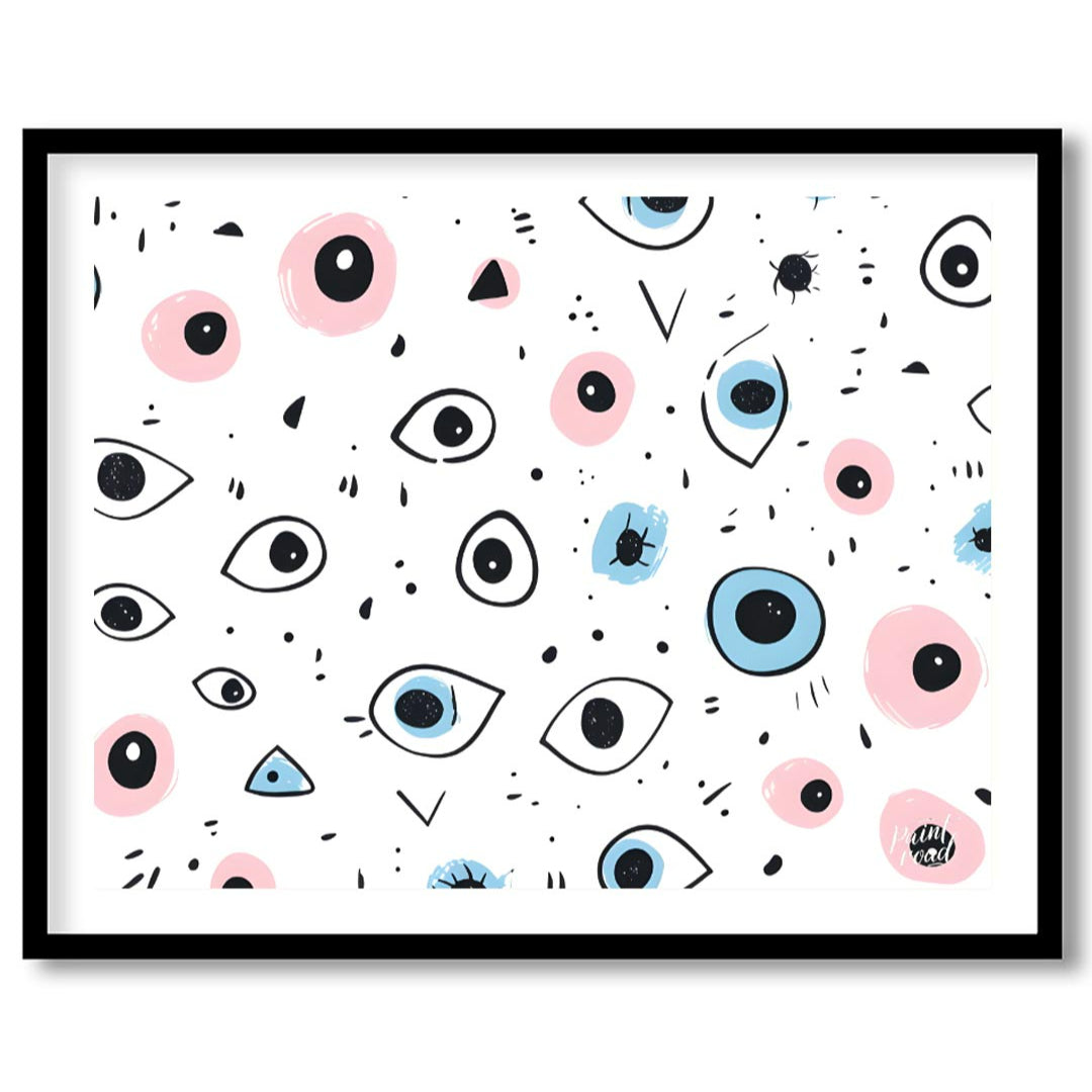 This whimsical and slightly quirky art print features a playful, repetitive pattern of stylized eyeballs and abstract dots, rendered in a charming color palette of black, pink, and light blue on a clean white background. The eyeballs vary in size and shape, with some being more circular, others more almond-shaped, and some even appearing as abstract outlines. The irises within the eyes are depicted as solid black circles, while the “whites” of some eyes are filled with soft pink or light blue, giving them a pop-art feel. Interspersed among the eyes are small black dots, dashes, and even tiny, abstract bug-like shapes in blue and black, adding to the eclectic and hand-drawn aesthetic. The overall impression is one of a friendly, abstract gaze that is both intriguing and lighthearted. The hand-drawn quality gives the pattern a unique, artistic touch. This print is perfect for adding a dose of personality, quirkiness, and contemporary art to any space. It’s ideal for those who appreciate unique patterns, abstract illustrations, and a touch of the unconventional.