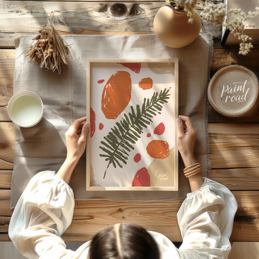 This abstract and earthy illustration features a central dark green fern frond or similar leafy branch, rendered with visible brushstrokes, giving it a tactile quality. The background is composed of various organic, irregular shapes in warm, muted tones: large orange and reddish-orange blobs, smaller red specks, and broader areas of beige and light brown. These abstract forms create a sense of natural movement and texture, evoking elements of a natural landscape or a well-loved, aged surface. The interplay between the structured foliage and the free-form background creates a balanced yet dynamic composition. This poster is ideal for a living room, study, bedroom, or any space seeking a connection to nature through abstract art, fitting well with bohemian, rustic, or contemporary decor.