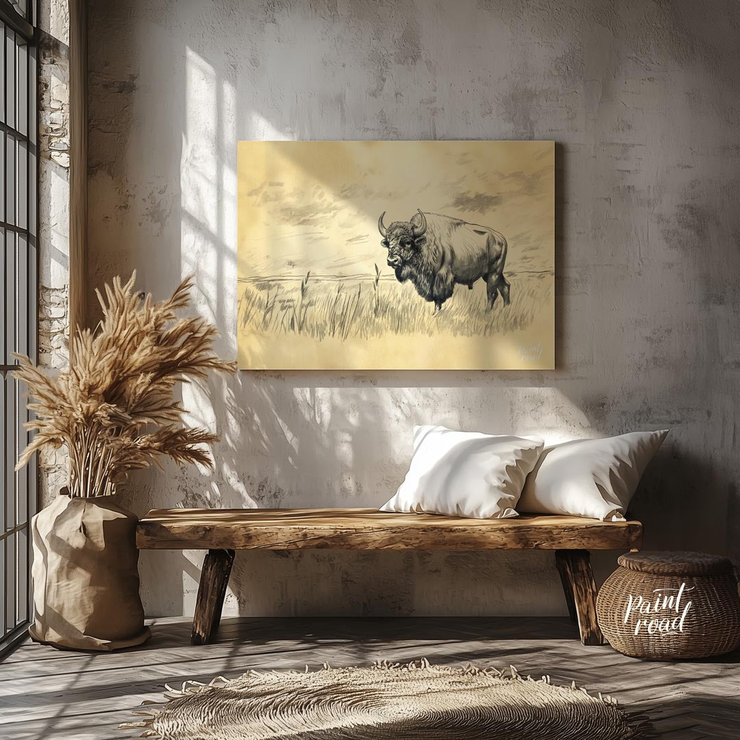 This evocative pencil sketch captures the majestic presence of a bison standing in a vast, open prairie. The bison, with its distinctive shaggy fur and powerful build, is rendered with meticulous detail, showing the texture of its coat and the strength of its horns. The artist's hand is evident in the expressive lines that define the tall grasses of the foreground, swaying gently in an unseen breeze. The background features a sweeping horizon line and a sky filled with dynamic, cloudy formations, all executed with quick, confident strokes of graphite. The sepia tone of the paper adds a timeless, classic feel to the drawing, reminiscent of early natural history illustrations or Western American art. This piece exudes a sense of rugged wilderness and the enduring spirit of the American plains.