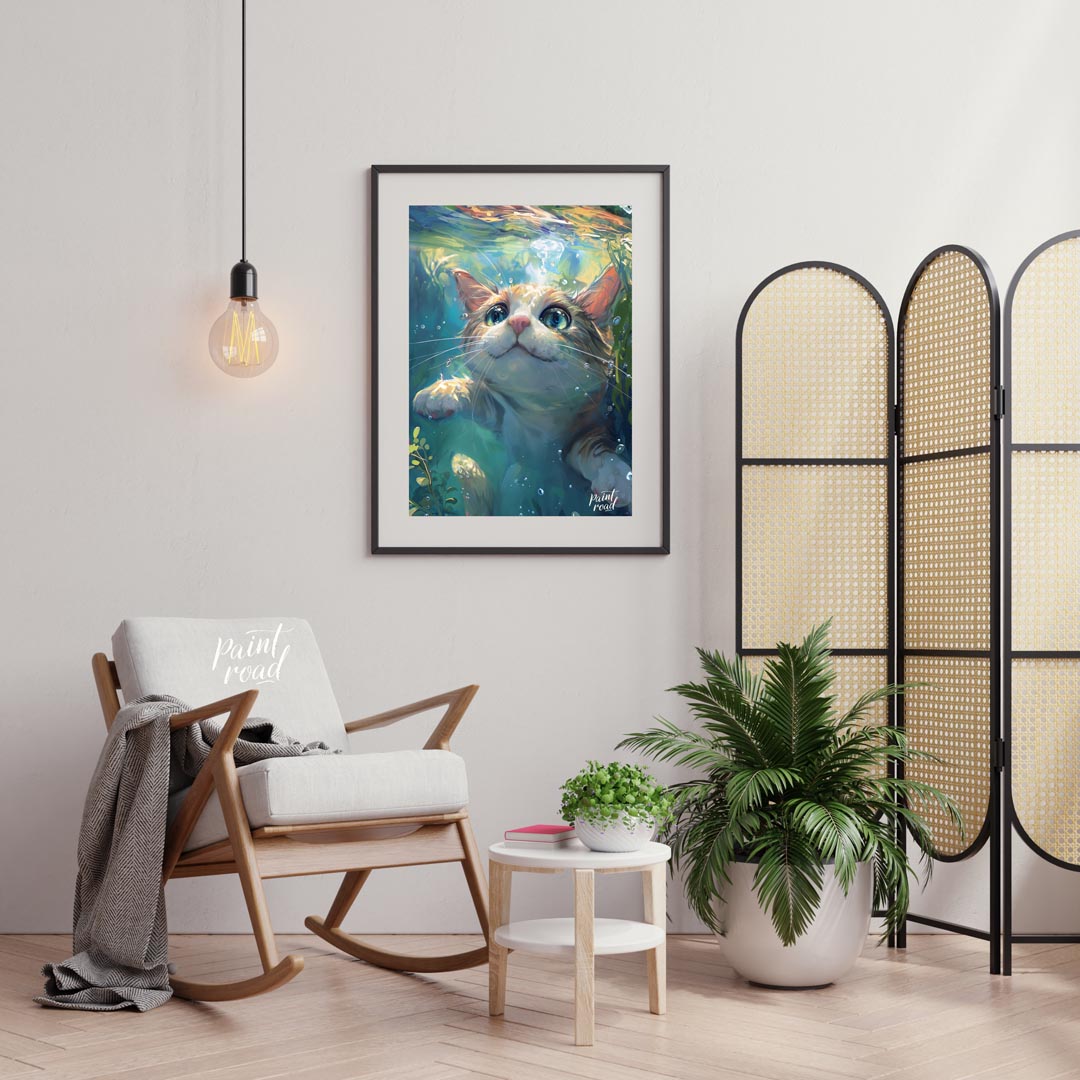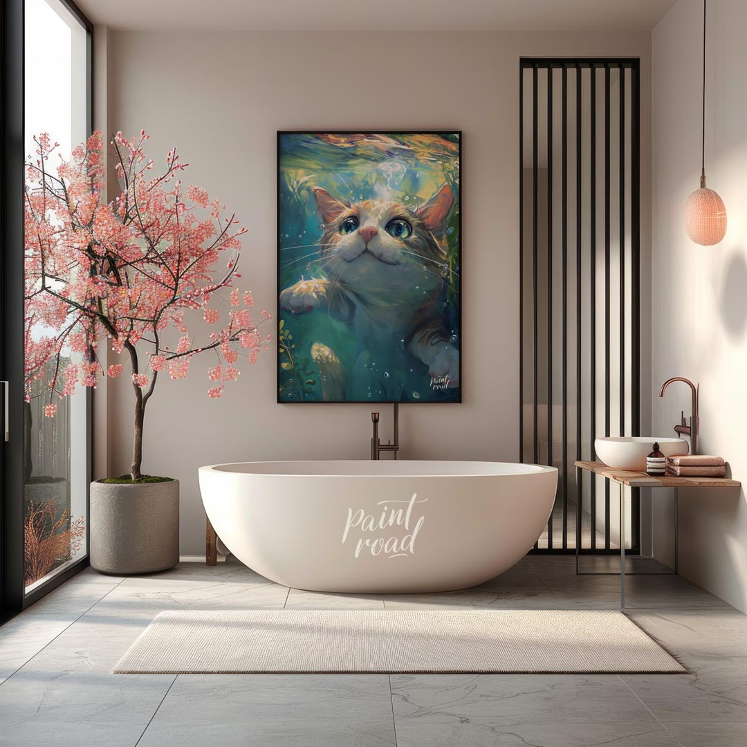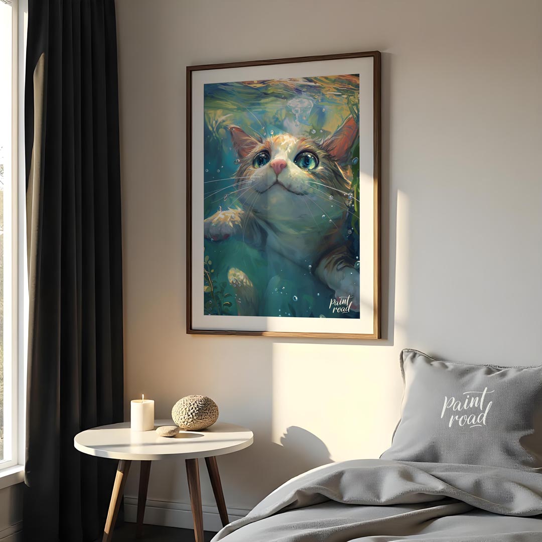 This close-up digital painting features a ginger and white cat submerged underwater, looking upwards with an expression of pure contentment and wide, sparkling blue-green eyes. Bubbles gracefully float around its face, and a faint, ethereal jellyfish-like form hovers above its head. The aquatic environment is depicted with lush green foliage and varying shades of blue, creating a serene and immersive experience. The cat's whiskers are detailed, and its fur appears soft even through the water. The artistic style is vibrant and smooth, highlighting the cat's endearing features and the magical quality of the underwater world. This image conveys a sense of peaceful wonder and delightful immersion.