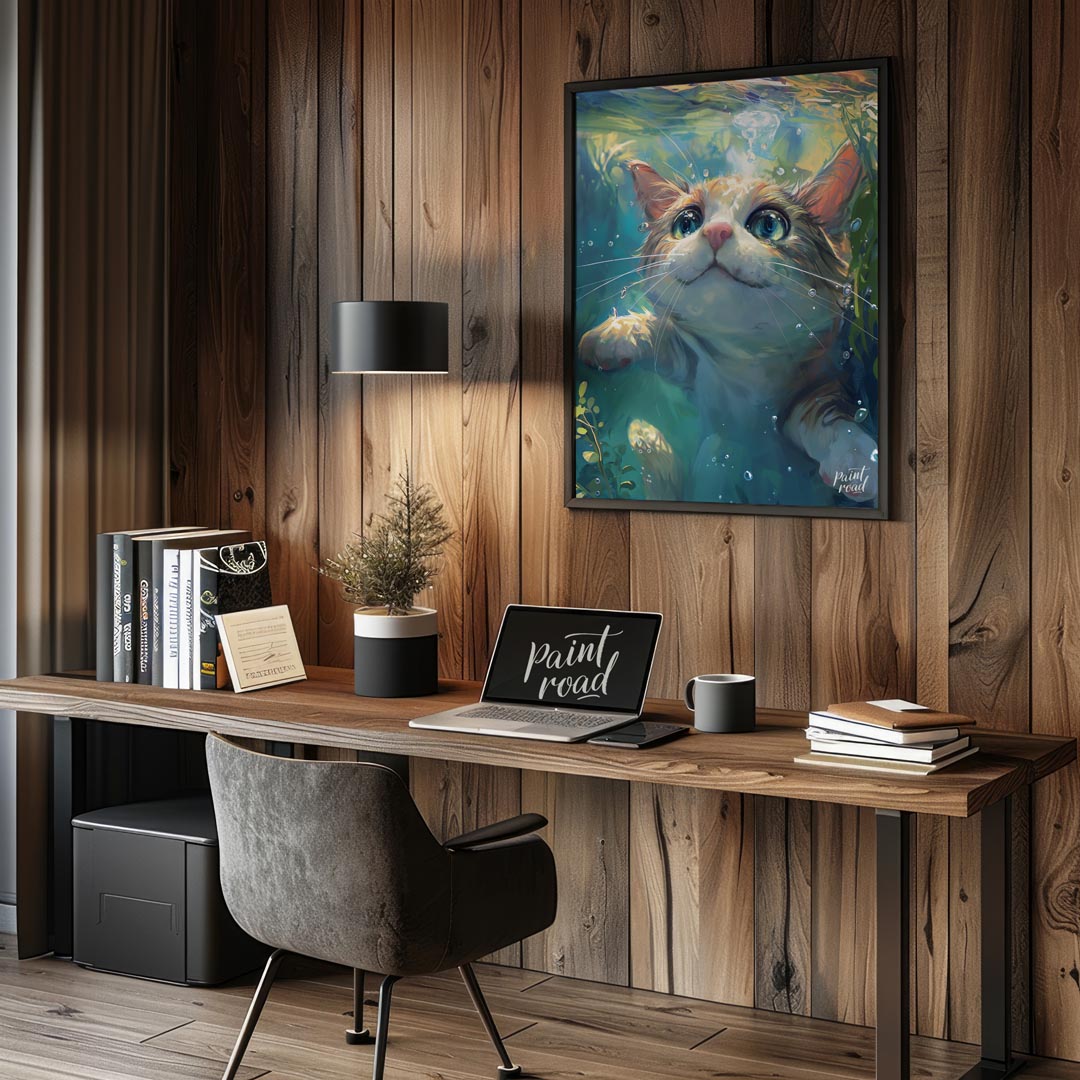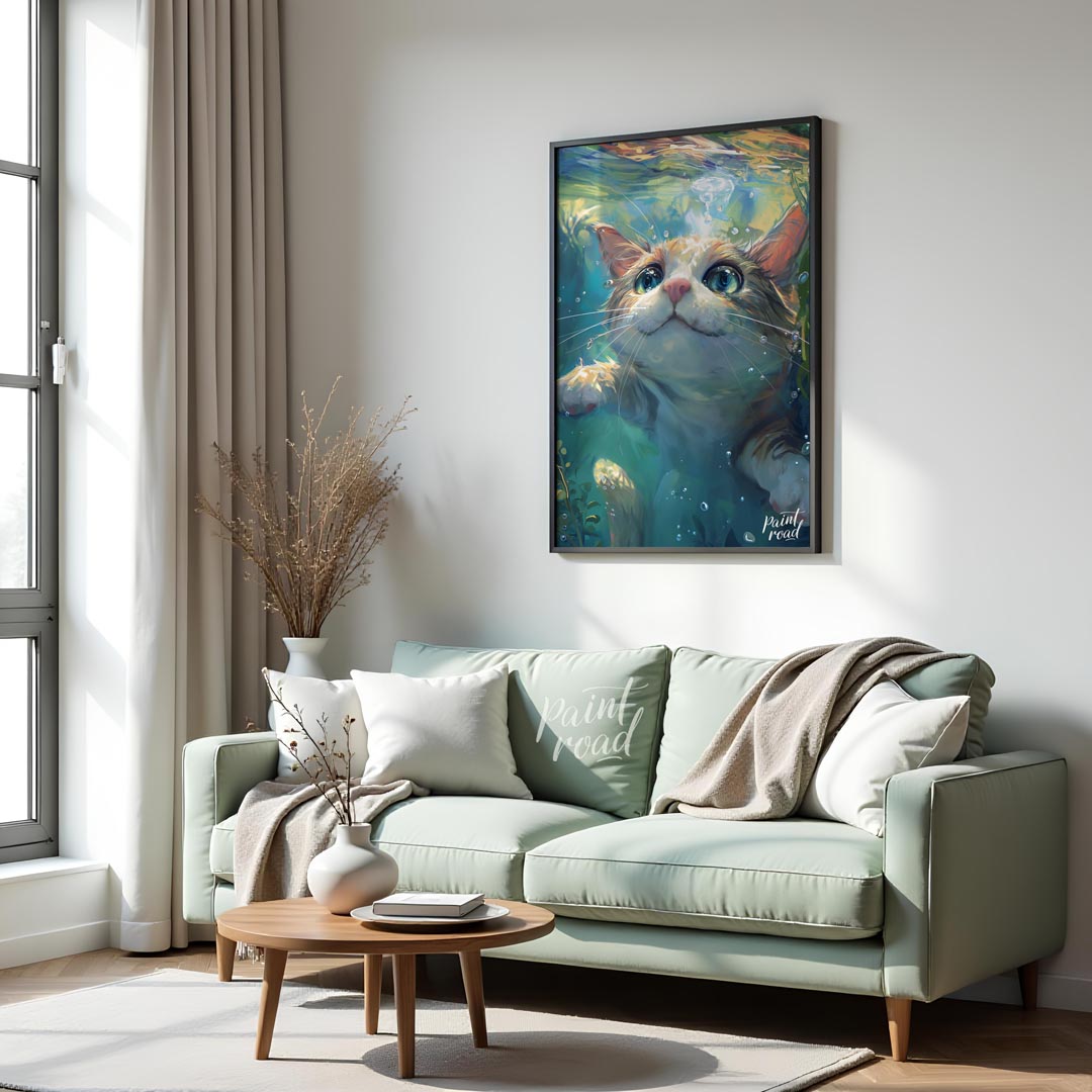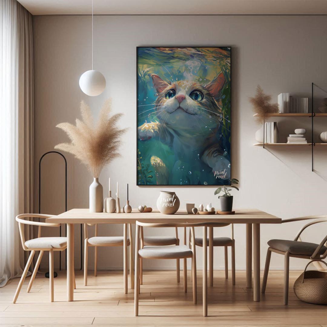 This close-up digital painting features a ginger and white cat submerged underwater, looking upwards with an expression of pure contentment and wide, sparkling blue-green eyes. Bubbles gracefully float around its face, and a faint, ethereal jellyfish-like form hovers above its head. The aquatic environment is depicted with lush green foliage and varying shades of blue, creating a serene and immersive experience. The cat's whiskers are detailed, and its fur appears soft even through the water. The artistic style is vibrant and smooth, highlighting the cat's endearing features and the magical quality of the underwater world. This image conveys a sense of peaceful wonder and delightful immersion.