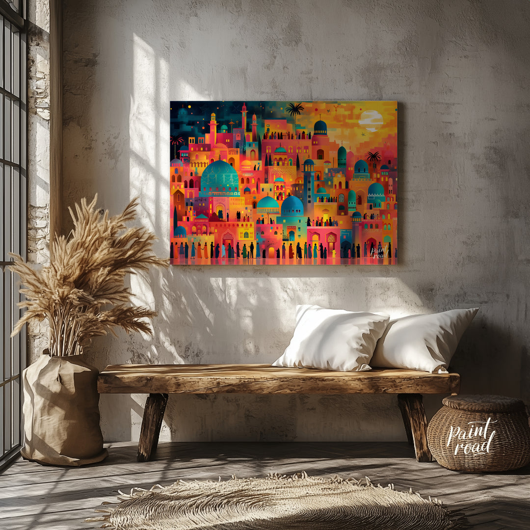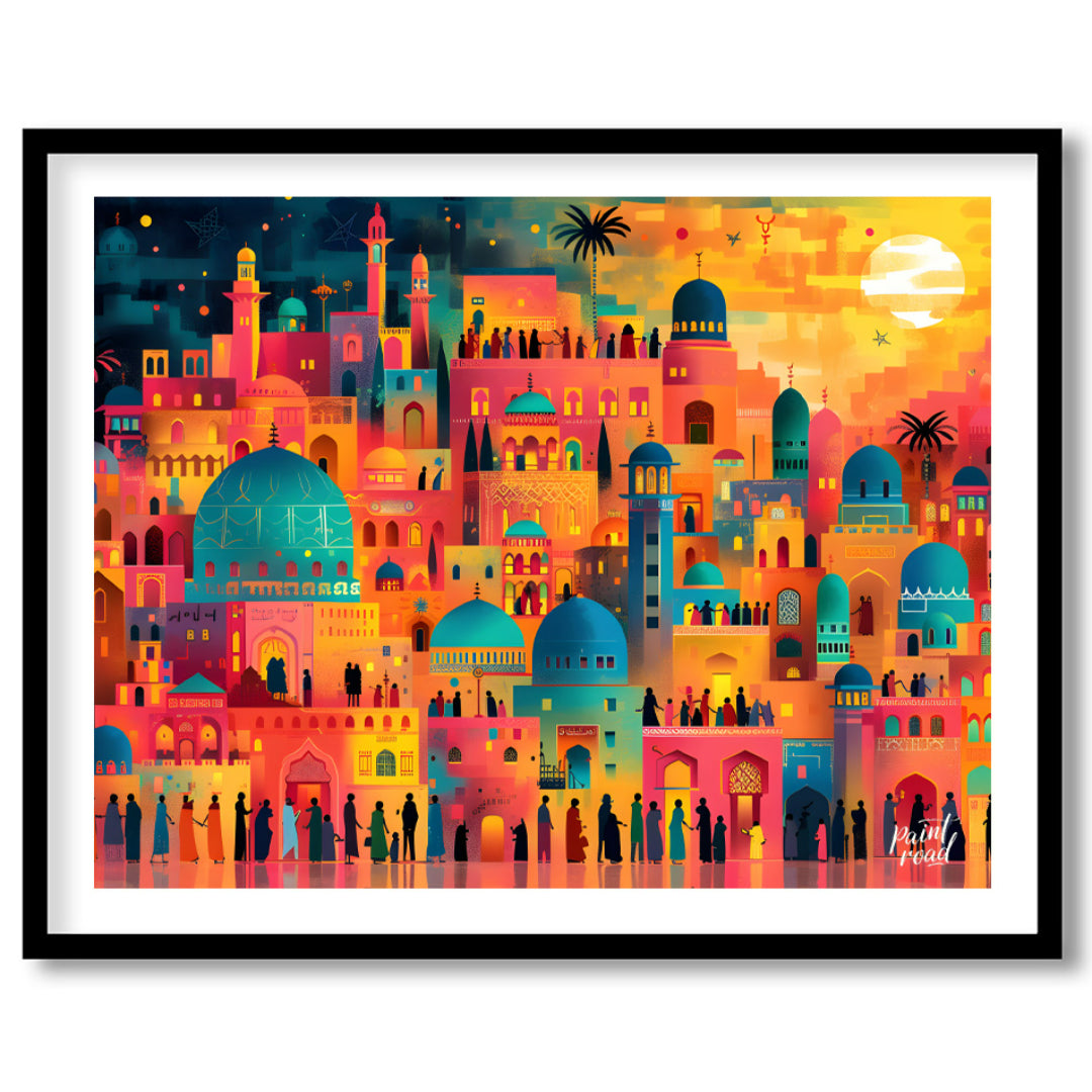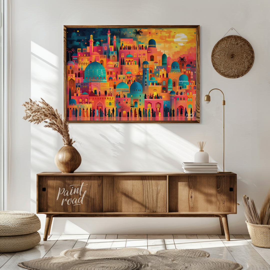 This vibrant art depicts a vibrant, fantastical cityscape teeming with life and illuminated by a dazzling array of colors. Domed buildings and towering minarets create a whimsical skyline, while throngs of people, rendered in silhouette, populate the bustling streets. The warm, radiant hues of the setting sun blend seamlessly with the cool blues of the evening, creating a magical atmosphere. This image is a celebration of community, culture, and the enchanting beauty of a city bathed in light.