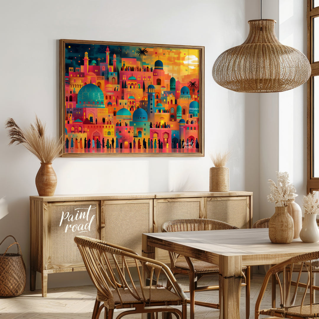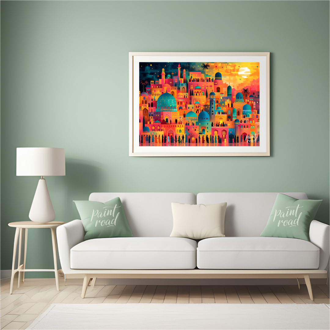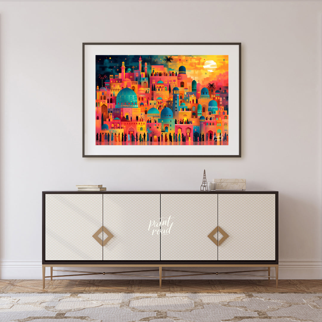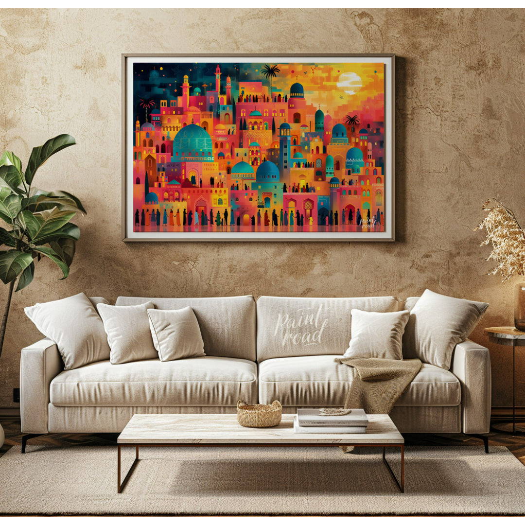 This vibrant art depicts a vibrant, fantastical cityscape teeming with life and illuminated by a dazzling array of colors. Domed buildings and towering minarets create a whimsical skyline, while throngs of people, rendered in silhouette, populate the bustling streets. The warm, radiant hues of the setting sun blend seamlessly with the cool blues of the evening, creating a magical atmosphere. This image is a celebration of community, culture, and the enchanting beauty of a city bathed in light.