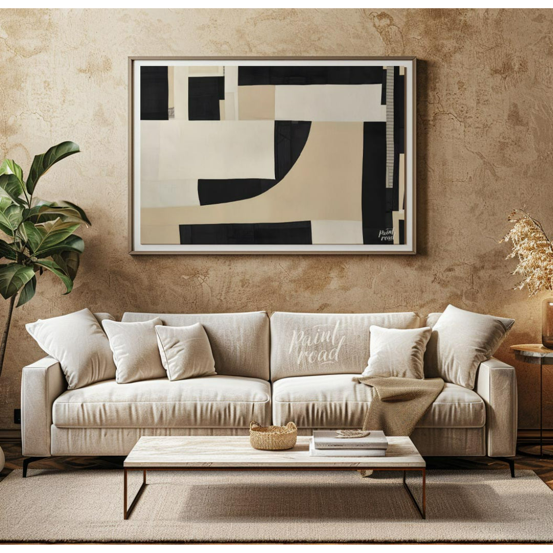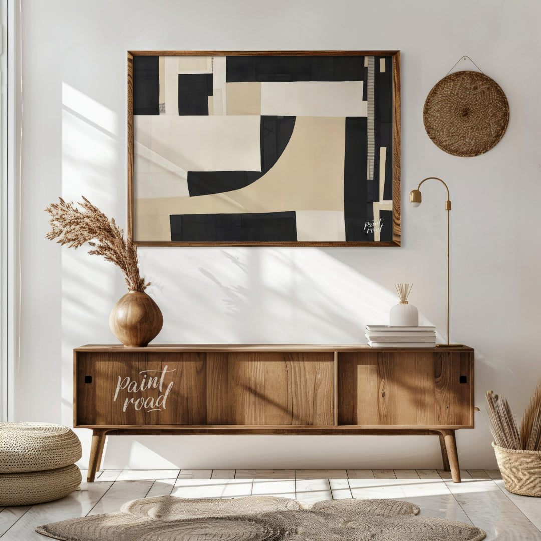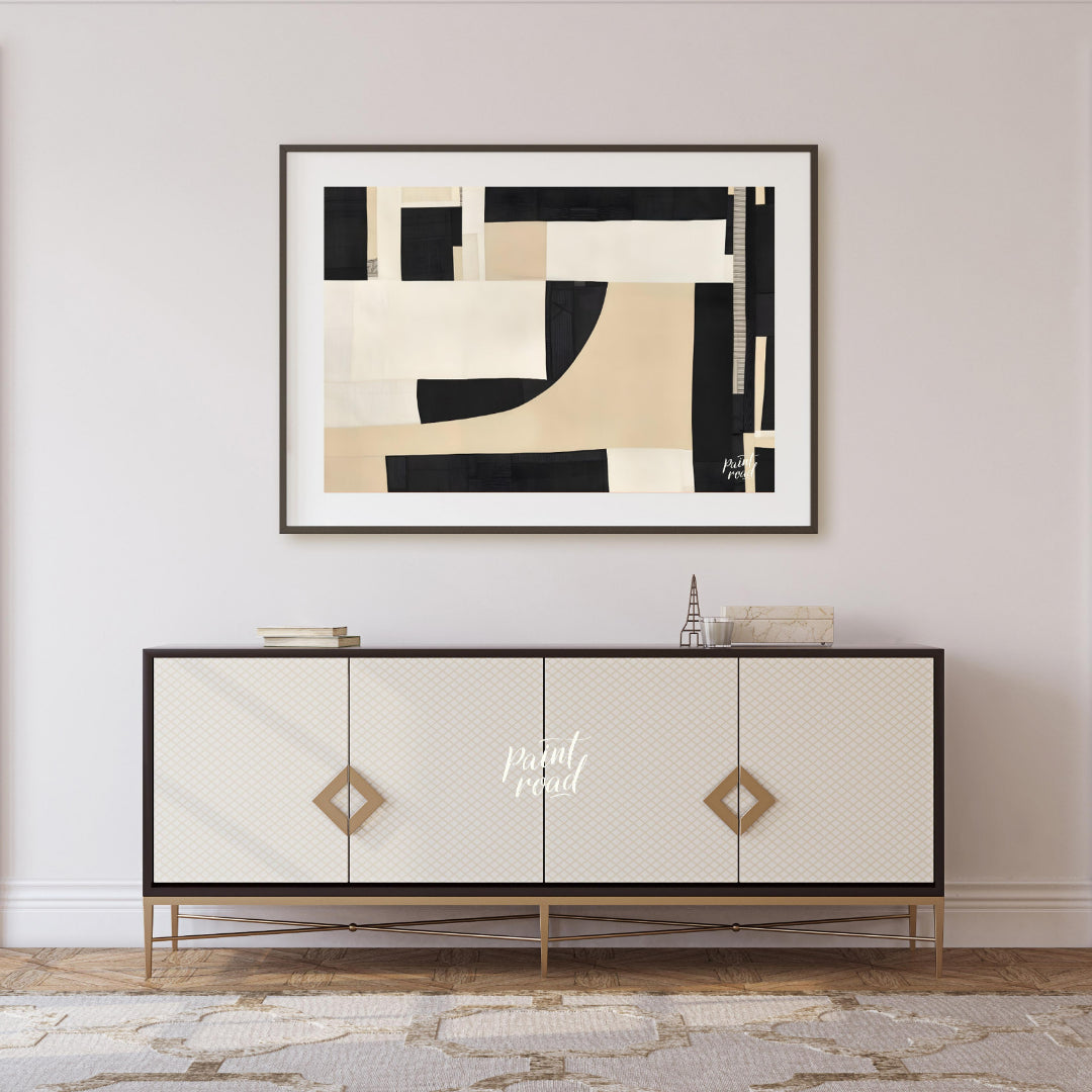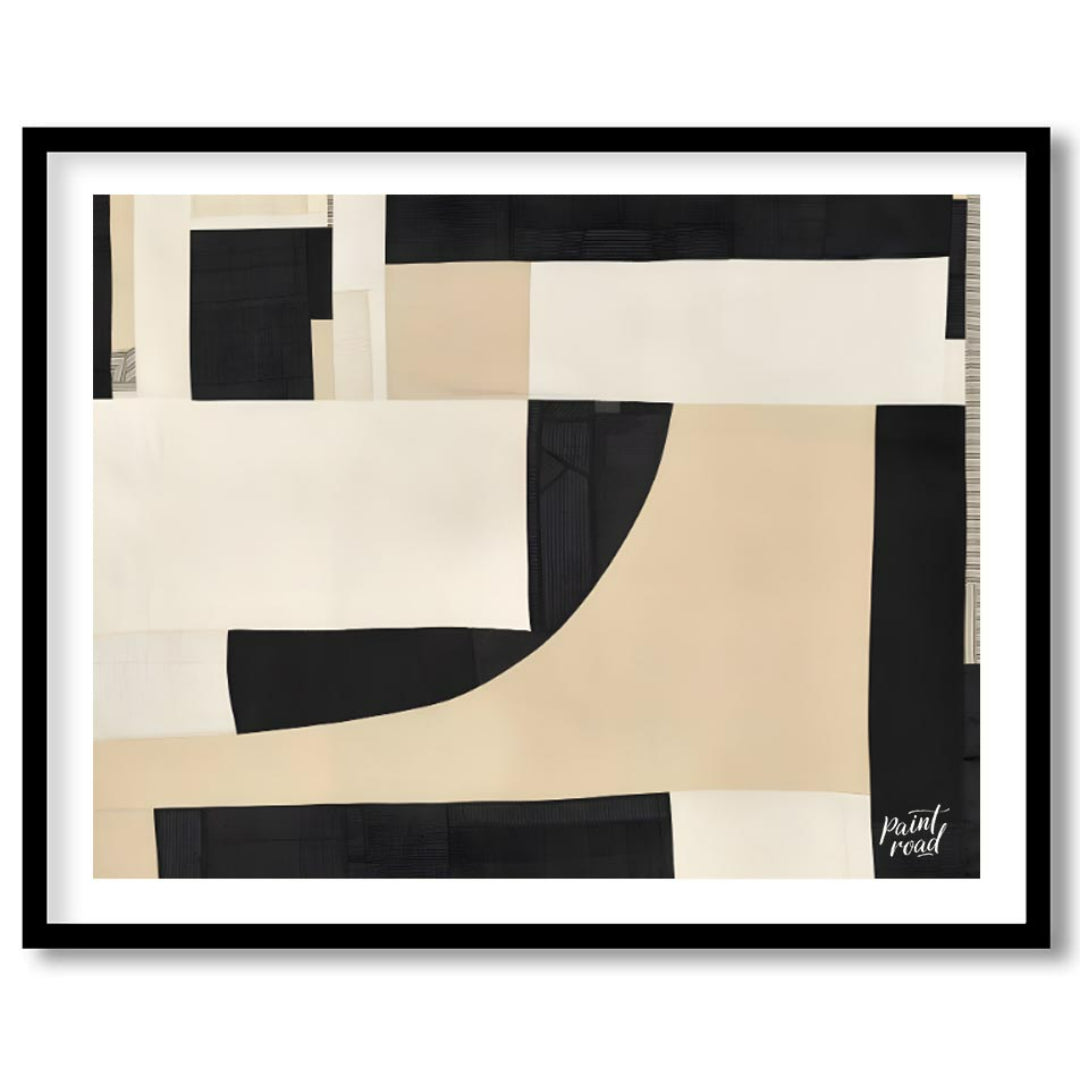 """Constructed Contrast"" presents a striking abstract composition featuring a collage-like arrangement of geometric shapes in black, white, and neutral tones. The artwork evokes a sense of architectural construction and layered design. The interplay of solid forms and subtle textures creates depth and visual intrigue. The precise arrangement and stark contrasts suggest a modern, minimalist aesthetic. This piece balances a sense of structured order with the intrigue of fragmented forms, inviting the viewer to explore its intricate patterns and spatial relationships."