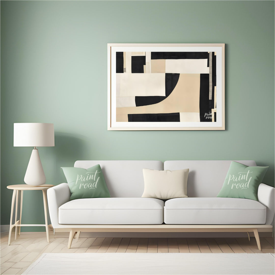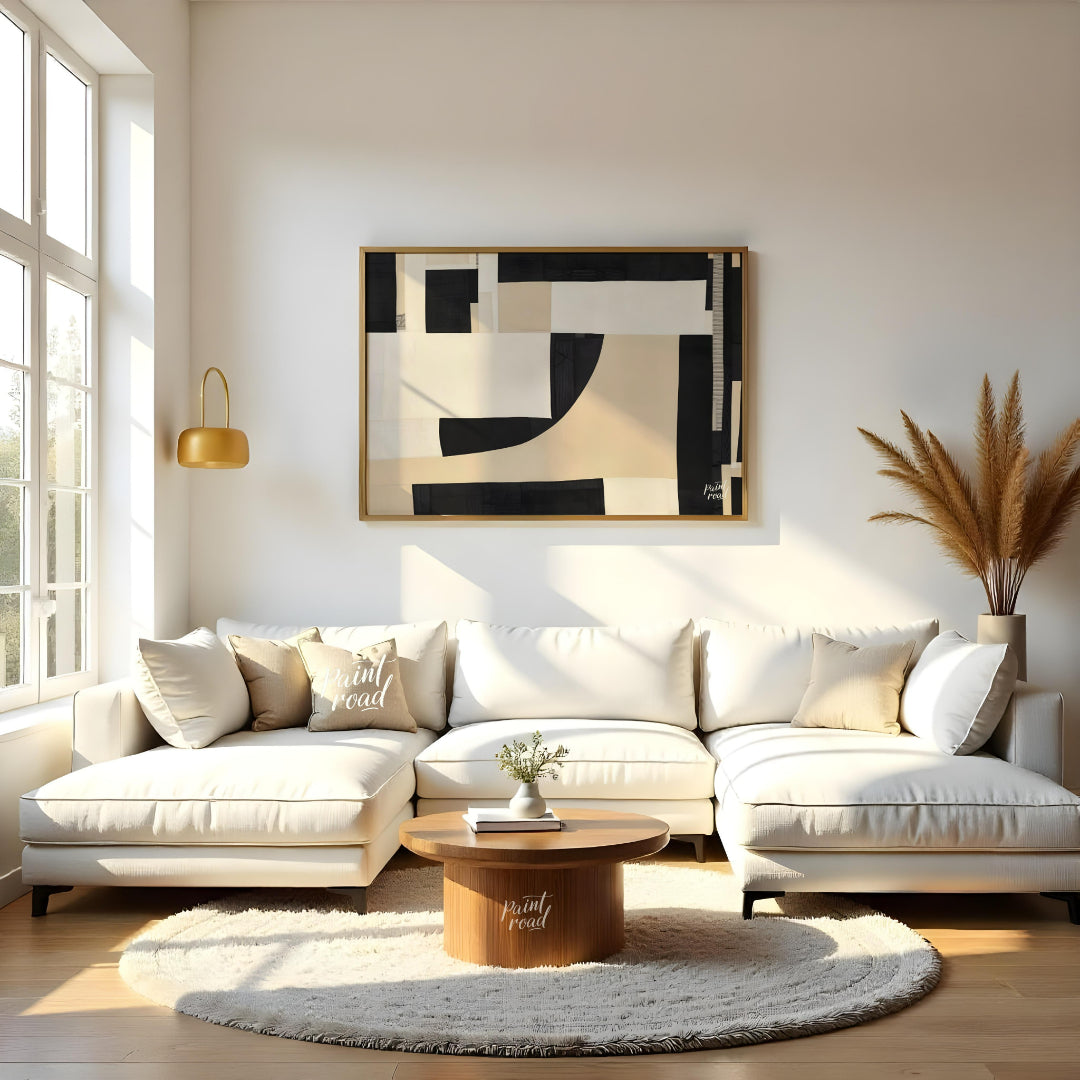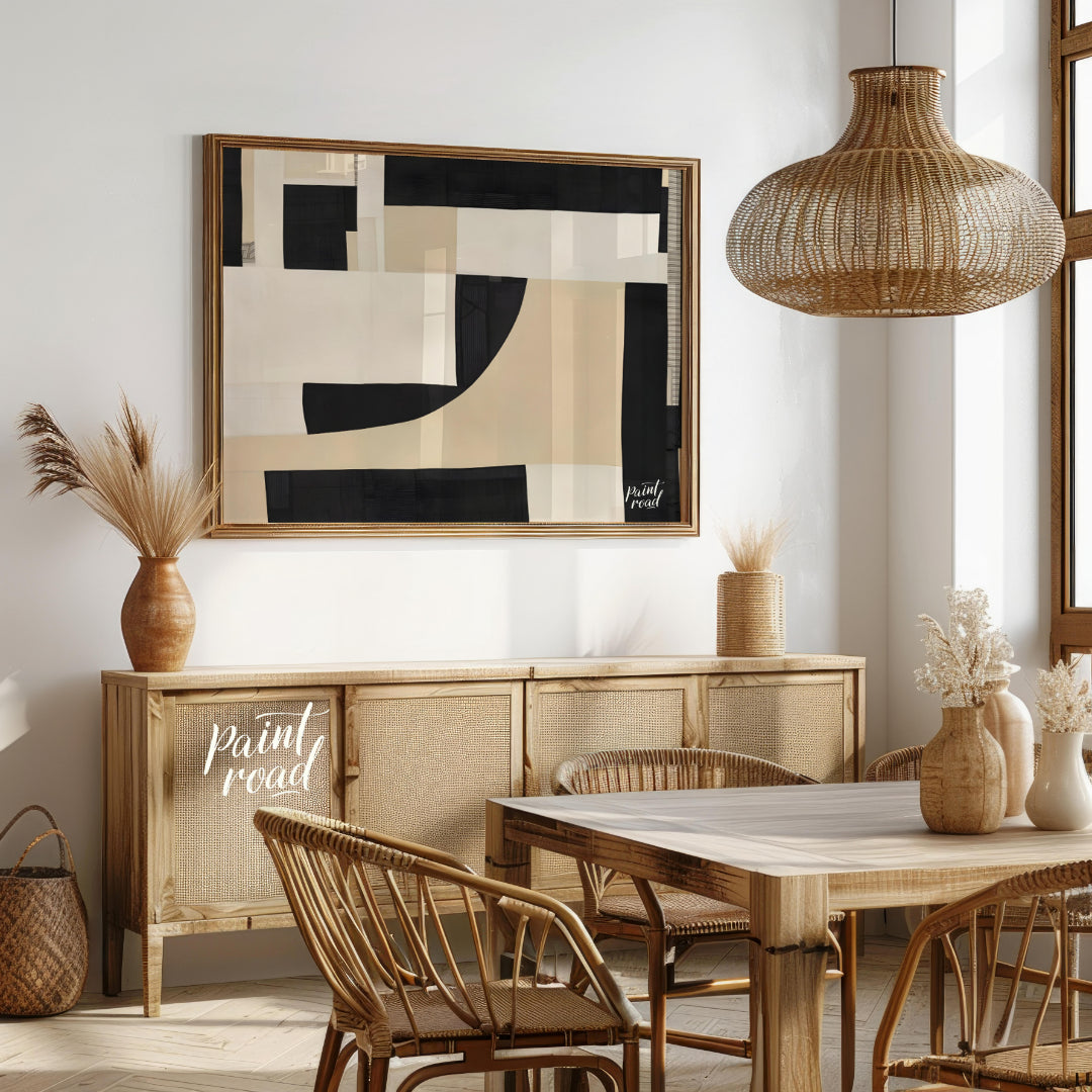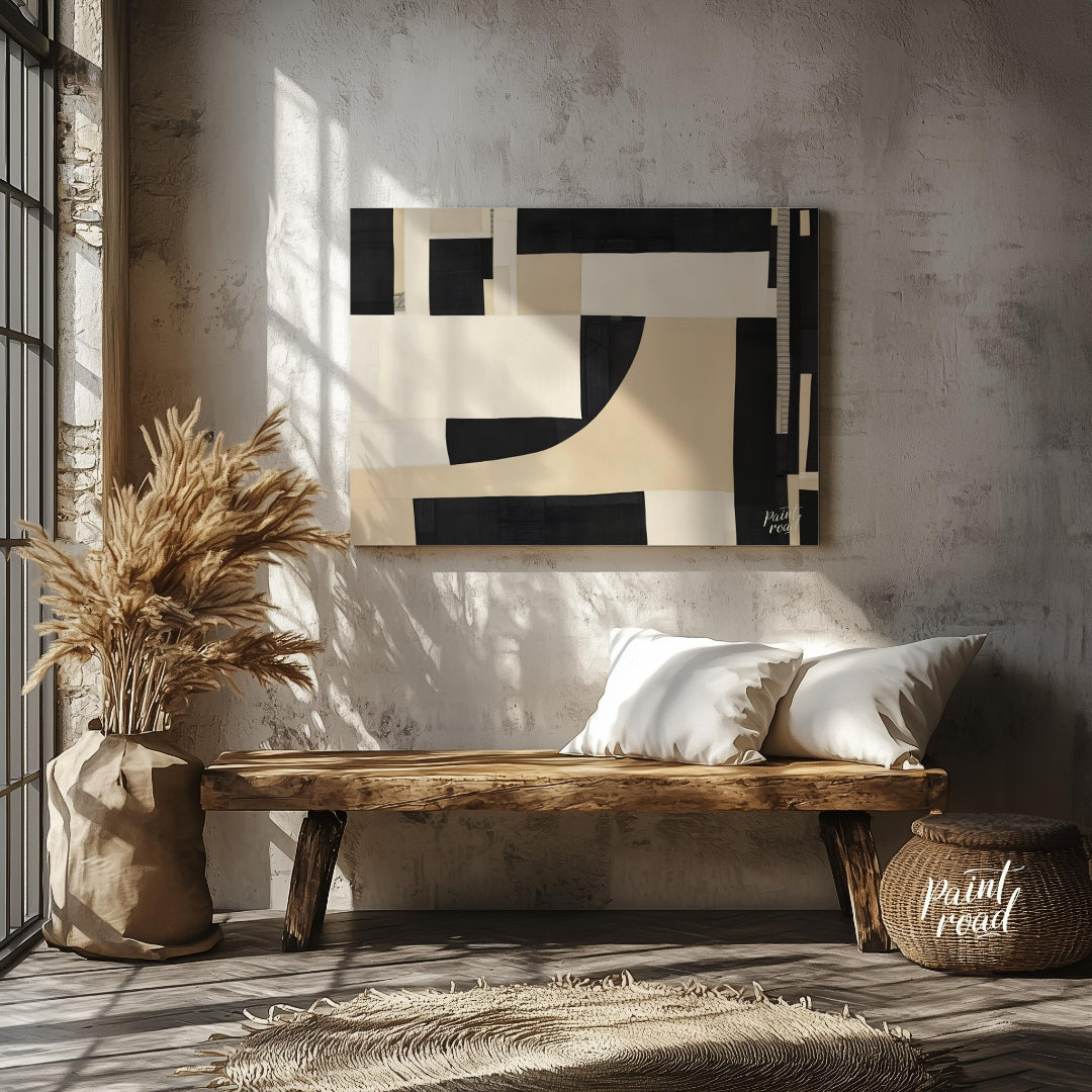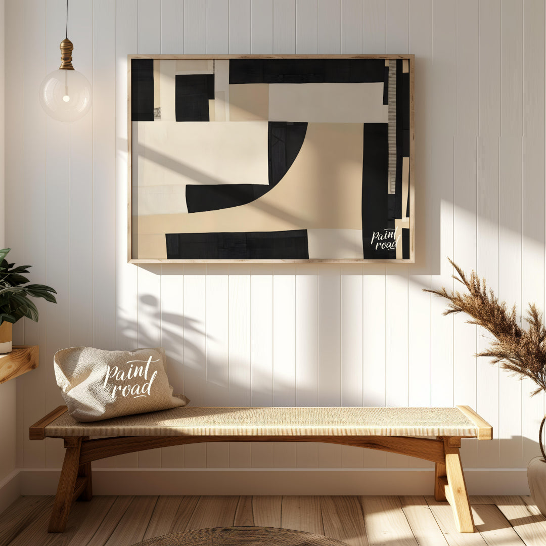 """Constructed Contrast"" presents a striking abstract composition featuring a collage-like arrangement of geometric shapes in black, white, and neutral tones. The artwork evokes a sense of architectural construction and layered design. The interplay of solid forms and subtle textures creates depth and visual intrigue. The precise arrangement and stark contrasts suggest a modern, minimalist aesthetic. This piece balances a sense of structured order with the intrigue of fragmented forms, inviting the viewer to explore its intricate patterns and spatial relationships."