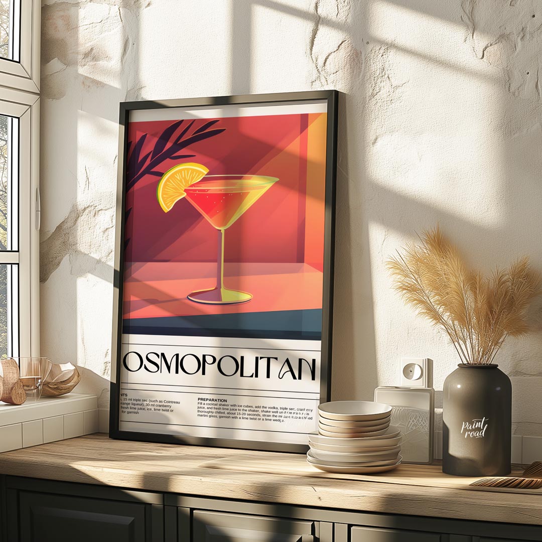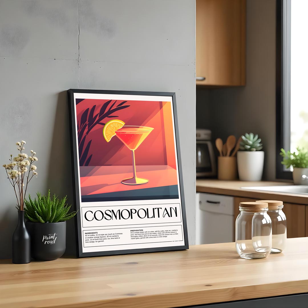 This elegant and eye-catching poster features a vibrant illustration of a Cosmopolitan cocktail, artfully presented in its signature martini glass. The drink's iconic reddish-pink hue is perfectly complemented by a bright yellow lime wedge perched on the rim, adding a pop of fresh citrus. The background is composed of a sophisticated blend of warm orange and deep red tones, enhanced by subtle outlines of foliage, creating a chic and inviting ambiance perfect for a stylish gathering. The bold, dark typography of "COSMOPOLITAN" below the artwork clearly identifies the classic cocktail. The lower portion of the poster offers precise "INGREDIENTS" and "PREPARATION" instructions, including quantities for "45 ml vodka," "15 ml triple sec," "30 ml cranberry juice," and "15 ml fresh lime juice," along with shaking and chilling guidance. This print is perfect for a stylish living room, a chic dining area, a sophisticated bar space, or a master bedroom, adding both a touch of glamour and a practical guide for cocktail connoisseurs.