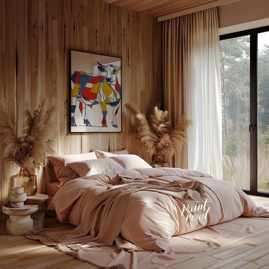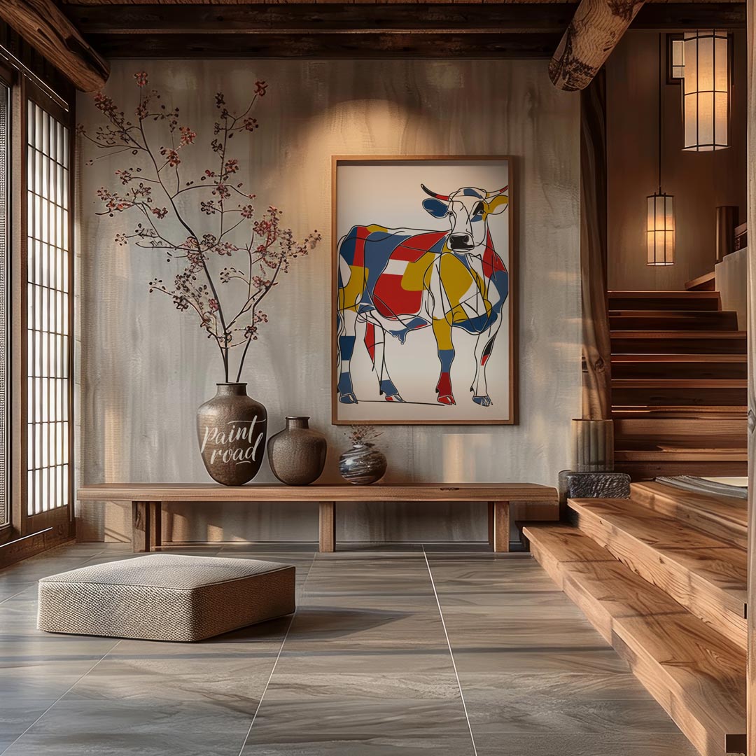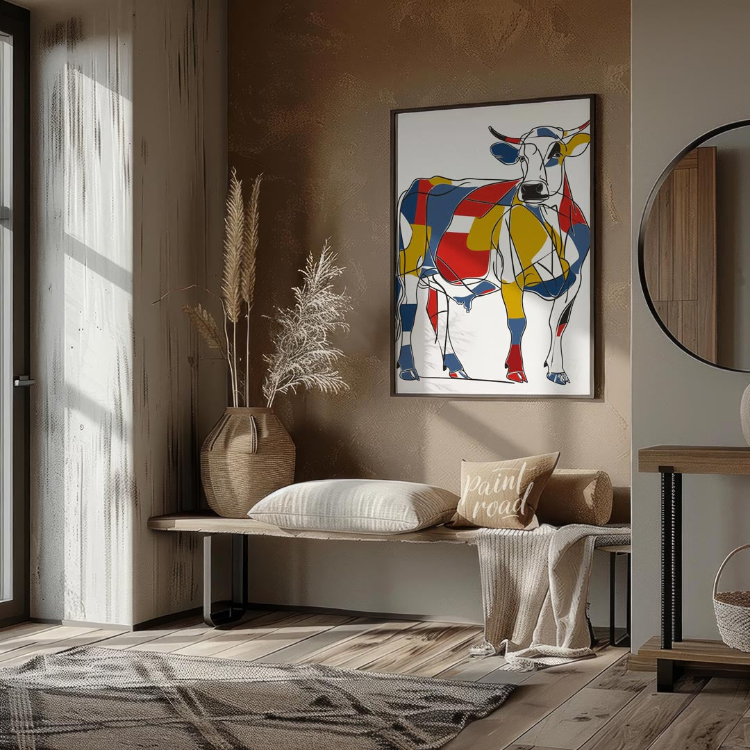 This striking artwork reimagines a cow through the lens of Cubism, featuring a bold and abstract composition. The animal's form is fragmented into geometric shapes, filled with a vibrant palette of primary red, deep blue, and bright yellow, interspersed with stark white. Black outlines define the contours and divisions, creating a dynamic and modern aesthetic. Unlike traditional depictions, this piece emphasizes form and color over realistic representation, giving the cow a playful yet sophisticated presence. It's a contemporary take on animal art, perfect for those who appreciate abstract and modern art styles. The strong lines and distinct color blocks give it a graphic quality that can anchor a space and provide a focal point. This piece would especially appeal to art lovers, farm animal enthusiasts with a modern twist, or anyone looking to inject a burst of color and unique design into their home or office.