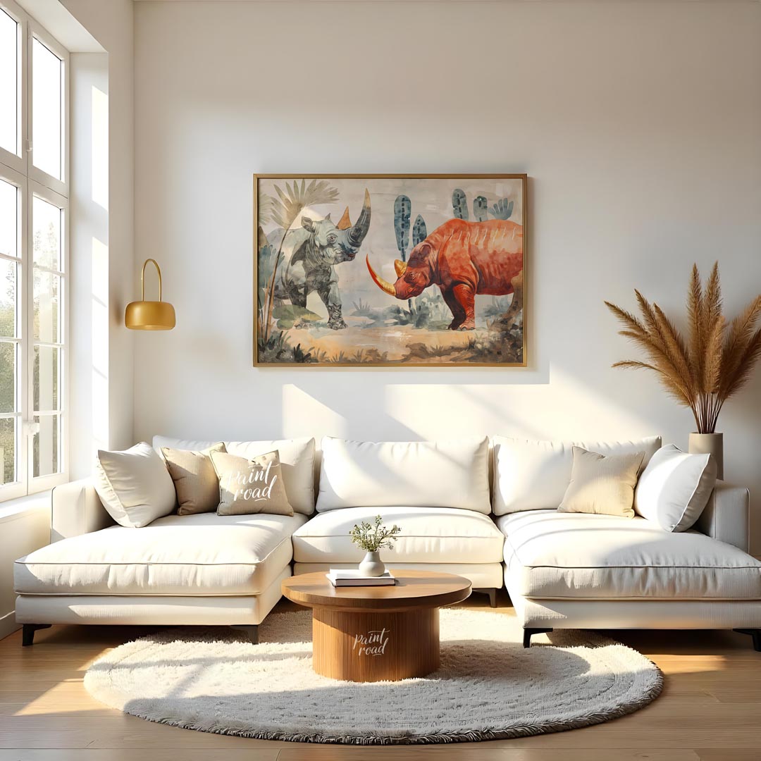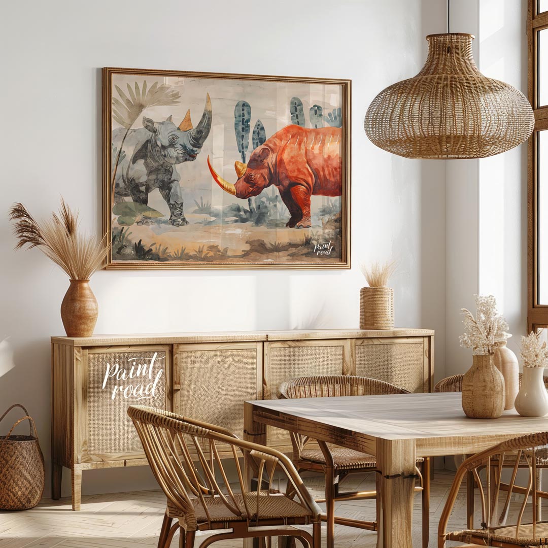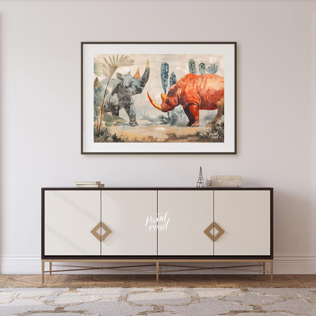 This compelling artwork depicts two rhinoceroses in a stylized, watercolor-like setting, facing each other with a powerful presence. One rhino is rendered in cool tones of grey and blue, while the other is a striking burnt orange, both featuring prominent, slightly elongated horns in shades of yellow and orange. The background suggests a natural habitat with muted green and grey foliage, including large, stylized palm-like leaves and cactus-like forms, all painted with a soft, diffused quality. The ground is a blend of earthy browns and blues, giving a sense of arid landscape. The distinct color choices for each rhino create a dramatic contrast, highlighting their imposing forms. This piece combines artistic interpretation with the raw power of wildlife, making it a strong statement piece for a variety of spaces.