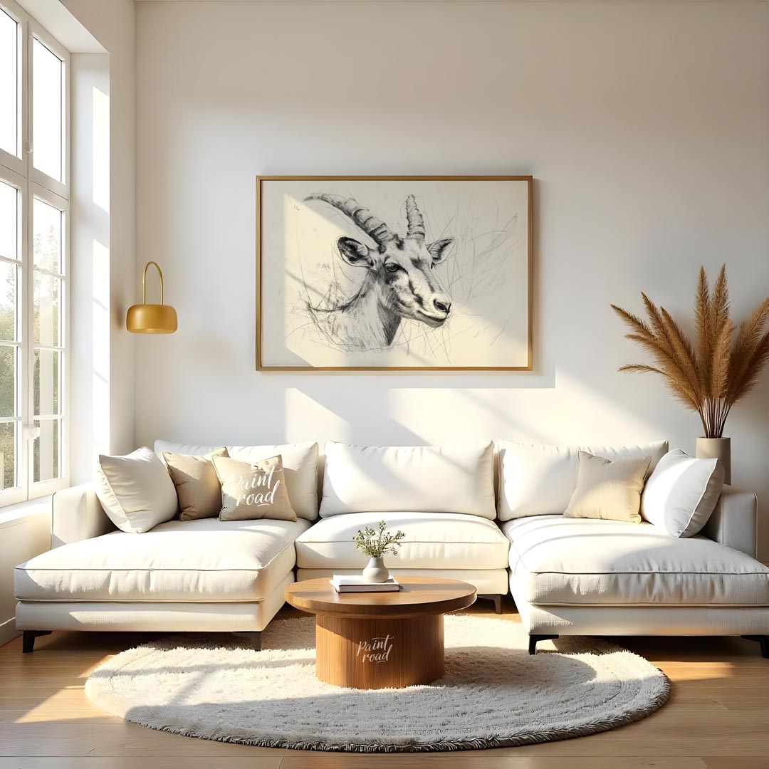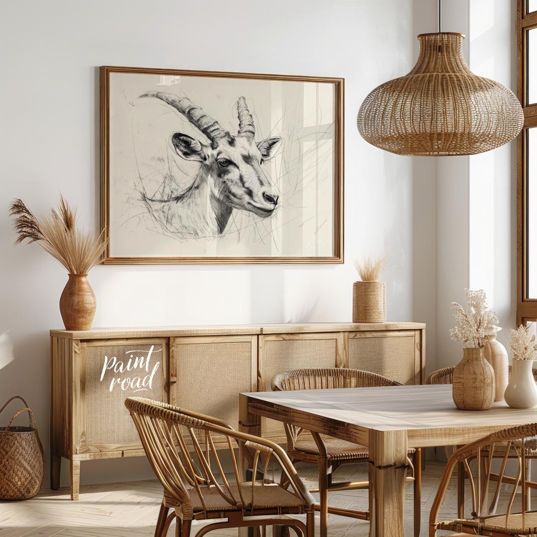 This elegant pencil sketch captures the profile of an antelope, focusing on its distinctive head and spiraling horns. The antelope's face is rendered with meticulous detail, showing the texture of its fur, the alertness in its eye, and the subtle contours of its muzzle. The horns are a prominent feature, depicted with their characteristic ridges and graceful curve. Loose, gestural lines around the animal suggest a natural, wild environment without being fully defined, drawing attention to the subject itself. The monochrome palette allows for a focus on form, light, and shadow, highlighting the inherent beauty and grace of this magnificent creature. It's a sophisticated piece that blends realistic detail with artistic looseness.