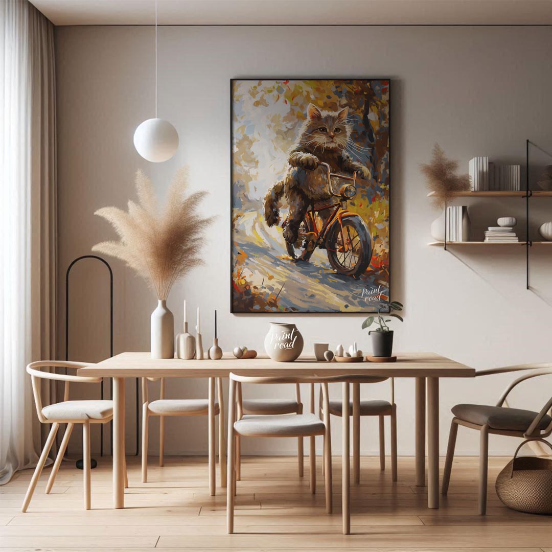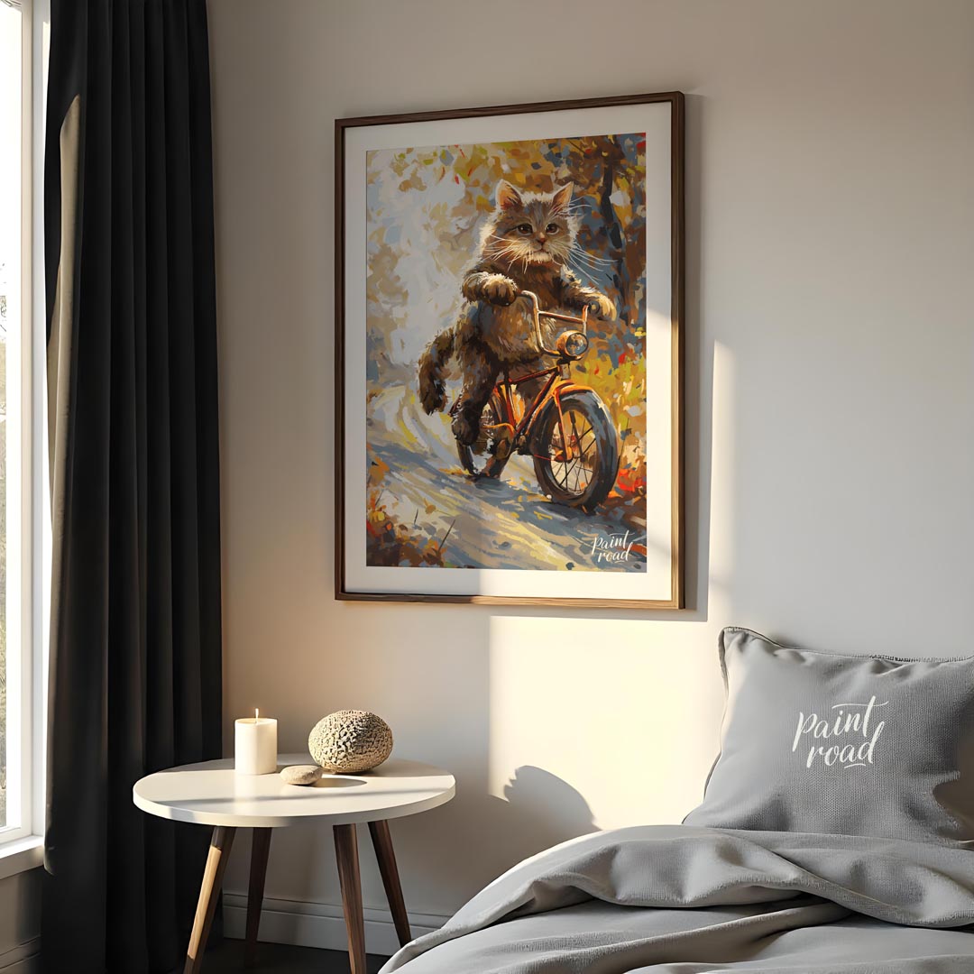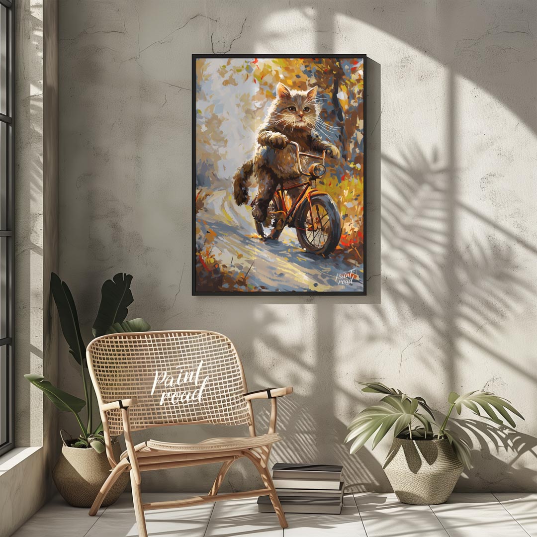 This whimsical digital painting depicts a fluffy brown cat, with vibrant green eyes and prominent whiskers, confidently riding an orange bicycle down a sun-dappled, autumn-colored path. The artistic style uses broad, visible brushstrokes and a rich color palette of browns, oranges, yellows, and hints of blue, creating a painterly effect. The background suggests a natural setting with trees and foliage, bathed in warm light, giving the impression of a pleasant, breezy day. The cat appears to be in motion, with its paws on the handlebars, adding a playful and anthropomorphic touch to the scene. This artwork evokes feelings of joy, adventure, and the beauty of nature.