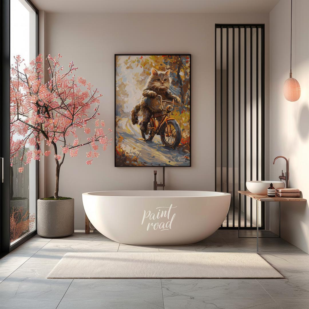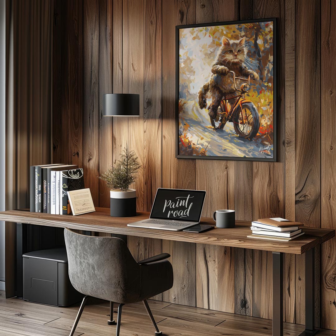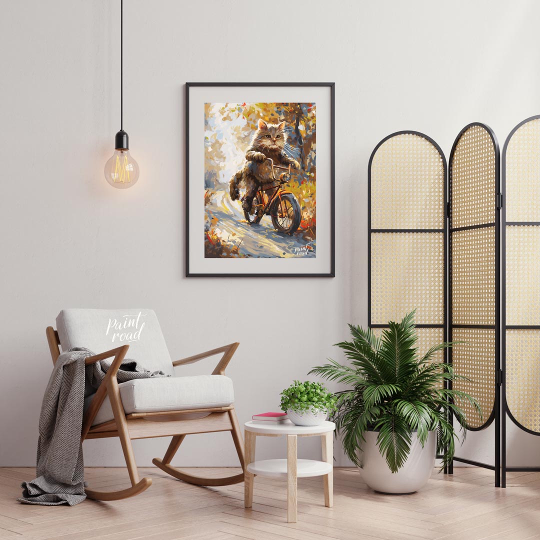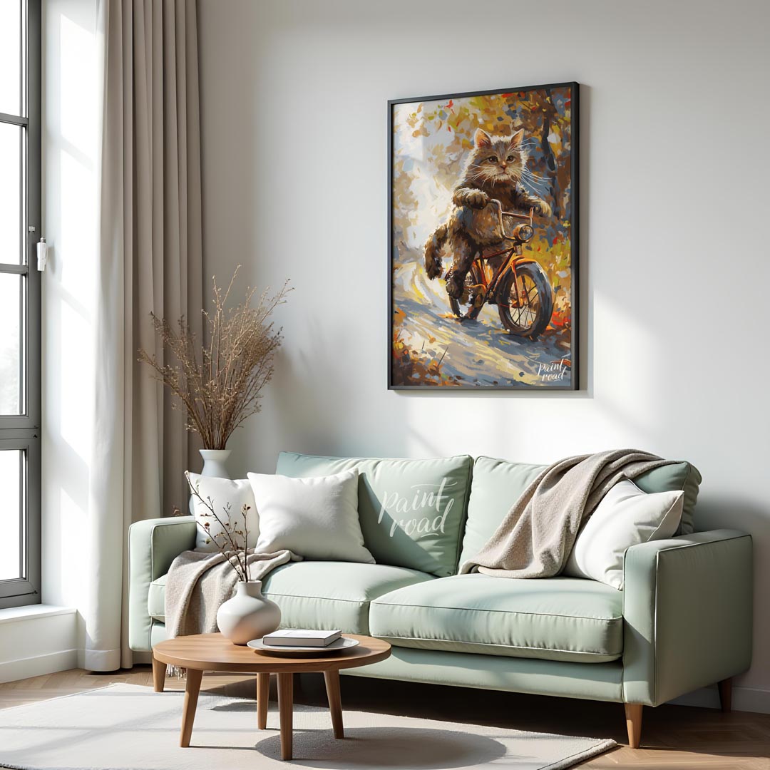 This whimsical digital painting depicts a fluffy brown cat, with vibrant green eyes and prominent whiskers, confidently riding an orange bicycle down a sun-dappled, autumn-colored path. The artistic style uses broad, visible brushstrokes and a rich color palette of browns, oranges, yellows, and hints of blue, creating a painterly effect. The background suggests a natural setting with trees and foliage, bathed in warm light, giving the impression of a pleasant, breezy day. The cat appears to be in motion, with its paws on the handlebars, adding a playful and anthropomorphic touch to the scene. This artwork evokes feelings of joy, adventure, and the beauty of nature.