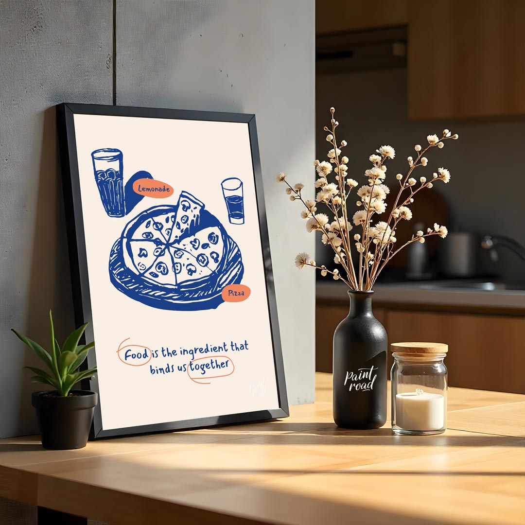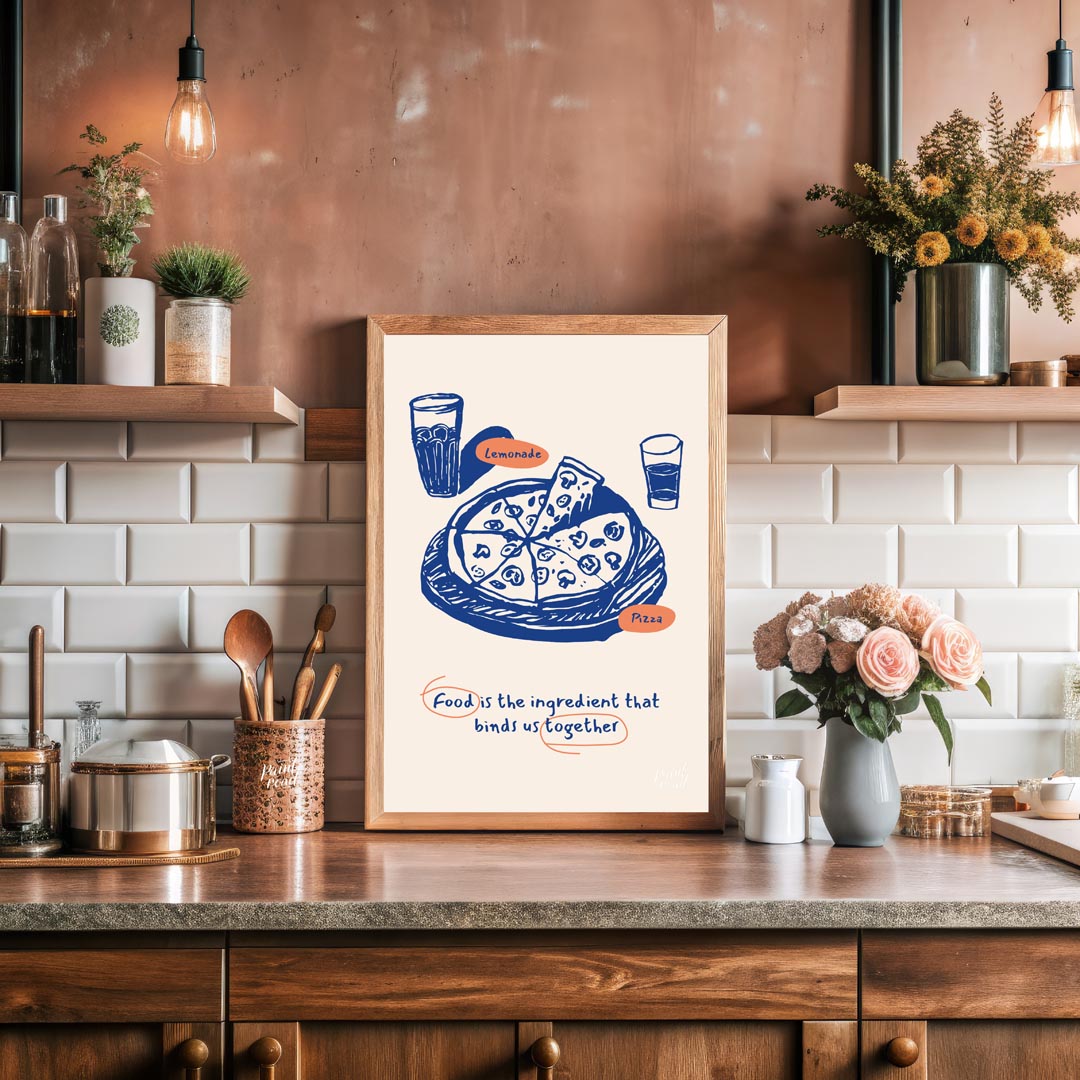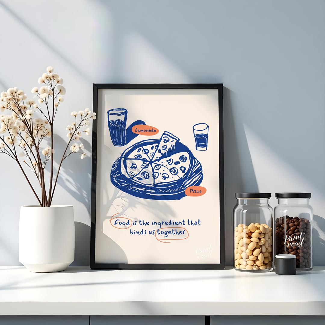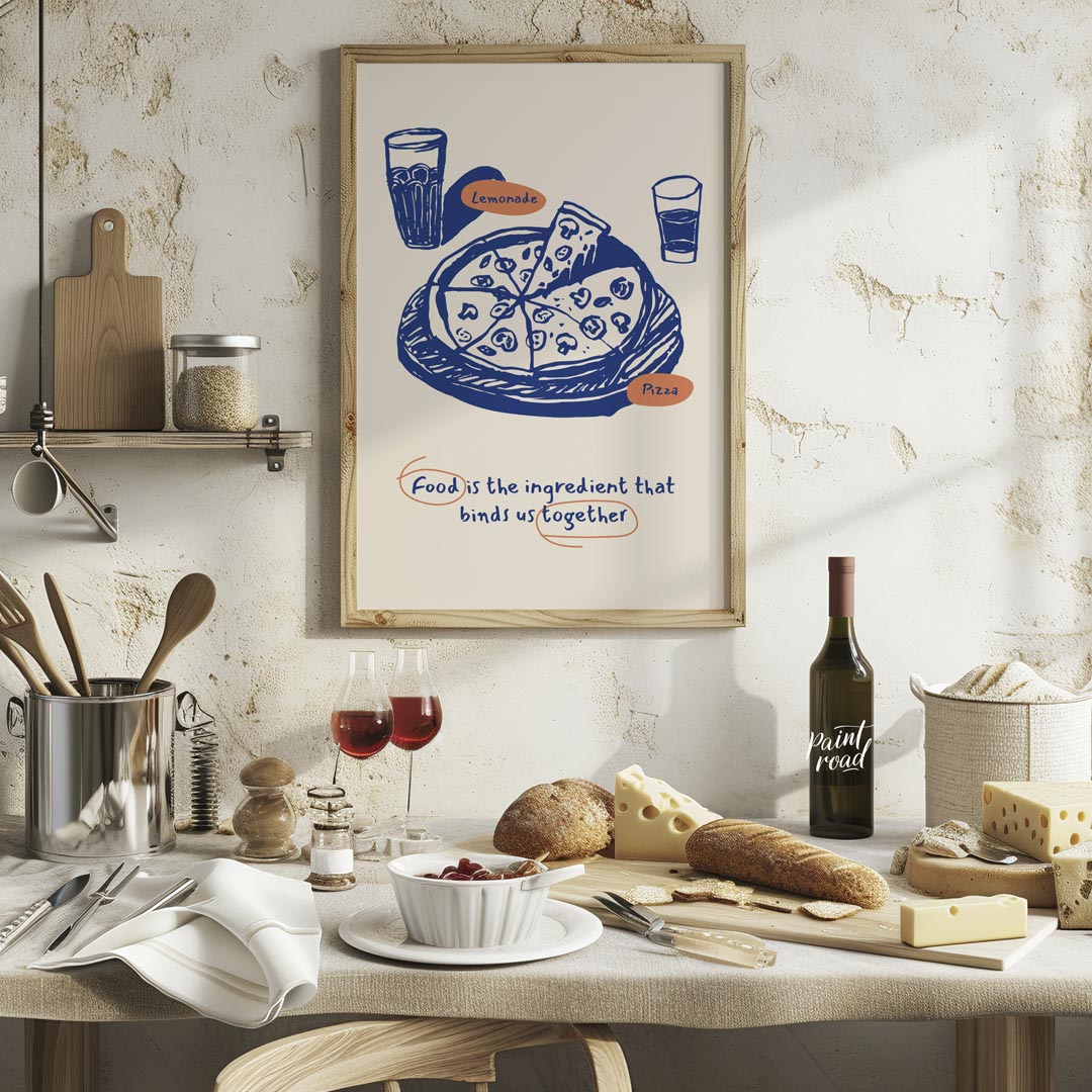 This heartwarming poster captures the essence of shared meals and togetherness through its charming line art illustration. The central focus is a delicious-looking pizza, with a slice being lifted, surrounded by two glasses of lemonade (one full, one partially empty), all rendered in a deep blue against a light, neutral background. Orange ovals label "Lemonade" and "Pizza," making the elements clear. Below the illustration, the profound phrase "Food is the ingredient that binds us together" is written in a friendly, handwritten font, with "Food" and "together" encircled in orange, highlighting the powerful connection food fosters. This poster is perfect for a kitchen, dining room, family room, or even a casual restaurant, celebrating the communal aspect of eating and the memories created around a shared table. It's a beautiful tribute to the role of food in relationships.