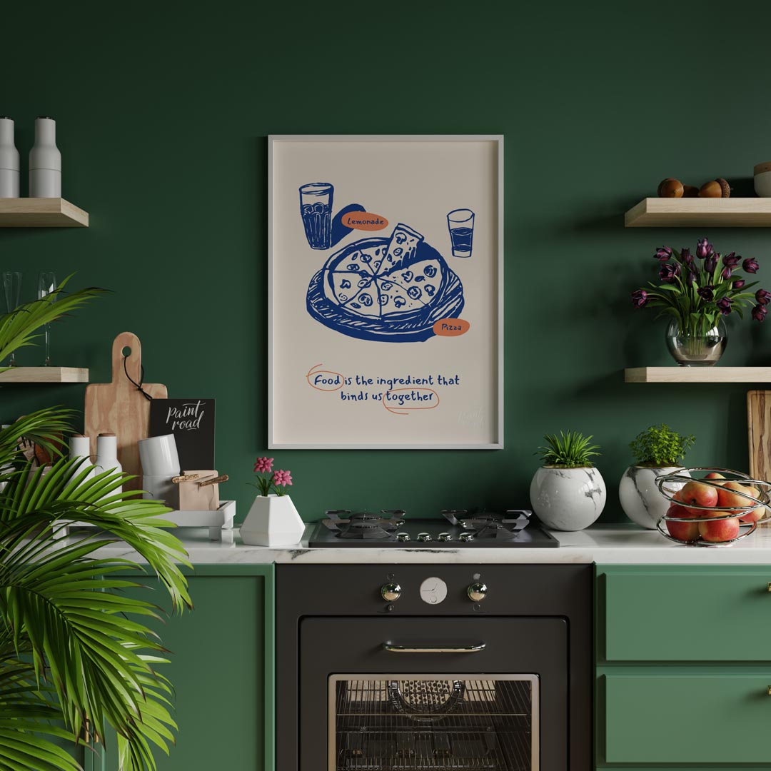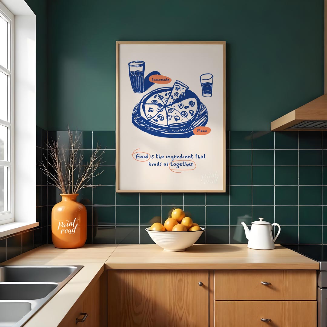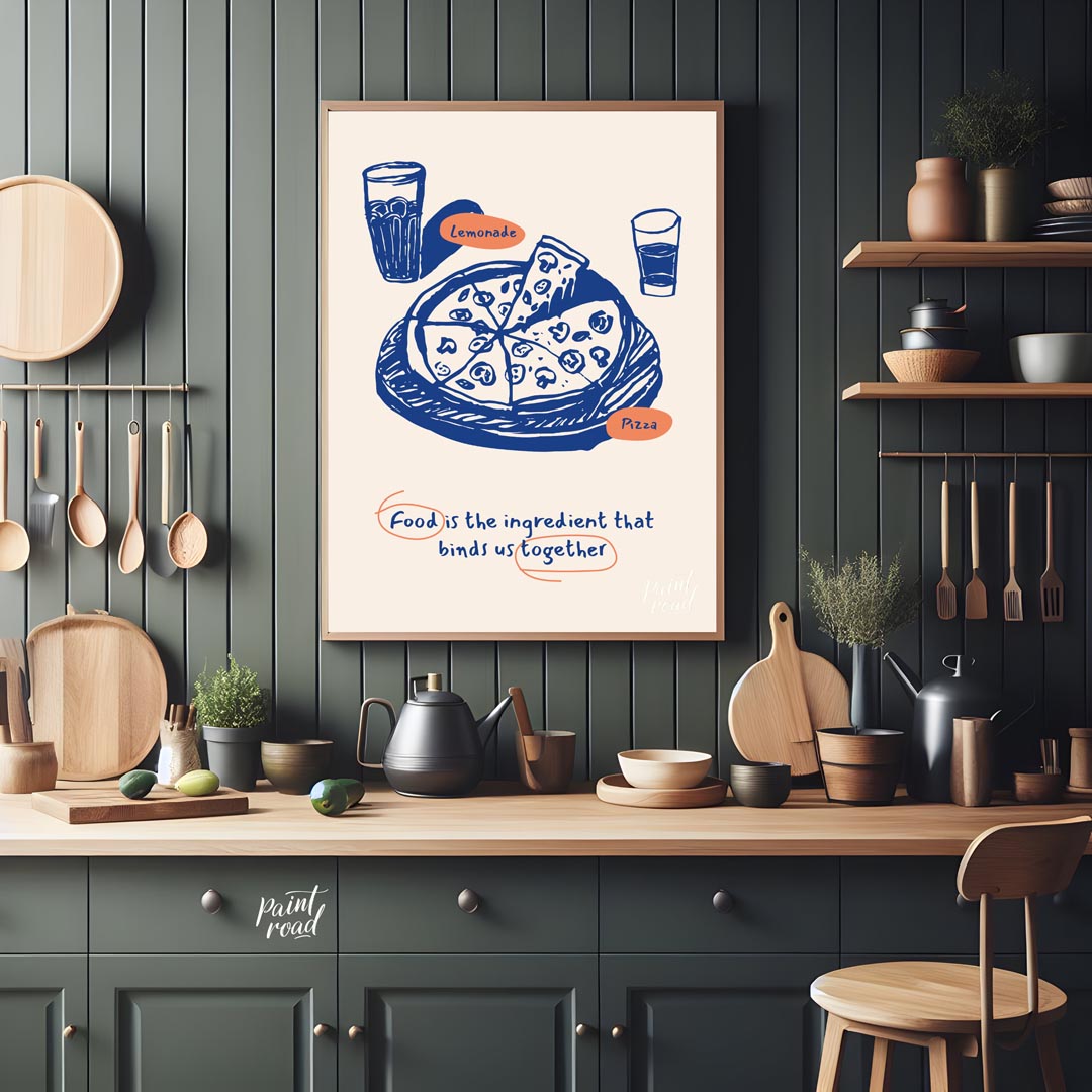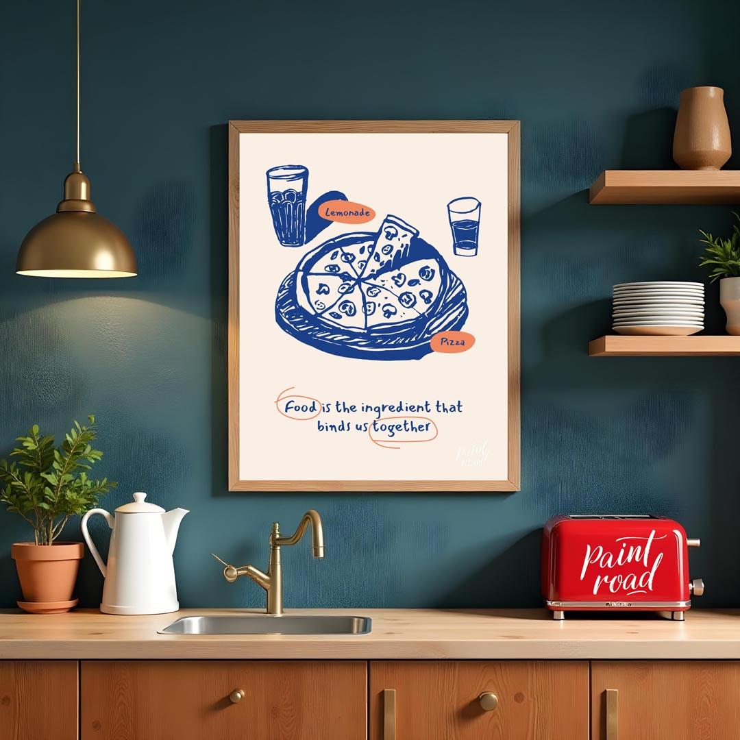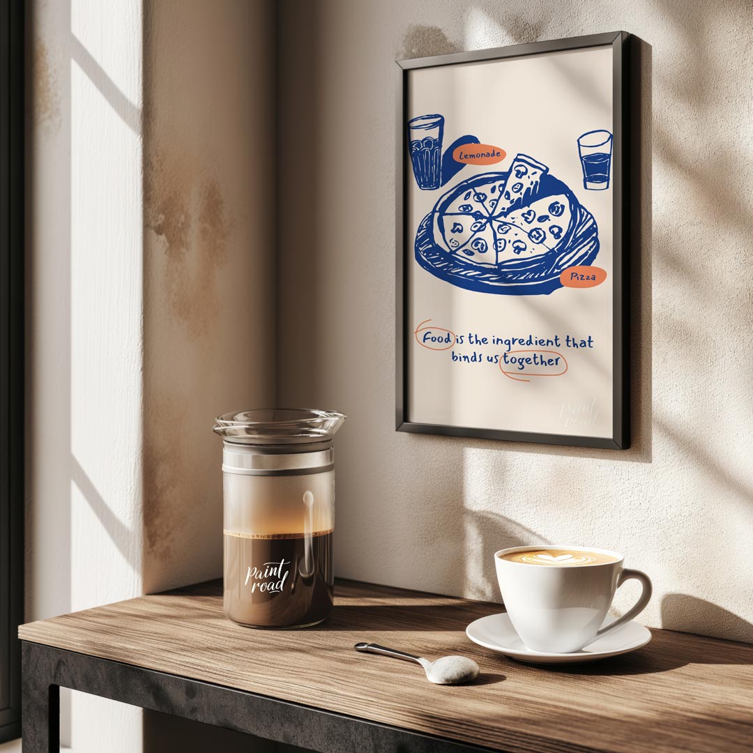 This heartwarming poster captures the essence of shared meals and togetherness through its charming line art illustration. The central focus is a delicious-looking pizza, with a slice being lifted, surrounded by two glasses of lemonade (one full, one partially empty), all rendered in a deep blue against a light, neutral background. Orange ovals label "Lemonade" and "Pizza," making the elements clear. Below the illustration, the profound phrase "Food is the ingredient that binds us together" is written in a friendly, handwritten font, with "Food" and "together" encircled in orange, highlighting the powerful connection food fosters. This poster is perfect for a kitchen, dining room, family room, or even a casual restaurant, celebrating the communal aspect of eating and the memories created around a shared table. It's a beautiful tribute to the role of food in relationships.