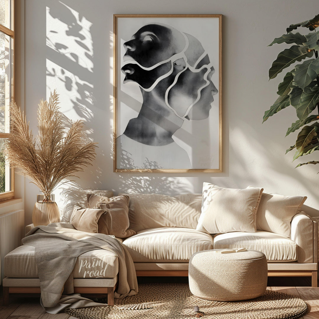"""Fragmented Self"" presents a striking portrait rendered in grayscale with a unique, segmented aesthetic. The subject's face is divided into distinct sections, creating a sense of deconstruction and multiplicity. The interplay of light and shadow, combined with the fragmented composition, evokes a feeling of introspection and psychological depth. The minimalist approach and stark contrasts enhance the dramatic effect. This piece balances a sense of realism with surreal abstraction, inviting the viewer to contemplate the complexities of identity and perception."
