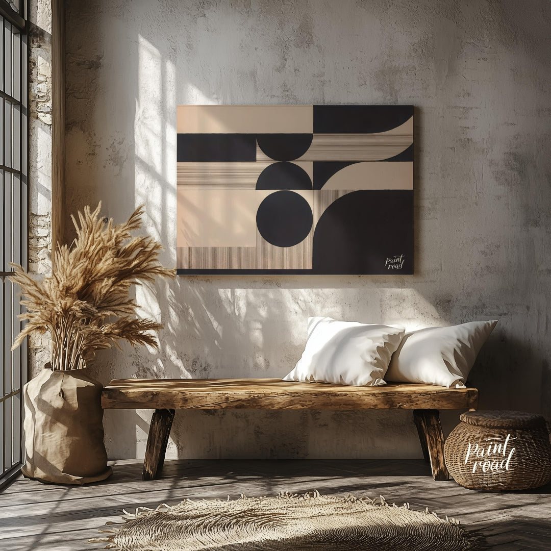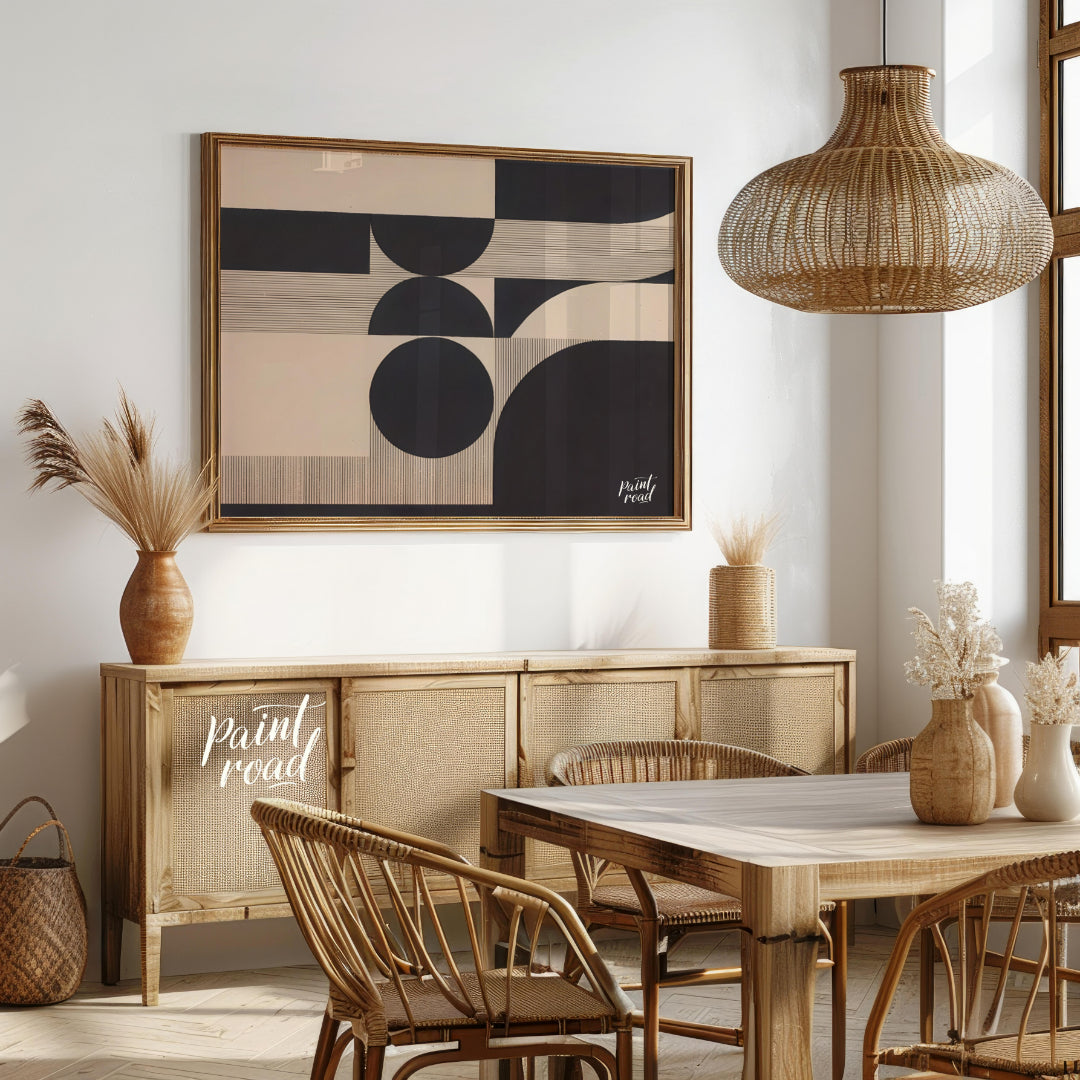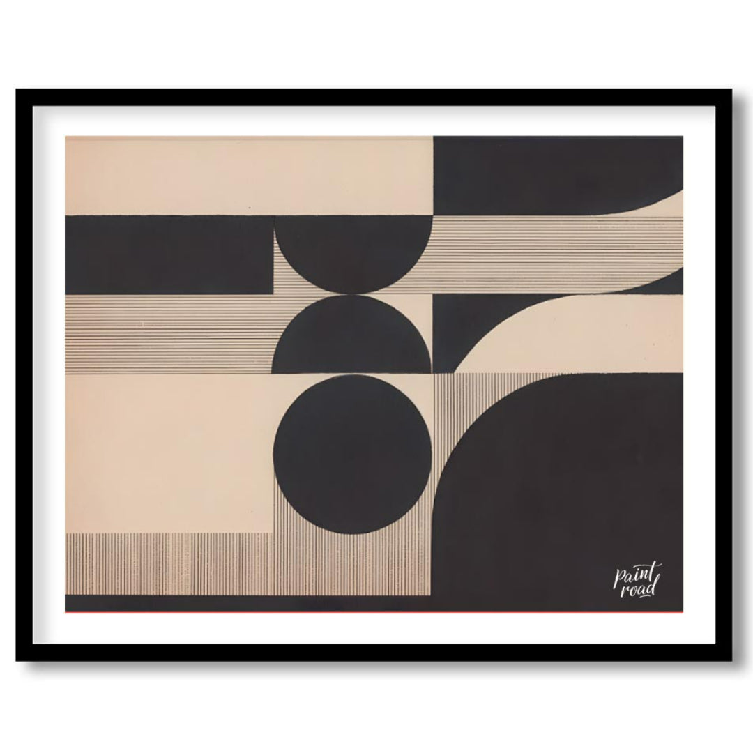 """Geometric Echoes"" presents a striking composition of abstract shapes and lines, creating a visually compelling interplay of forms. The artwork features a balance of solid black shapes, semi-circles, and linear patterns against a light, neutral background. The precise arrangement and stark contrasts evoke a sense of structured elegance and modern design. The subtle variations in line density and shape orientation add depth and a dynamic quality to the overall composition. This piece is a testament to the power of geometric abstraction in creating visually engaging and thought-provoking art."