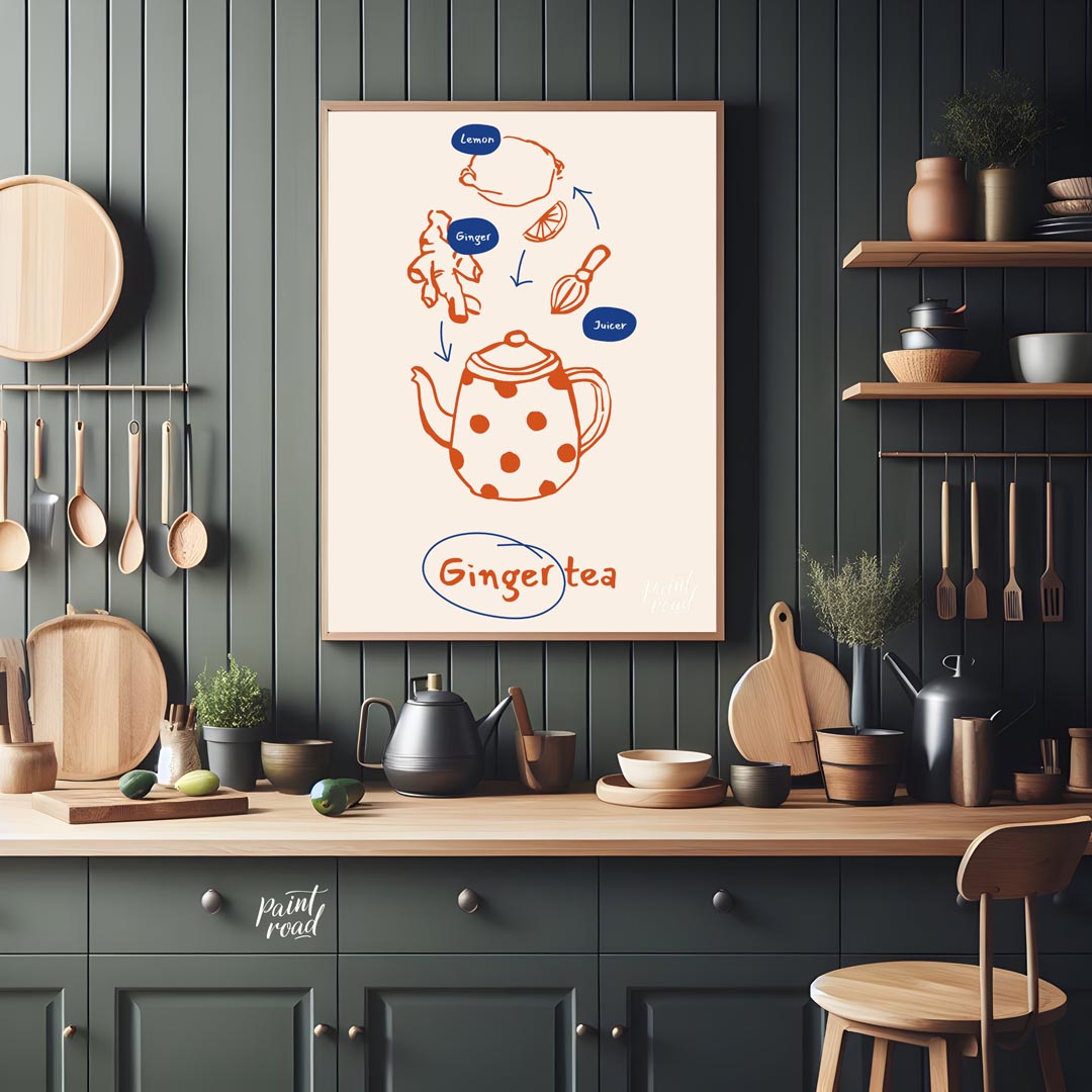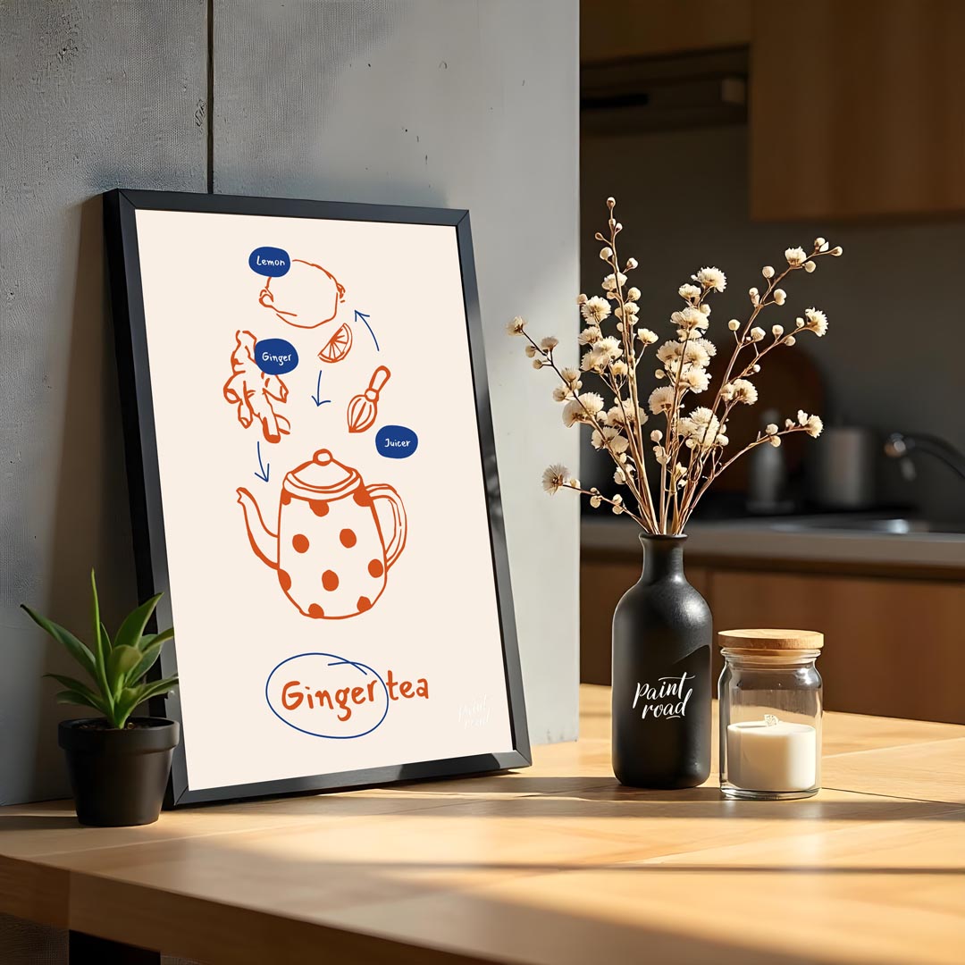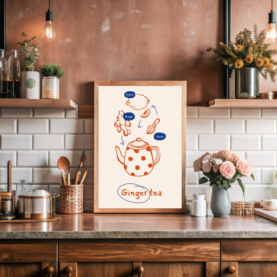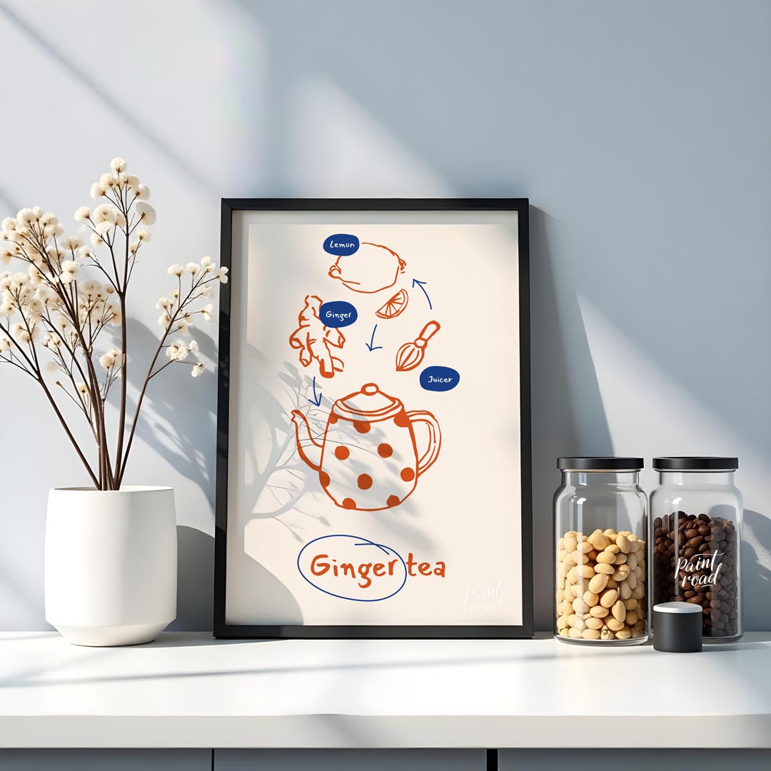 This informative and visually appealing poster illustrates the simple process of making ginger tea. The design uses a warm orange line art for the ingredients and tools, set against a light, neutral background. Arrows guide the eye from a lemon, ginger root, and a juicer down to a charming, polka-dotted teapot, signifying the preparation steps. Small blue ovals label "Lemon," "Ginger," and "Juicer," providing clarity. At the bottom, "Ginger tea" is written in a handwritten style, encircled in blue, clearly stating the delicious end product. This poster is ideal for anyone interested in natural remedies, healthy beverages, or simply enjoys the comforting taste of ginger tea. It would fit perfectly in a kitchen, a cozy living room nook, or even a home office, inspiring warmth and well-being.