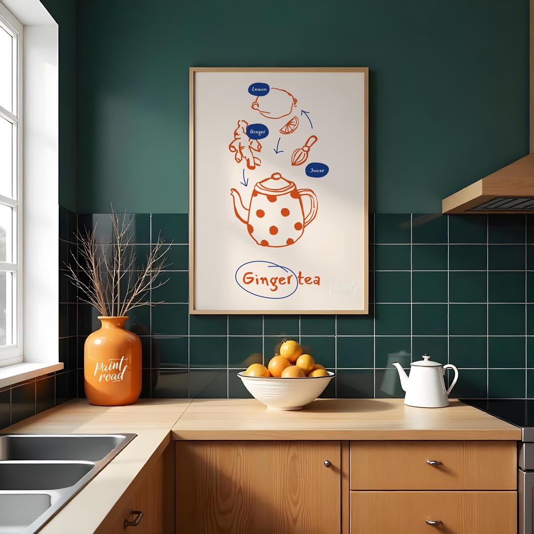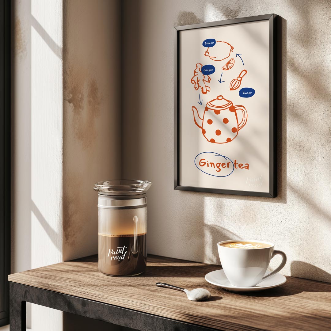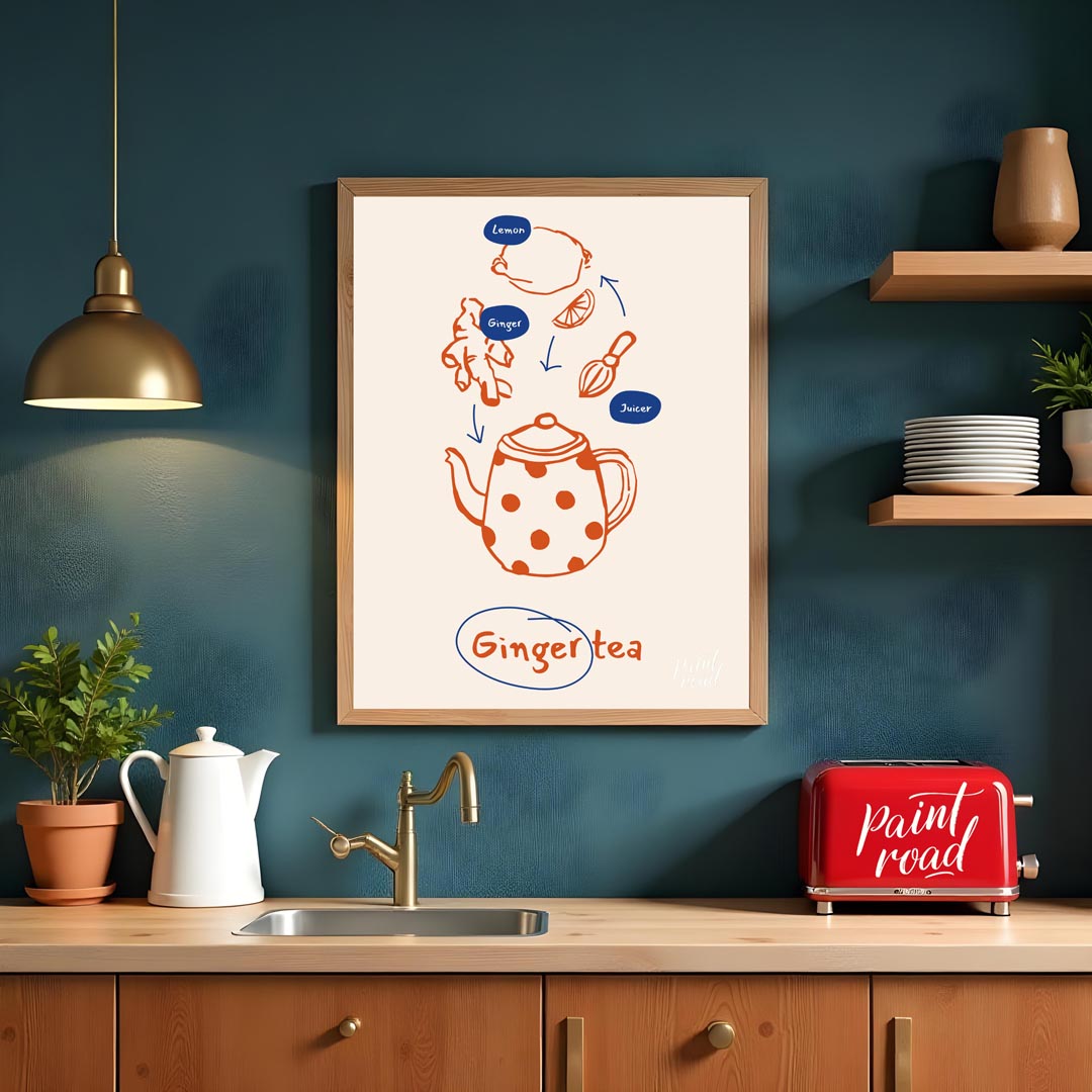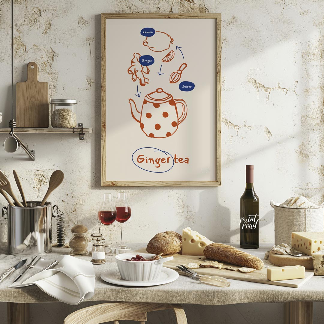 This informative and visually appealing poster illustrates the simple process of making ginger tea. The design uses a warm orange line art for the ingredients and tools, set against a light, neutral background. Arrows guide the eye from a lemon, ginger root, and a juicer down to a charming, polka-dotted teapot, signifying the preparation steps. Small blue ovals label "Lemon," "Ginger," and "Juicer," providing clarity. At the bottom, "Ginger tea" is written in a handwritten style, encircled in blue, clearly stating the delicious end product. This poster is ideal for anyone interested in natural remedies, healthy beverages, or simply enjoys the comforting taste of ginger tea. It would fit perfectly in a kitchen, a cozy living room nook, or even a home office, inspiring warmth and well-being.