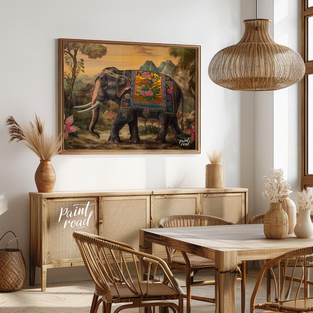 This opulent artwork showcases a gracefully striding elephant, magnificently adorned with a golden and floral embroidered blanket, set against a warm, sun-drenched landscape. The elephant's dark, textured skin is beautifully contrasted by the rich, lustrous gold of its caparison, which is further embellished with large, vibrant pink and teal floral patterns. Delicate tassels and ornaments add to its regal appearance. The background features soft, undulating mountains under a gentle, glowing sky, complemented by graceful trees and exotic pink flowers in the foreground, enhancing the natural splendor of the scene. The overall impression is one of timeless elegance and exotic luxury, reminiscent of historical royal processions. This piece is ideal for adding a touch of grandeur and sophisticated charm to a living space. It would particularly appeal to those who love traditional Indian artistry, rich colors, and the serene beauty of elephants.