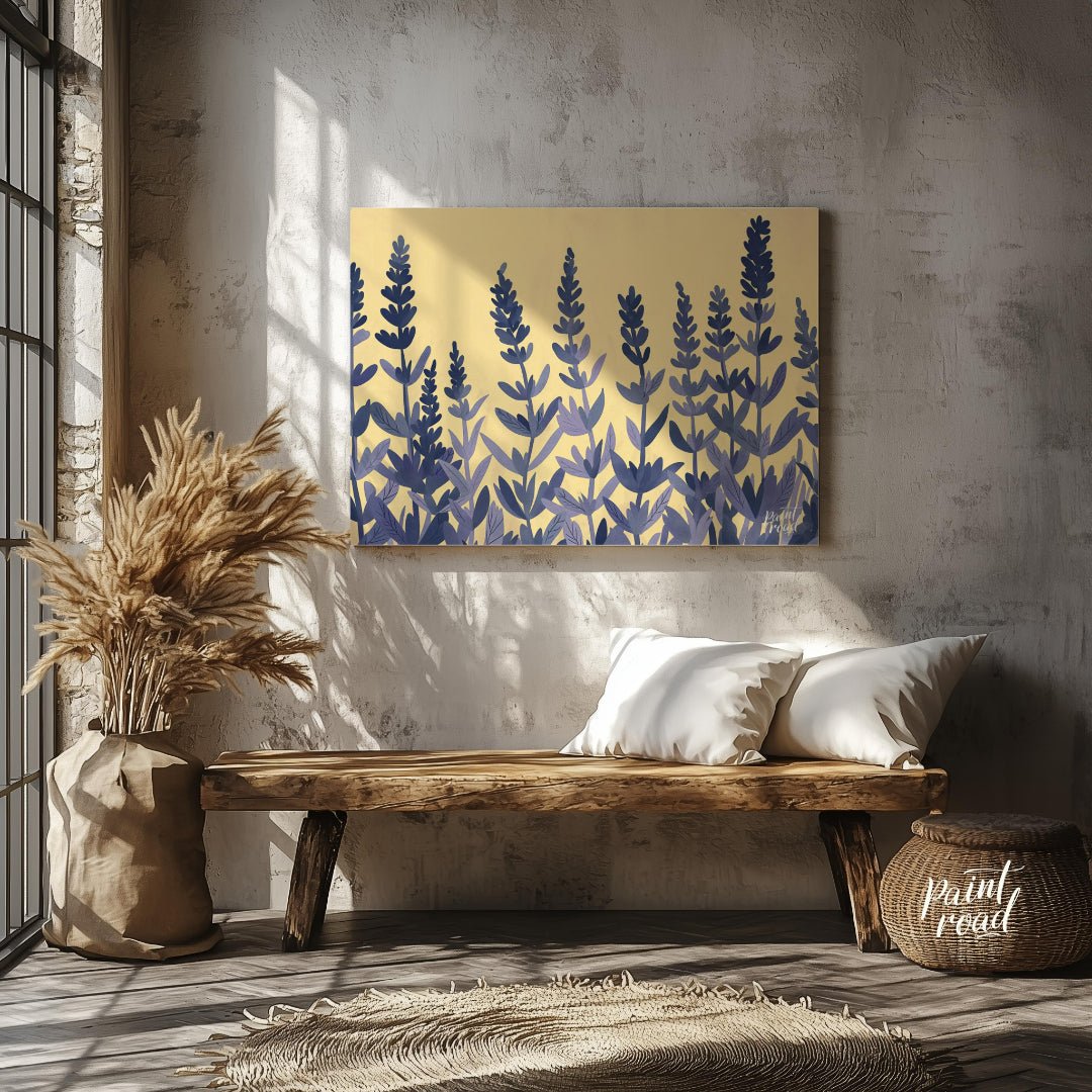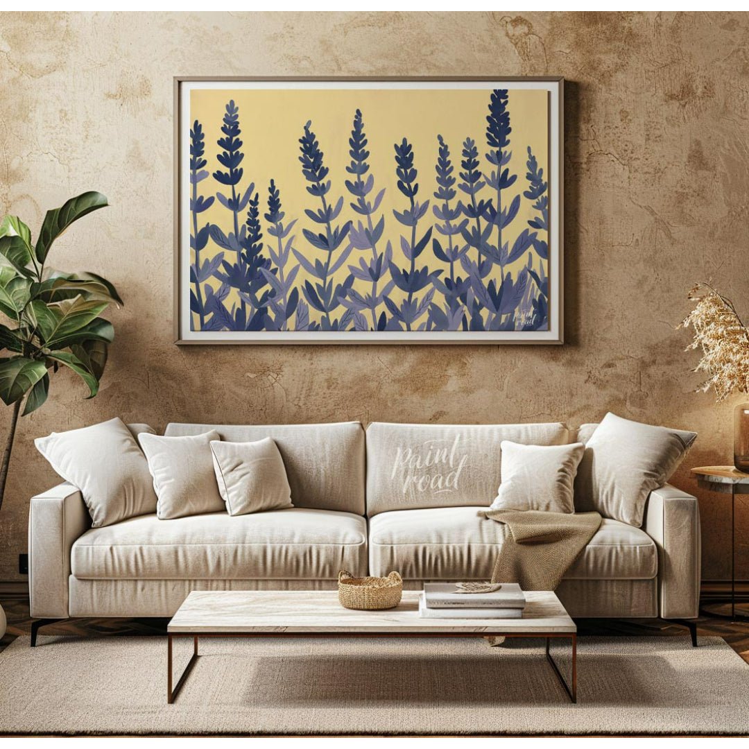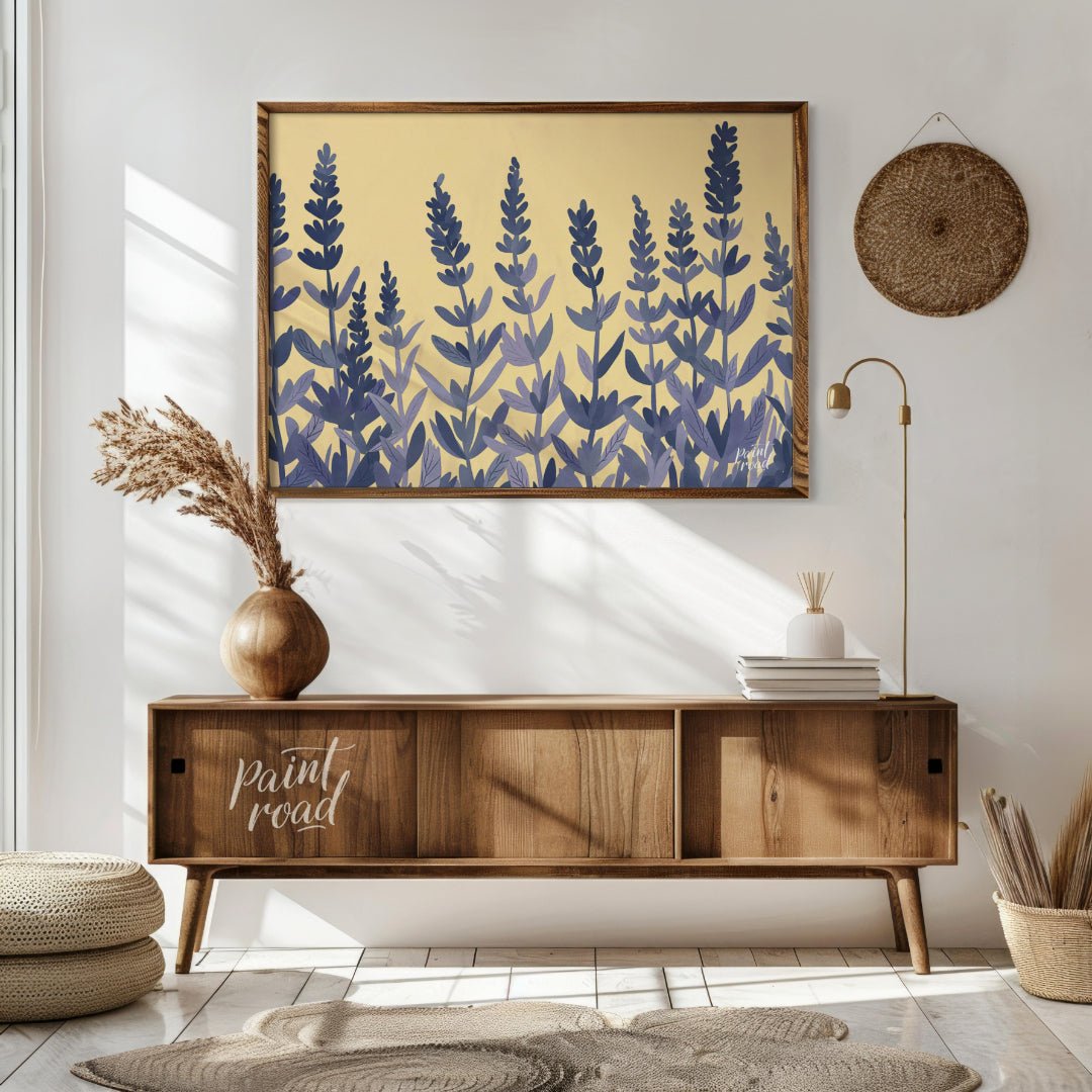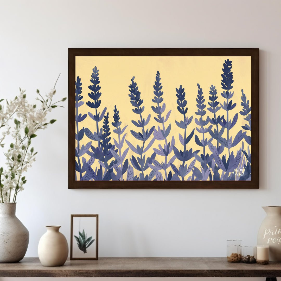 This charming digital illustration features stylized lavender sprigs in shades of deep blue and soft purple, set against a warm golden yellow background. The artist's use of flat colors and clean lines creates a modern and minimalist aesthetic. The repeating lavender motif and the warm hues evoke a sense of tranquility and natural beauty. Perfect for those who appreciate contemporary botanical patterns and minimalist designs.