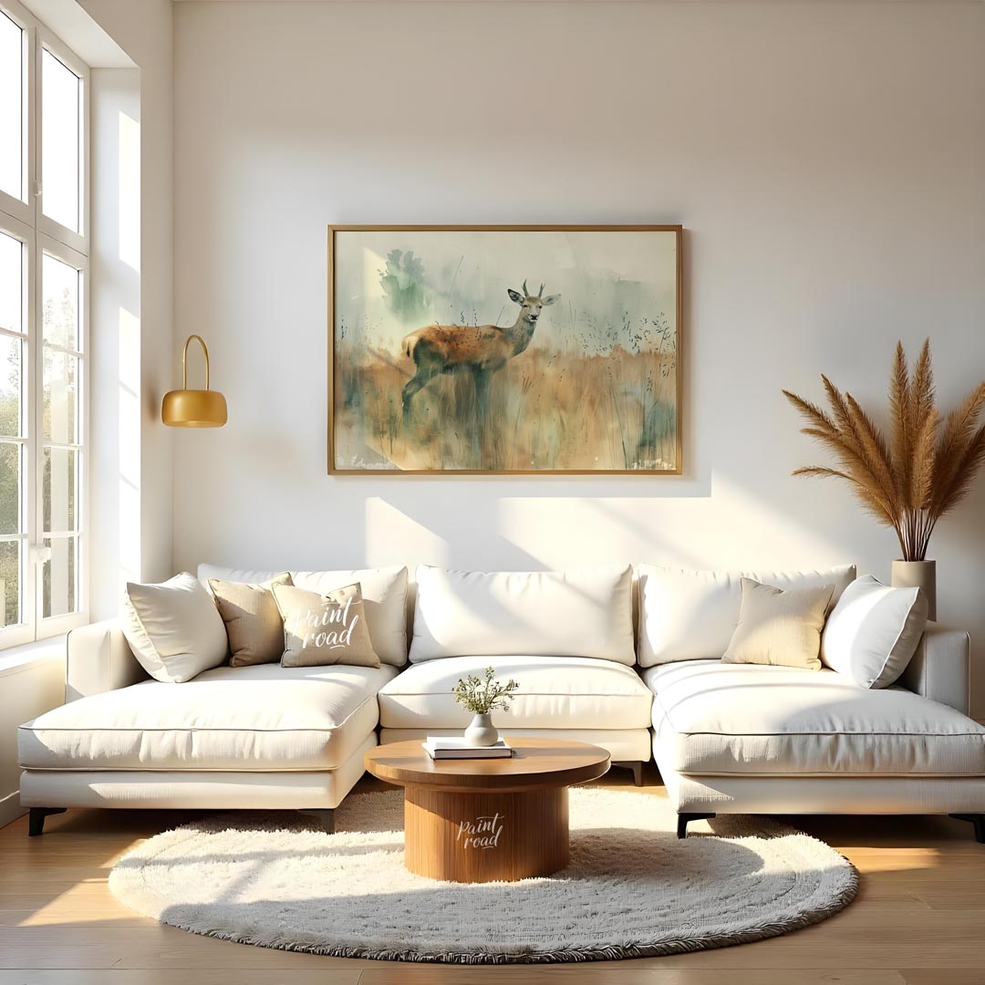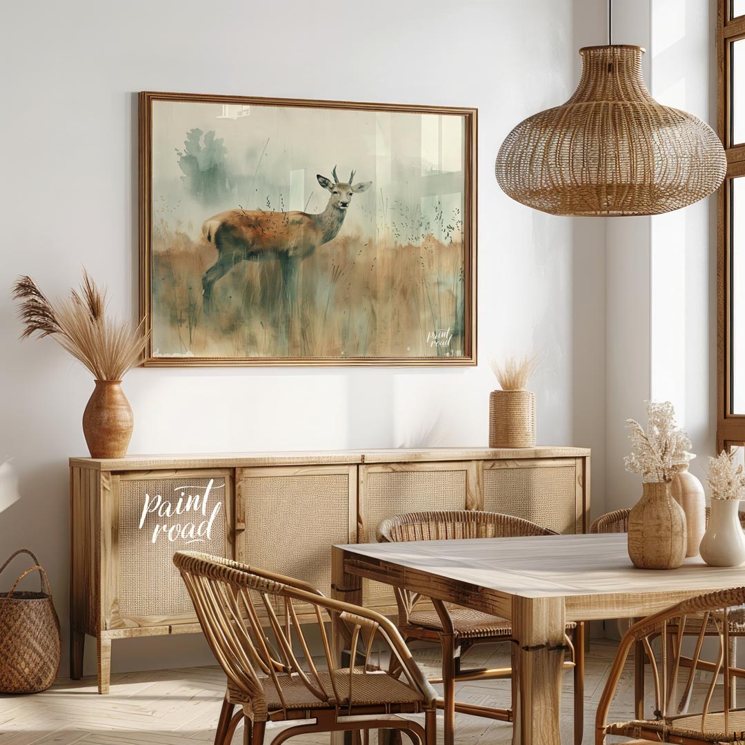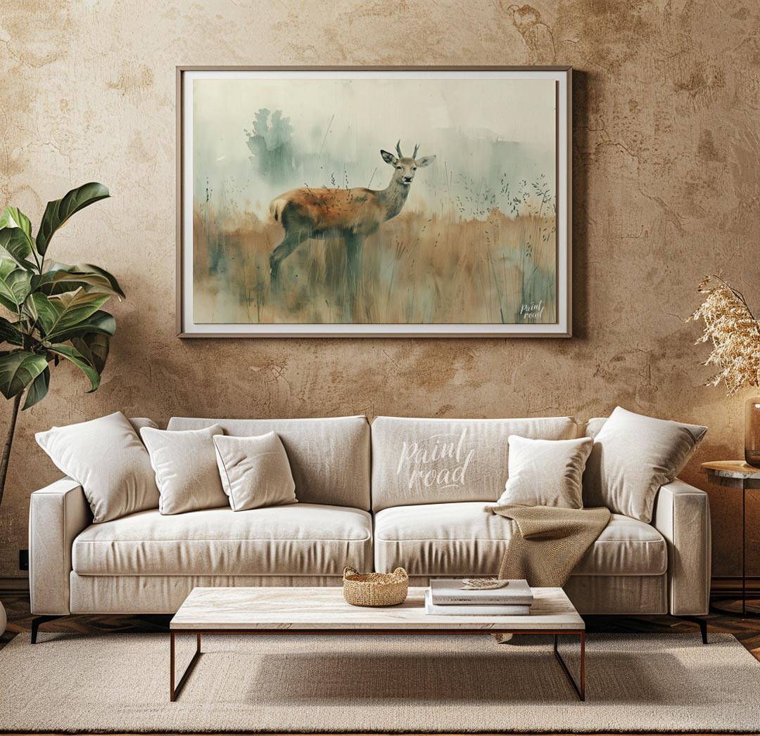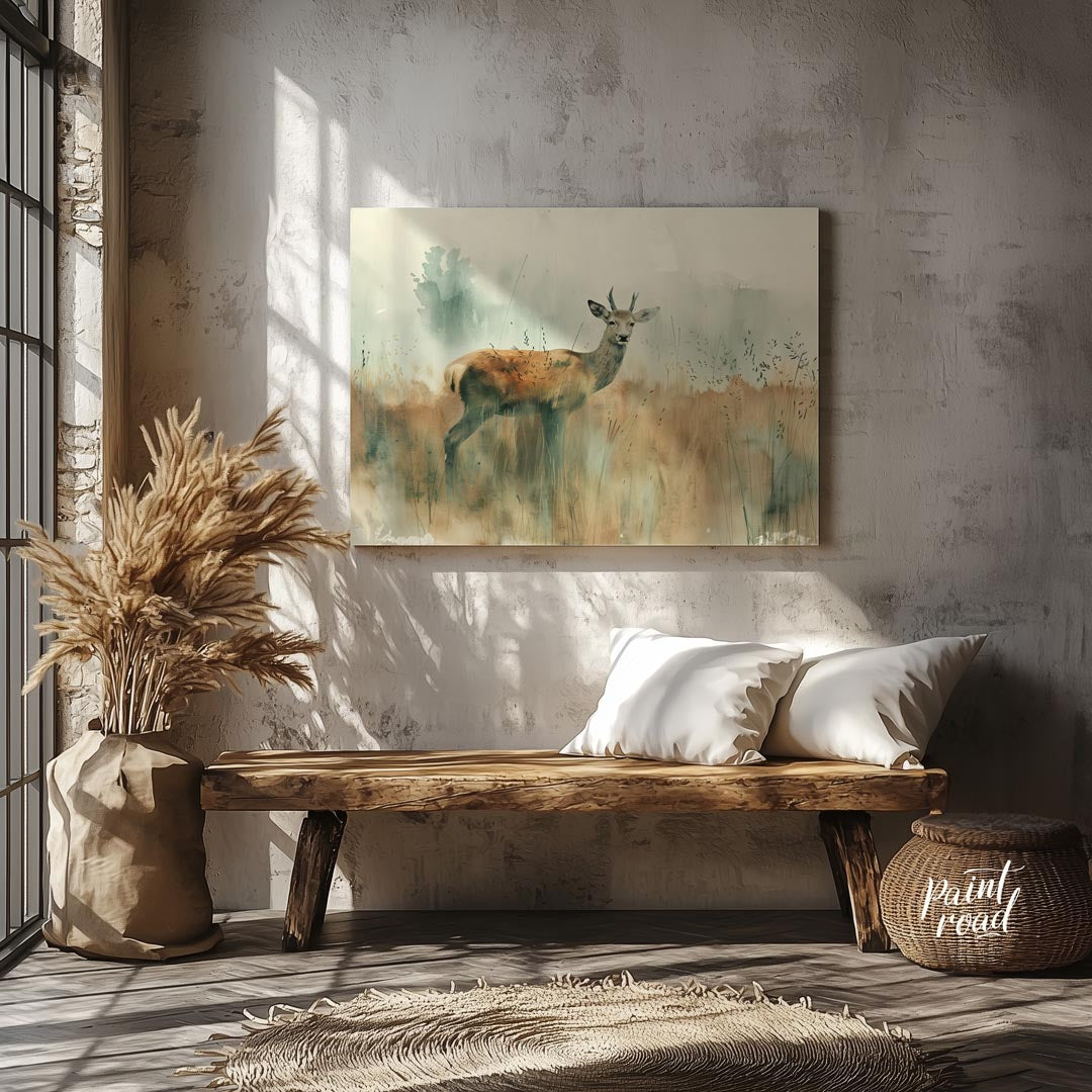 This serene watercolor painting captures a young stag standing gracefully in a field of tall, muted grasses. The stag, with its developing antlers, looks directly at the viewer with a calm and alert expression. The background is rendered in soft, ethereal washes of muted greens and grays, suggesting a foggy morning or a misty landscape, with subtle hints of distant trees. The foreground grass is painted with delicate, vertical strokes, providing texture and a natural setting. The overall impression is one of quiet elegance and the gentle beauty of wildlife in its natural habitat. The light, airy quality of the watercolor creates a peaceful and calming atmosphere, perfect for a tranquil space.