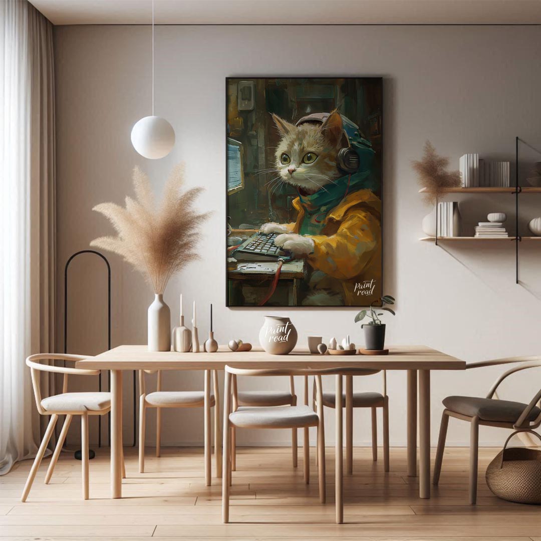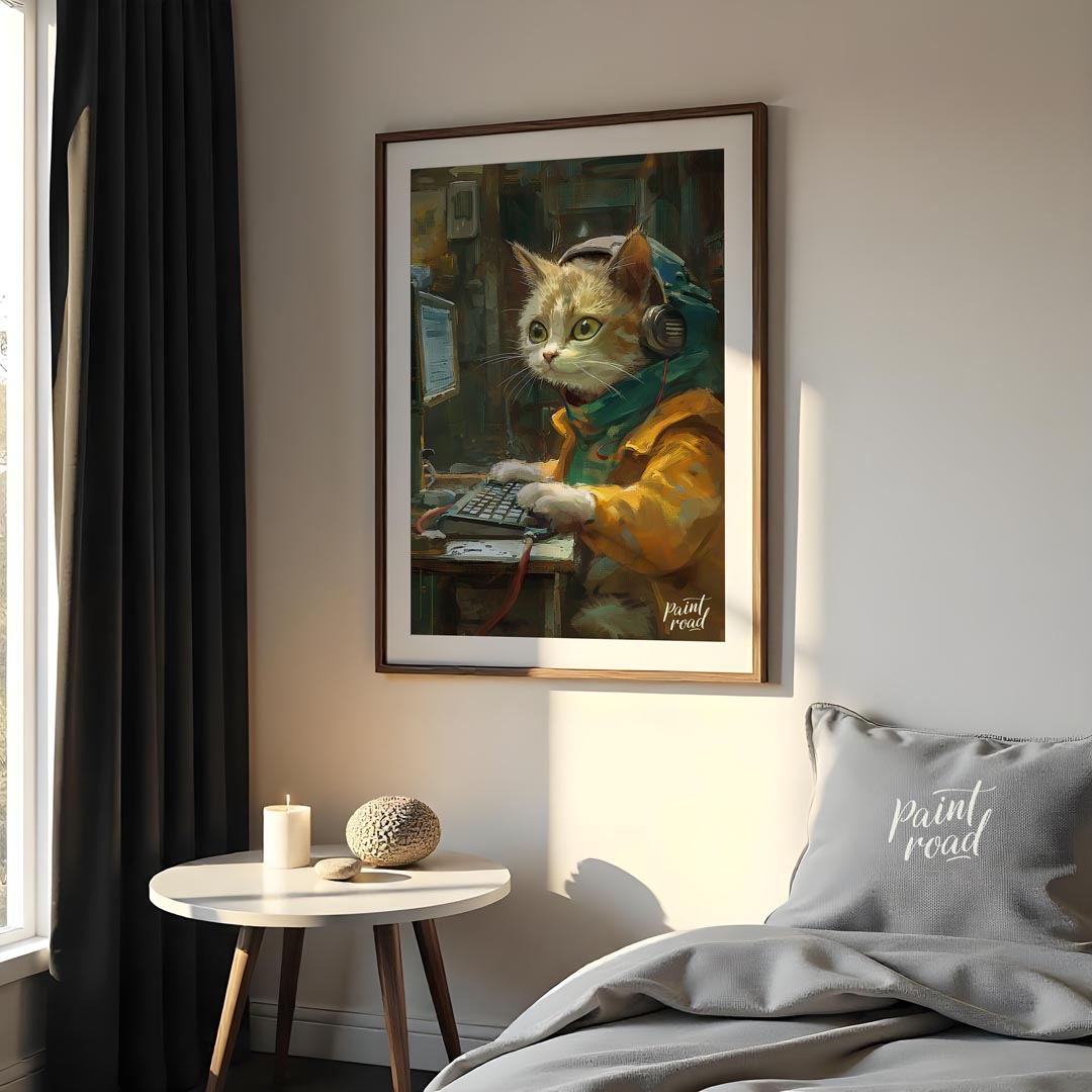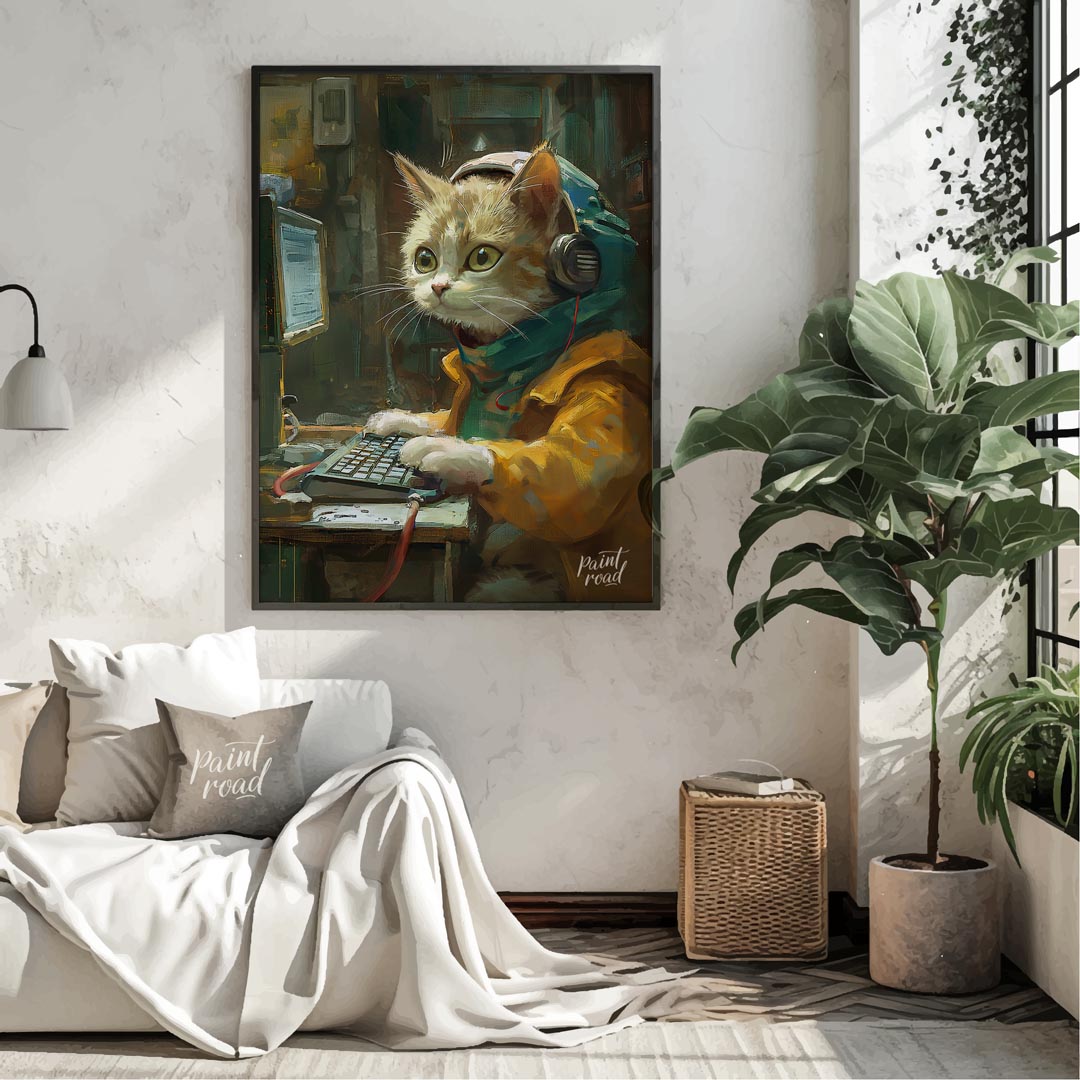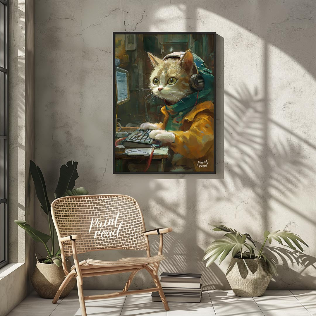 This captivating digital painting portrays a ginger and white cat engrossed in work at a computer, wearing large headphones over a teal hood. The cat's bright, focused green eyes are fixed on the screen, and its paws are positioned on a keyboard, suggesting a deep concentration. The background is rendered in a loose, painterly style with muted tones of olive green, brown, and grey, hinting at a cluttered or perhaps industrial environment, possibly a tech workspace or a cozy, lived-in den. The lighting is soft, casting a gentle glow on the cat and its immediate surroundings. The overall impression is one of a modern, tech-savvy feline, combining elements of domestic comfort with a futuristic or industrious vibe. This artwork is perfect for anyone who loves cats and technology.