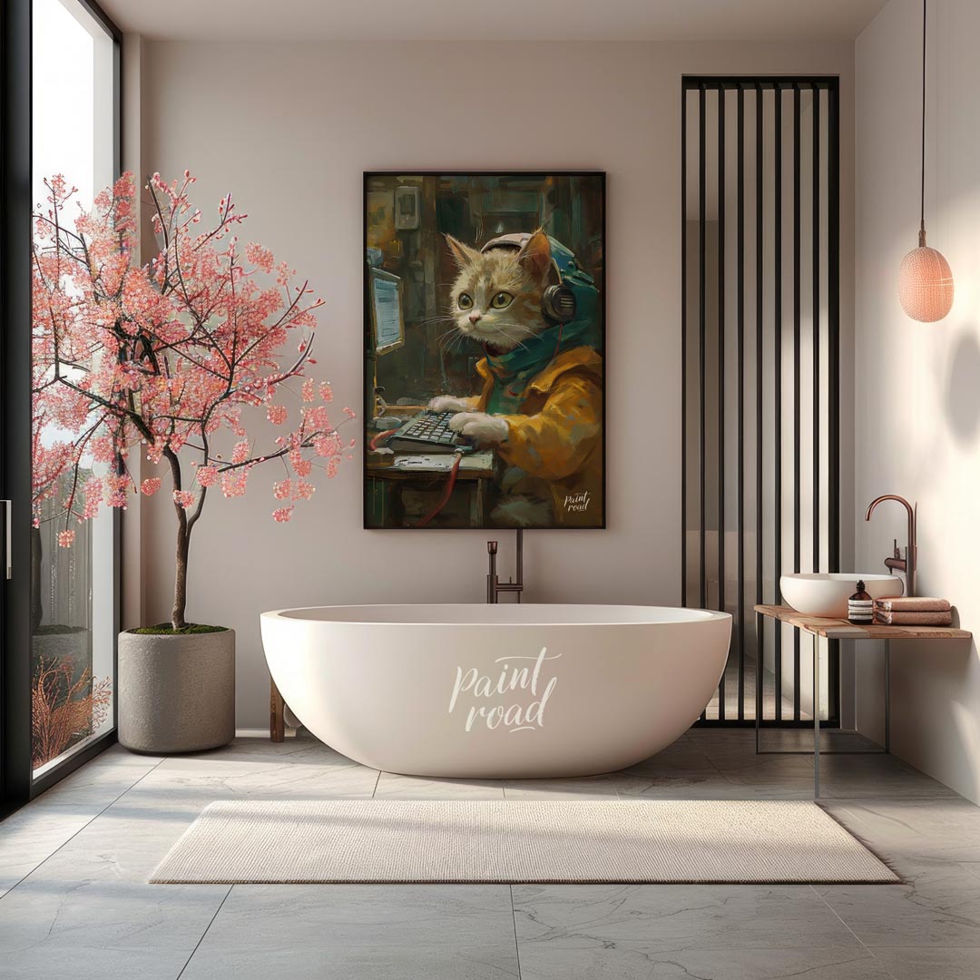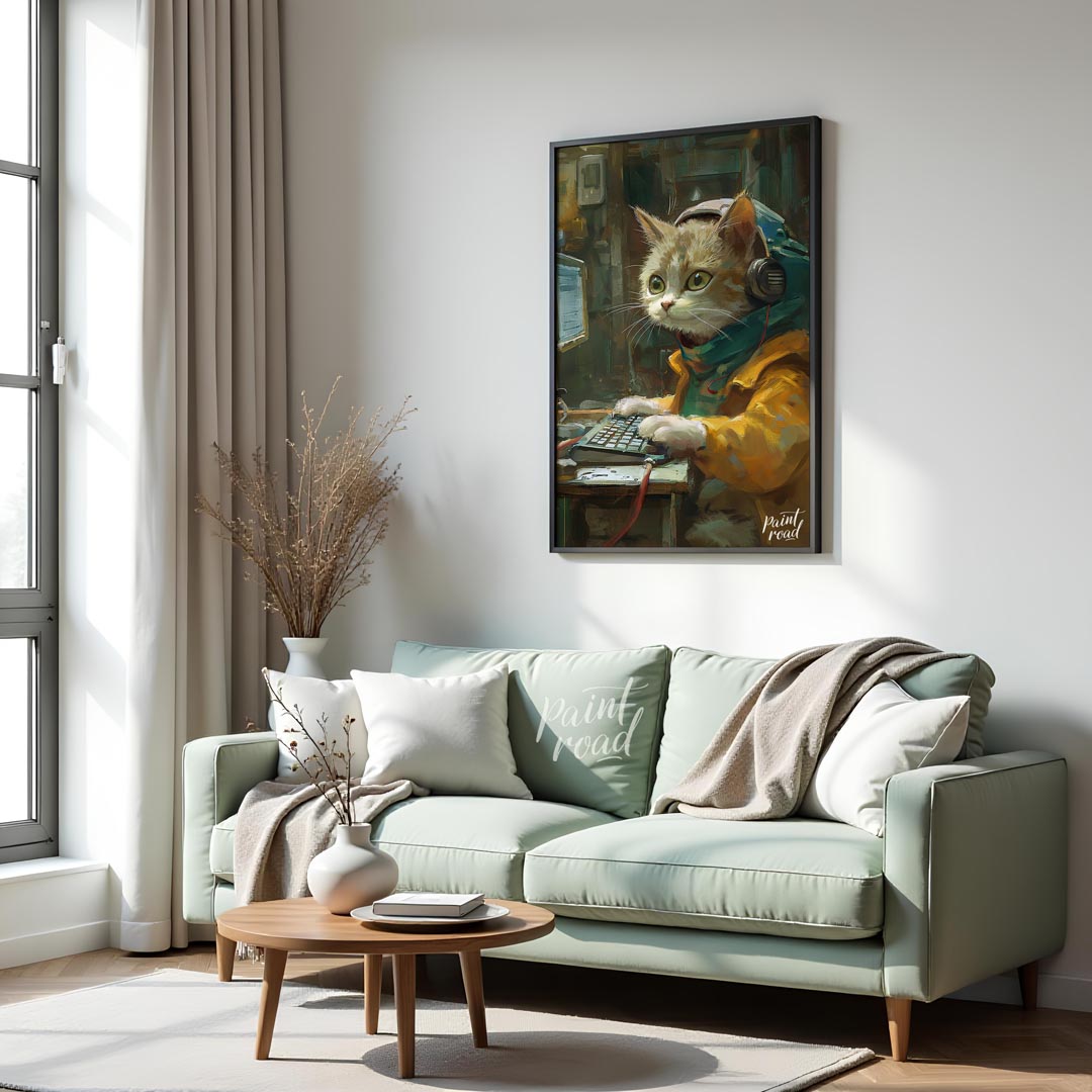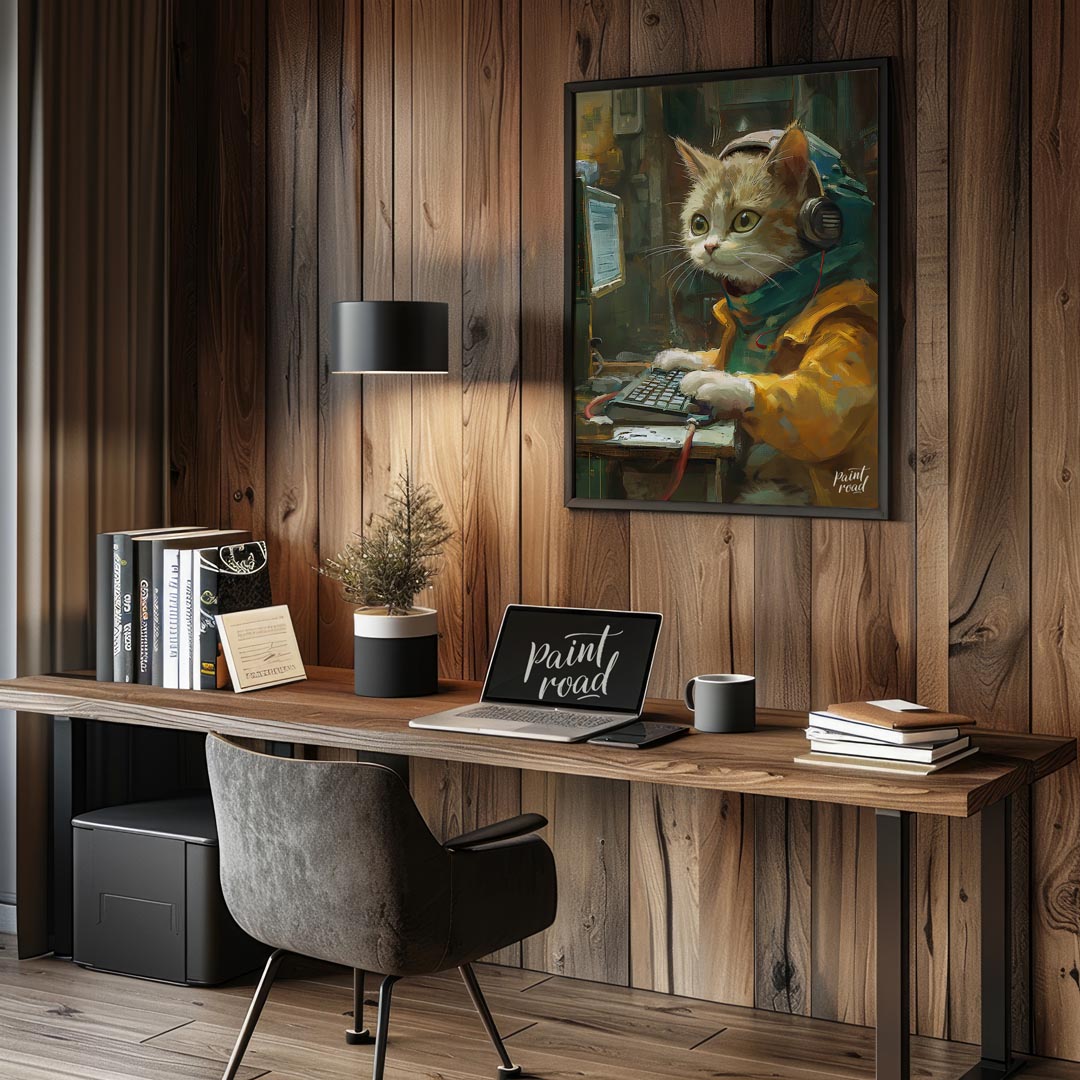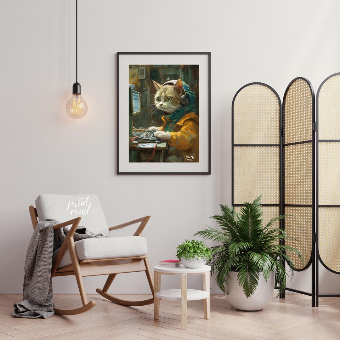 This captivating digital painting portrays a ginger and white cat engrossed in work at a computer, wearing large headphones over a teal hood. The cat's bright, focused green eyes are fixed on the screen, and its paws are positioned on a keyboard, suggesting a deep concentration. The background is rendered in a loose, painterly style with muted tones of olive green, brown, and grey, hinting at a cluttered or perhaps industrial environment, possibly a tech workspace or a cozy, lived-in den. The lighting is soft, casting a gentle glow on the cat and its immediate surroundings. The overall impression is one of a modern, tech-savvy feline, combining elements of domestic comfort with a futuristic or industrious vibe. This artwork is perfect for anyone who loves cats and technology.