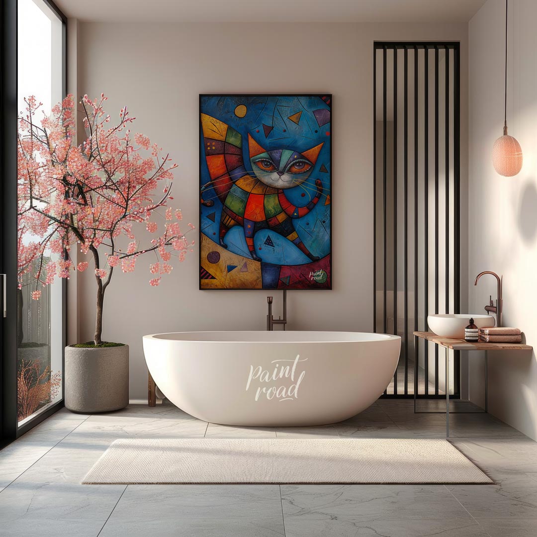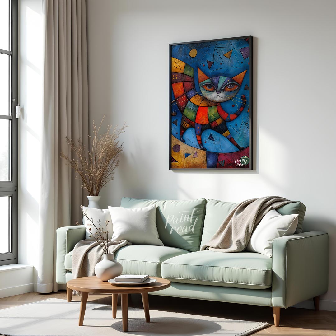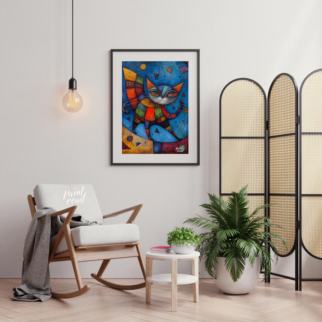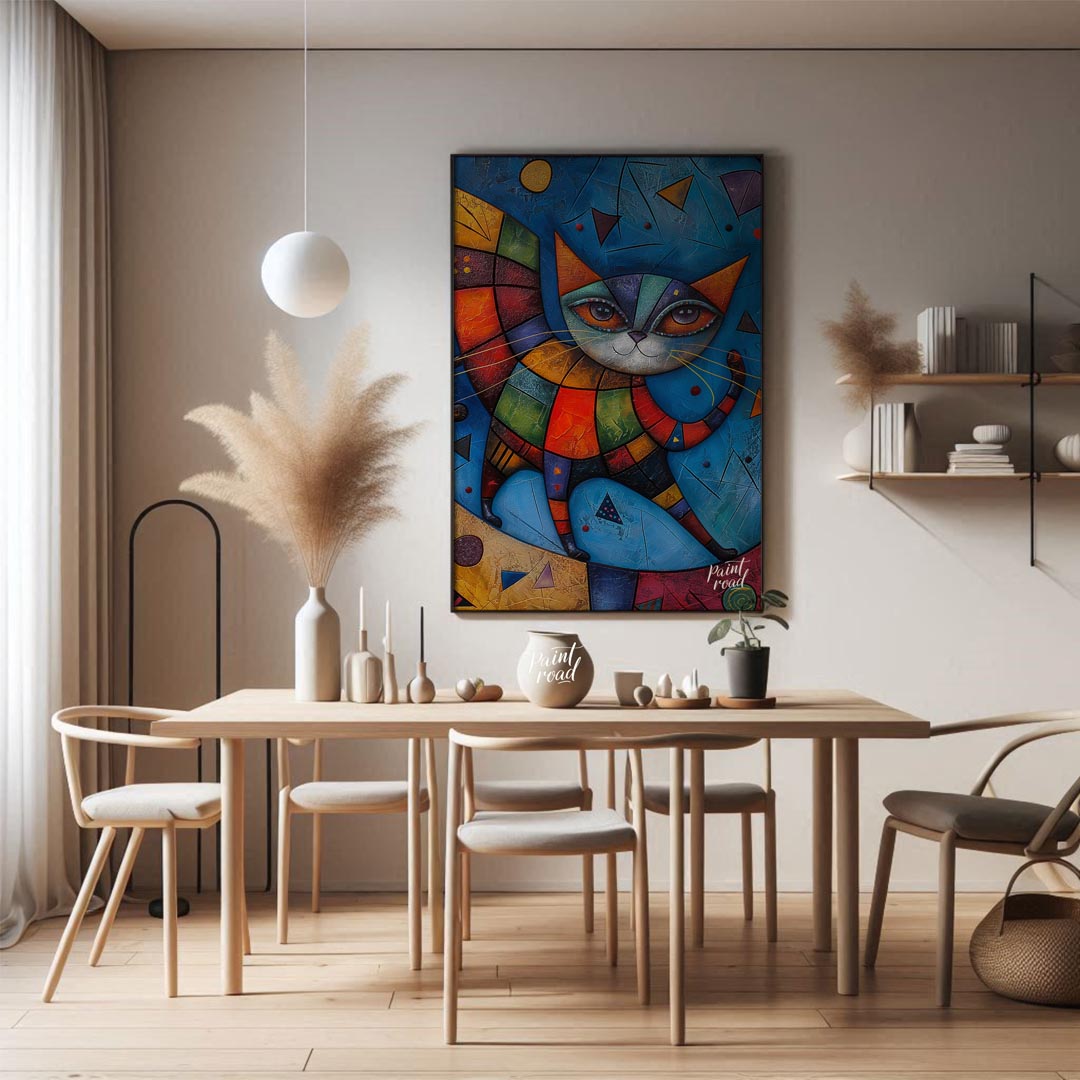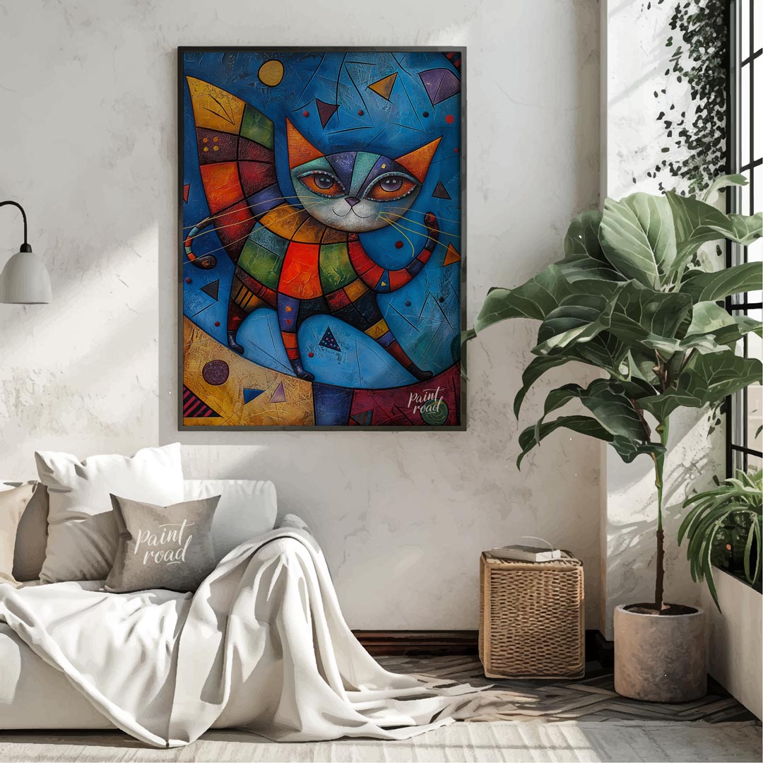 This captivating mixed-media artwork presents a highly stylized and colorful cat figure, reminiscent of harlequin or patchwork designs, against a dynamic blue background. The cat's body is composed of multi-colored, textured geometric segments, creating a quilt-like appearance. Its large, expressive eyes gaze outwards, framed by intricate lines and patterns. A decorative, segmented wing-like structure extends from its back, adding to its fantastical allure. The background is rich with varying shades of blue, textured surfaces, and abstract geometric shapes like triangles and circles, giving the impression of an otherworldly or cosmic setting. This piece is a celebration of abstract form, vibrant color, and imaginative creature design, perfect for a modern and eclectic interior.