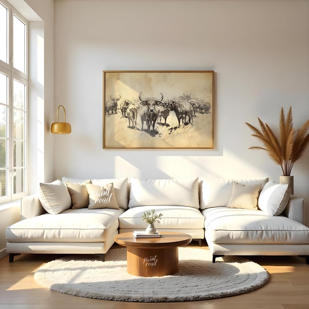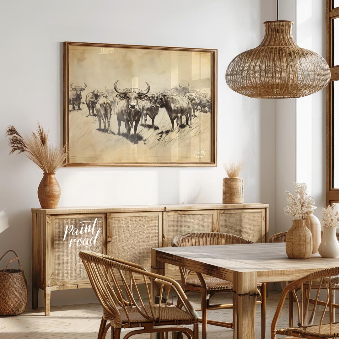 This monochromatic sketch captures a herd of water buffalo in a vast, open landscape. The artwork has a raw, illustrative quality, emphasizing line work and shading to create form and texture. Several buffalo are visible, with one prominent figure in the foreground looking directly at the viewer, its large horns and powerful build clearly depicted. The other buffalo recede into the background, suggested by softer lines and less detail, creating a sense of depth and multitude. The overall tone is earthy and natural, with hints of sepia, giving the impression of an old photograph or a field sketch. The style evokes a sense of ruggedness and the untamed nature of these formidable animals.