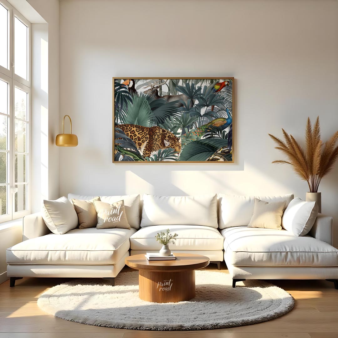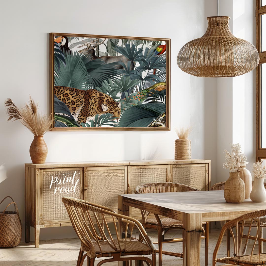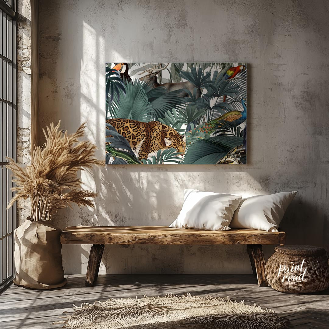 This immersive and richly detailed artwork presents a vibrant, dense tropical jungle teeming with hidden wildlife. The foreground and midground are dominated by an array of large, dark green palm fronds and other lush jungle foliage, creating a sense of depth and mystery. Peeking through the leaves are various exotic animals: a majestic leopard with its distinctive spots, a regal deer with prominent antlers, a colorful toucan, a vibrant parrot, an elegant peacock, a slithering snake, and a small lizard. Each animal is rendered with realistic detail, contrasting beautifully with the stylized and abundant plant life. The composition is dynamic and invites the viewer to discover the creatures concealed within the verdant landscape, celebrating the biodiversity of the rainforest.