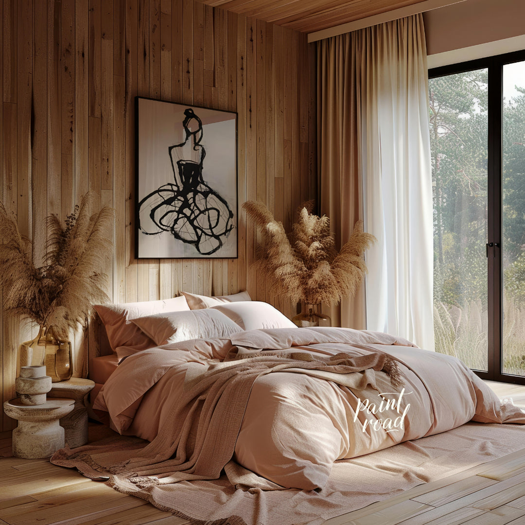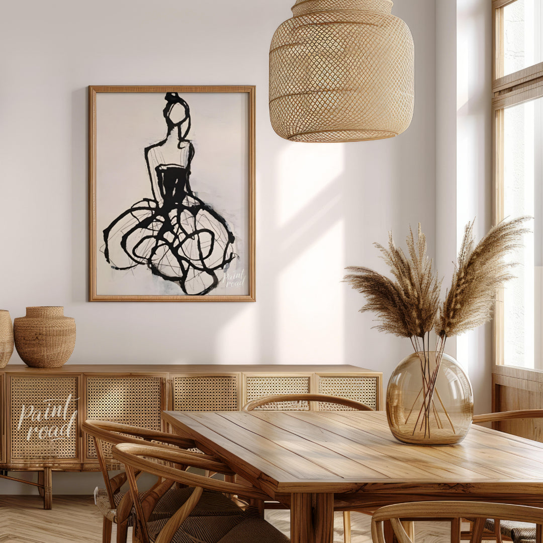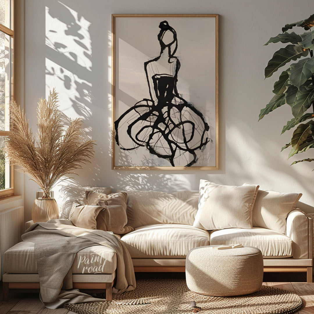 """Ink Couture"" presents a stylized fashion illustration rendered in bold black ink against a light background. The artwork captures the essence of a dress with expressive lines and gestural strokes, creating a sense of movement and drama. The abstract quality of the design evokes a sense of high fashion and artistic interpretation. This piece balances a sense of spontaneity with a refined aesthetic, making it a captivating study in line and form."