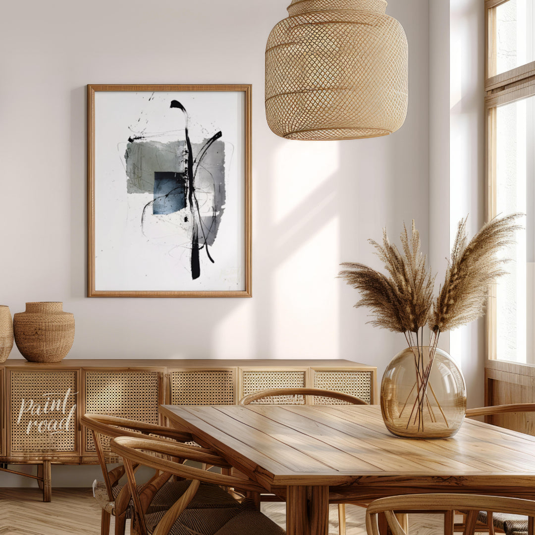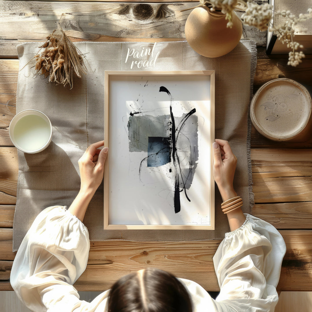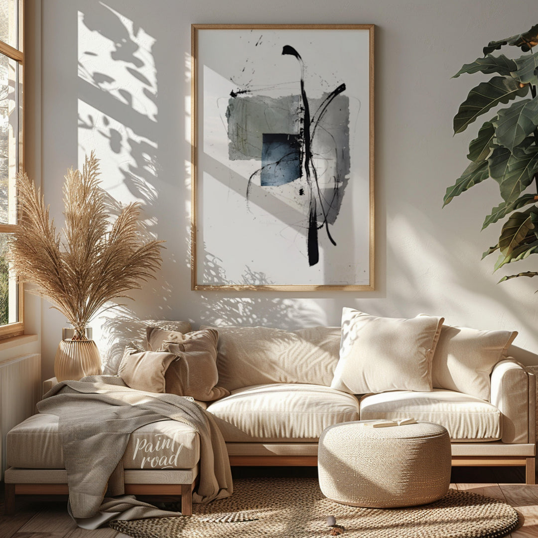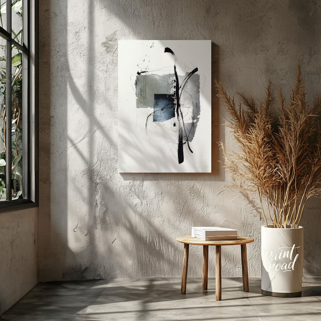 """Ink Fragment"" presents a dynamic interplay of abstract forms and expressive ink strokes against a clean, white background. The artwork features a combination of geometric shapes, rendered with soft washes of color, juxtaposed with bold, gestural lines and splatters. The contrast between the structured shapes and the spontaneous marks creates a sense of tension and movement. The subtle layering and textures add depth and complexity to the composition. This piece balances elements of control and chance, inviting the viewer to explore the interplay between intention and accident."