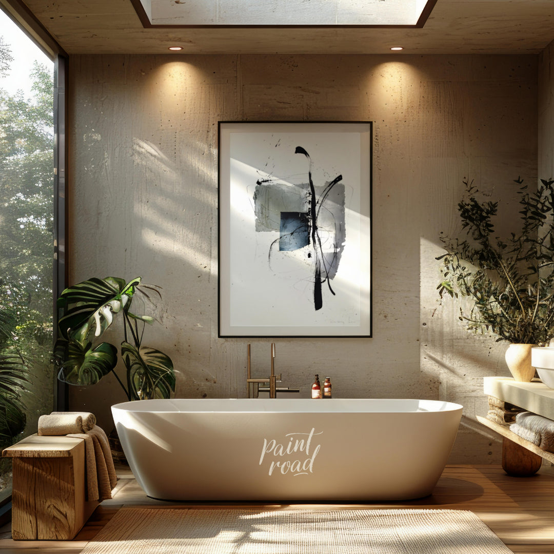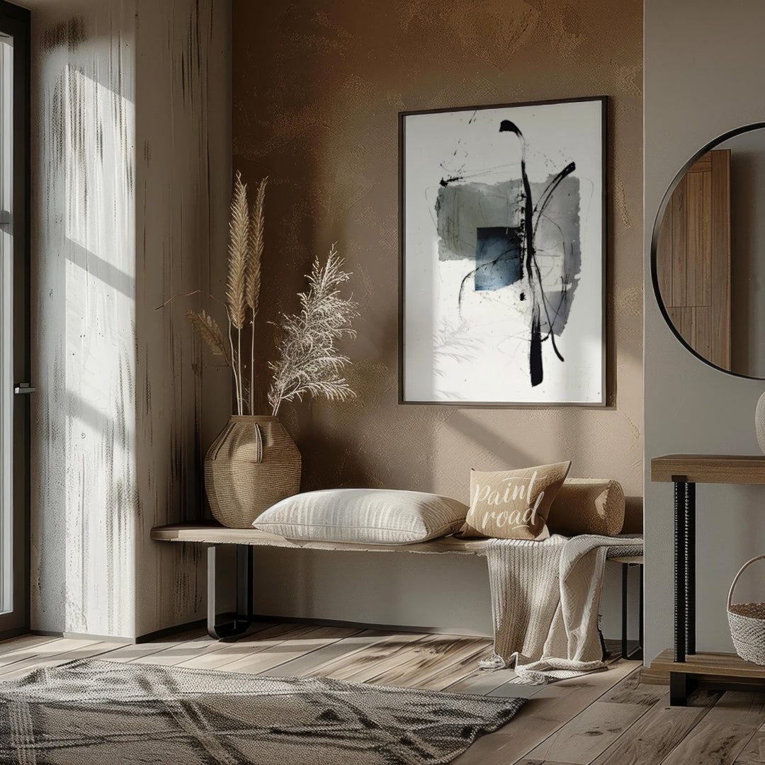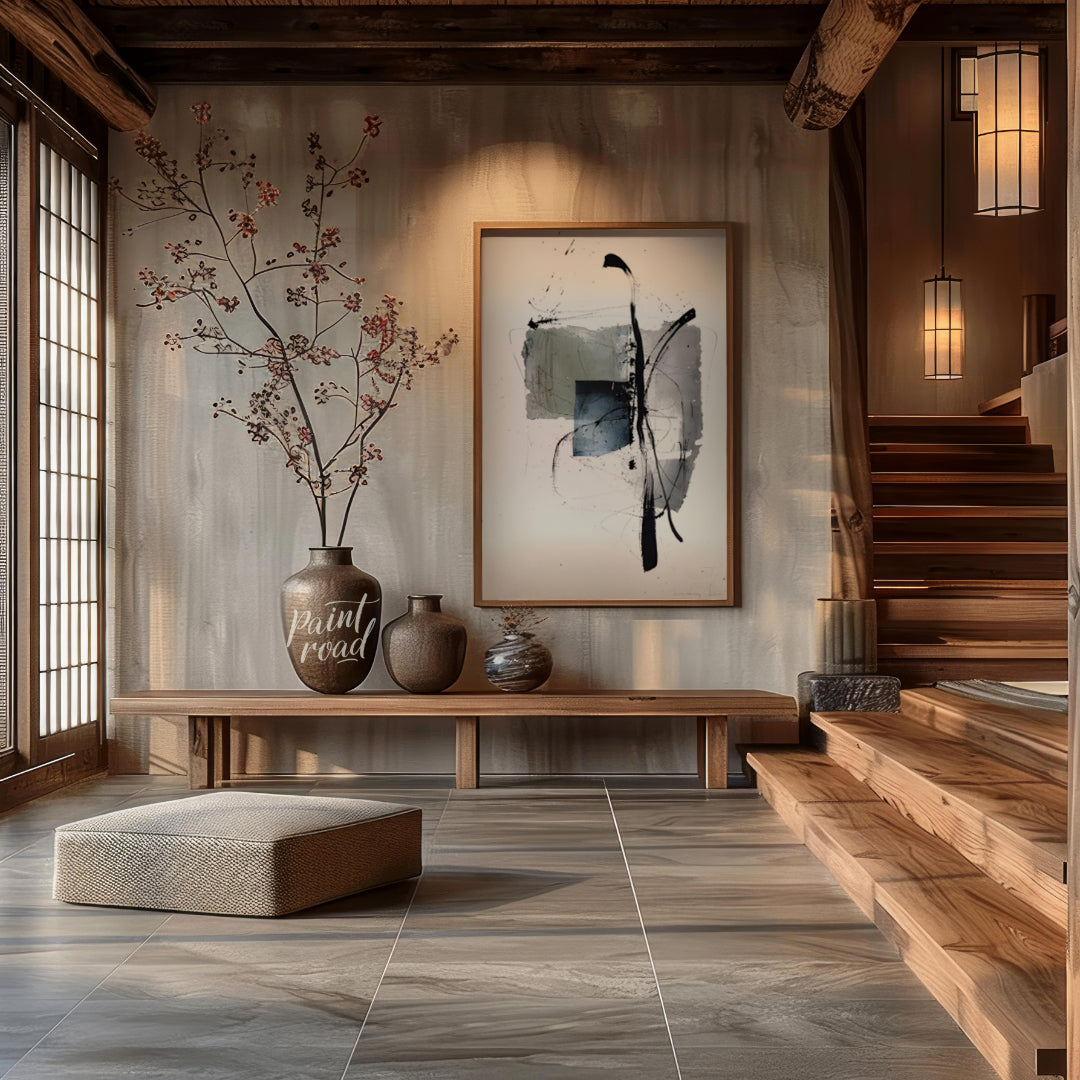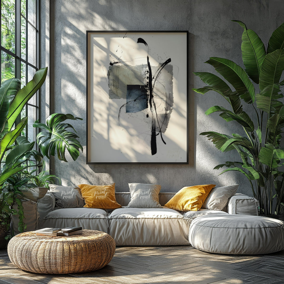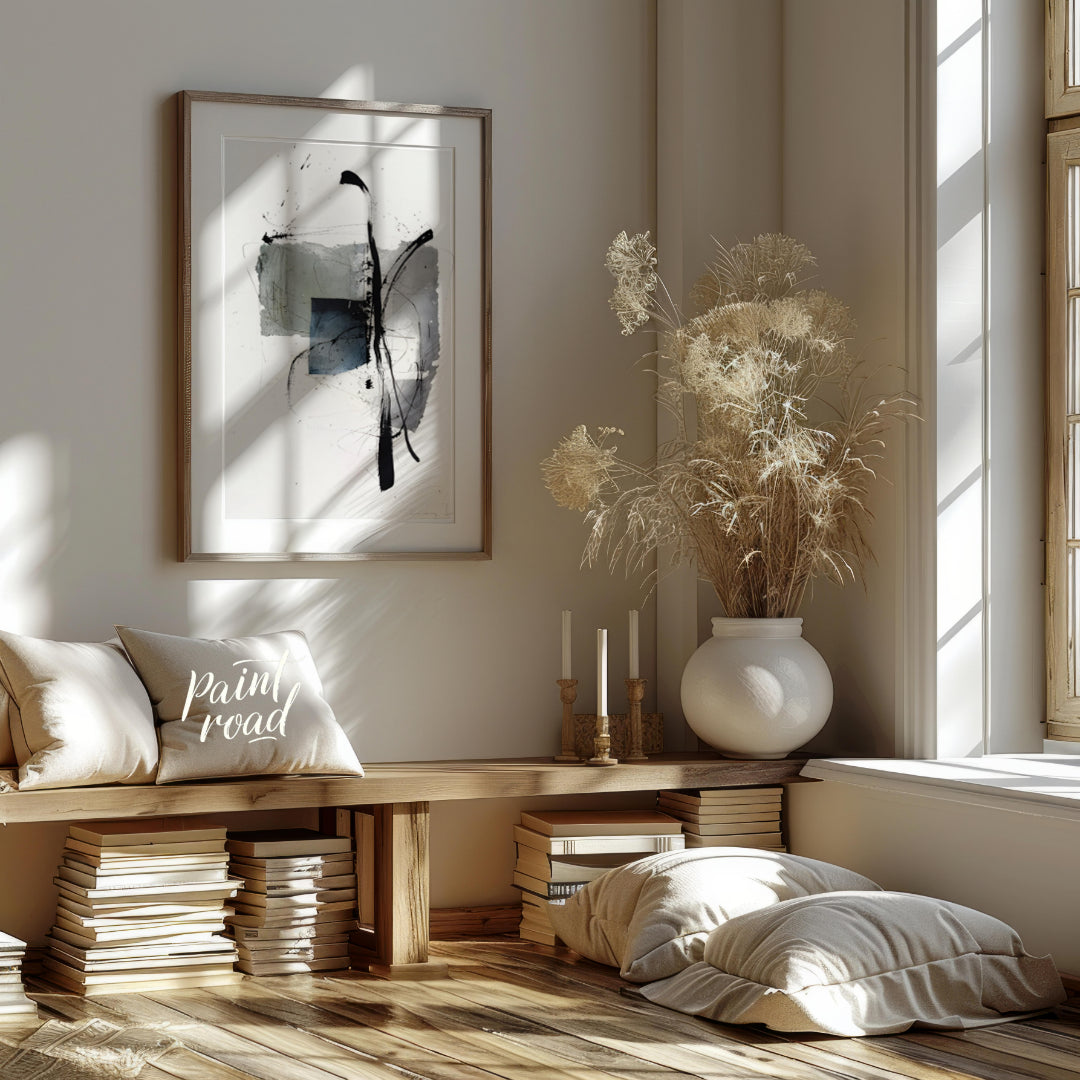"""Ink Fragment"" presents a dynamic interplay of abstract forms and expressive ink strokes against a clean, white background. The artwork features a combination of geometric shapes, rendered with soft washes of color, juxtaposed with bold, gestural lines and splatters. The contrast between the structured shapes and the spontaneous marks creates a sense of tension and movement. The subtle layering and textures add depth and complexity to the composition. This piece balances elements of control and chance, inviting the viewer to explore the interplay between intention and accident."