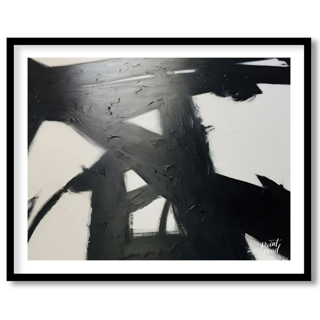 " ""Ink Impact"" presents a dynamic abstract composition with bold black strokes against a light background. The artwork evokes a sense of raw energy and spontaneous mark-making. The thick, gestural lines and varied textures create a visually compelling experience. The high contrast and dramatic forms add a contemporary edge to the design. This piece balances a sense of chaos with a deliberate arrangement, inviting the viewer to explore its intricate details and spatial relationships."