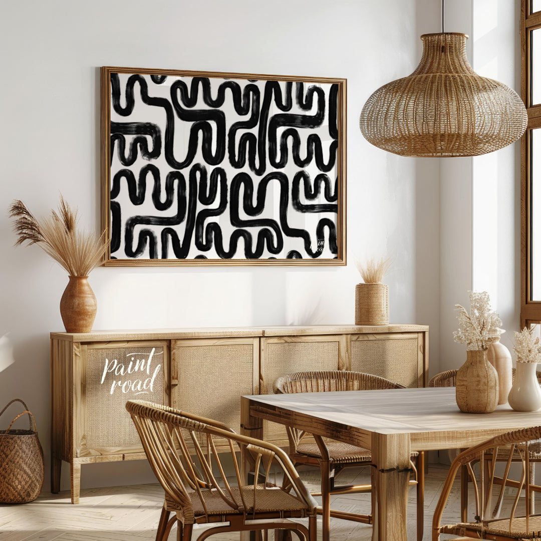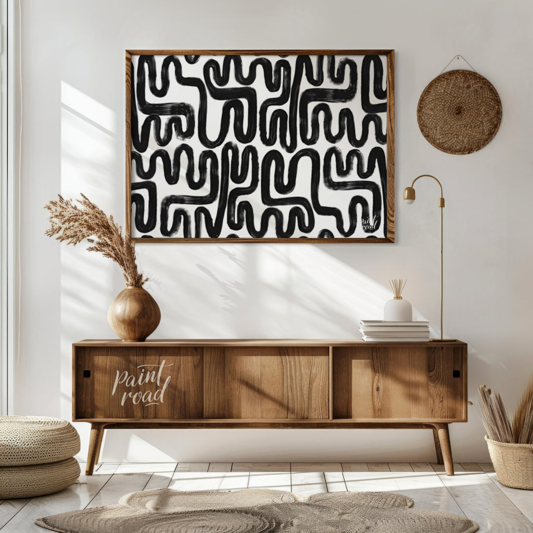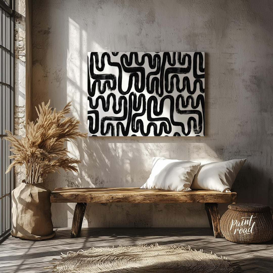 """Ink Maze"" presents a bold, abstract pattern of thick black lines against a stark white background. The lines twist and turn, creating a complex, maze-like design that draws the eye and invites exploration. The brushstrokes are visible, adding a tactile, hand-drawn quality to the composition. The high contrast between the black and white areas creates a striking visual impact. This piece balances a sense of playful complexity with a modern, graphic aesthetic, making it a captivating visual experience."