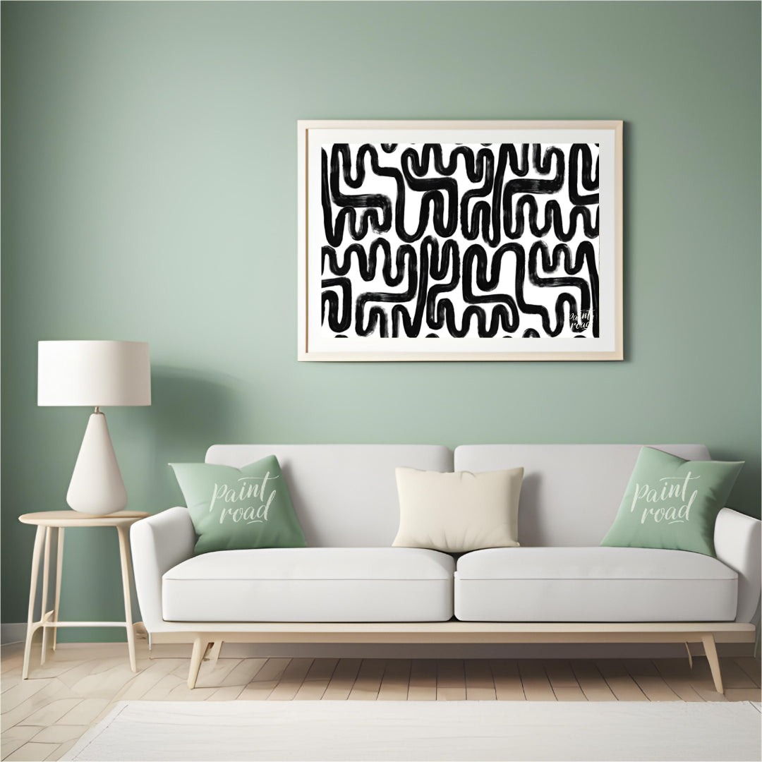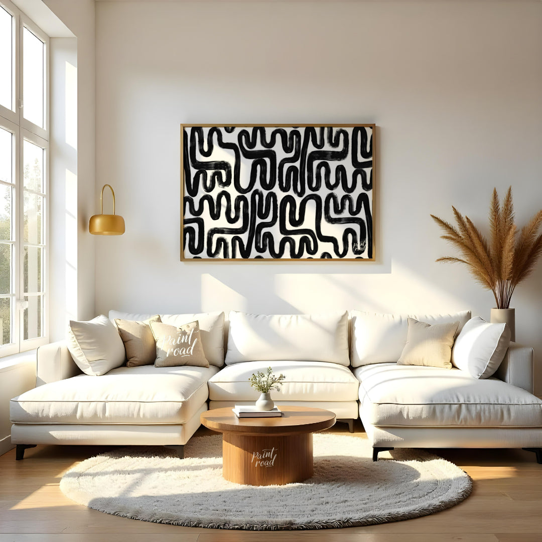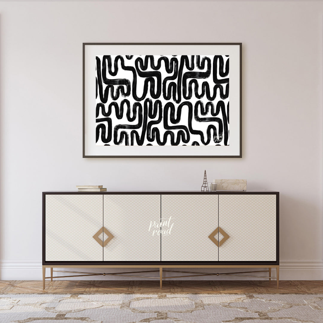 """Ink Maze"" presents a bold, abstract pattern of thick black lines against a stark white background. The lines twist and turn, creating a complex, maze-like design that draws the eye and invites exploration. The brushstrokes are visible, adding a tactile, hand-drawn quality to the composition. The high contrast between the black and white areas creates a striking visual impact. This piece balances a sense of playful complexity with a modern, graphic aesthetic, making it a captivating visual experience."