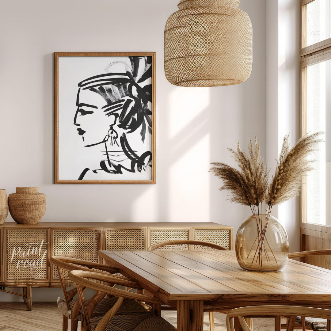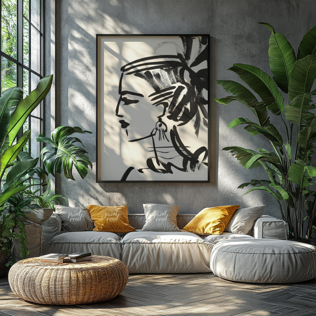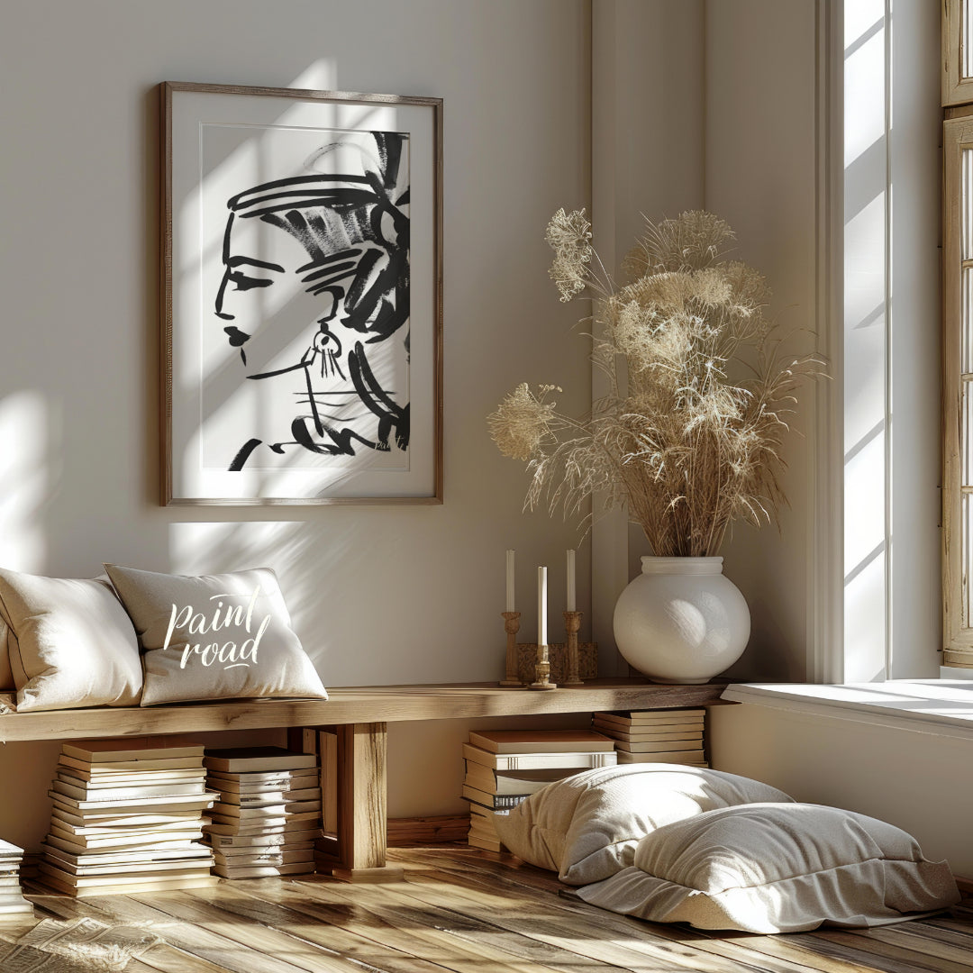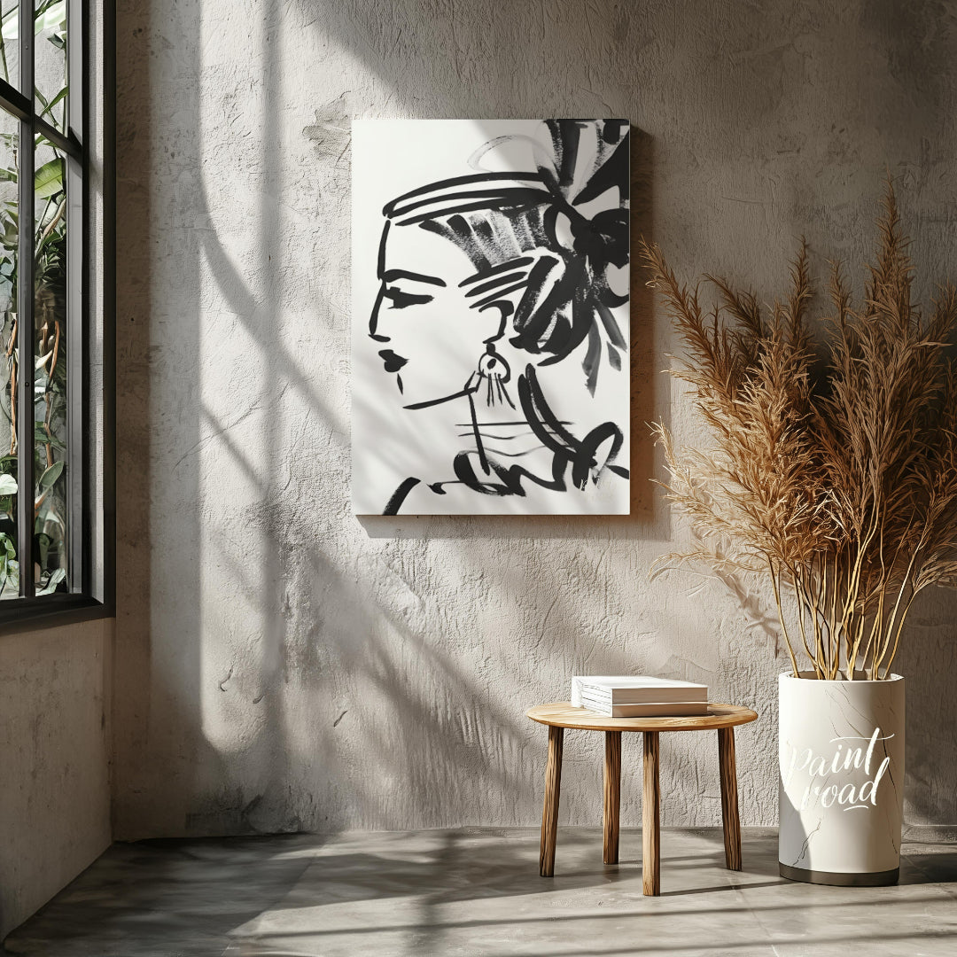 """Ink Profile"" presents a striking portrait sketch rendered in bold black ink against a clean white background. The subject's profile is captured with expressive, gestural strokes, highlighting their elegant features and stylish hairstyle. The flowing lines and varying line weights create a sense of movement and depth. The minimalist composition and high contrast evoke a sense of modern sophistication. This piece balances a sense of spontaneity with a refined aesthetic, making it a captivating study in line and form."