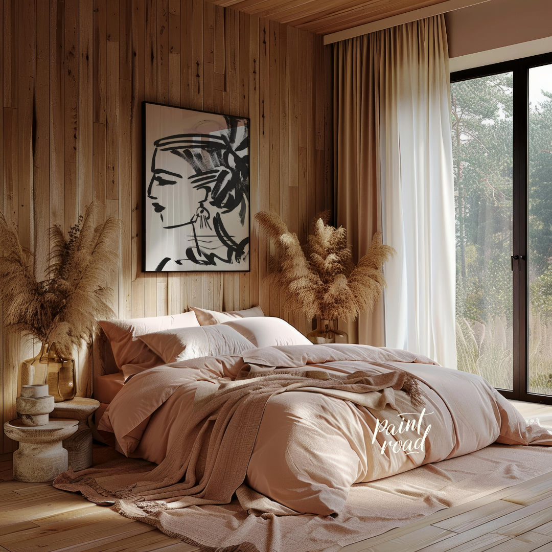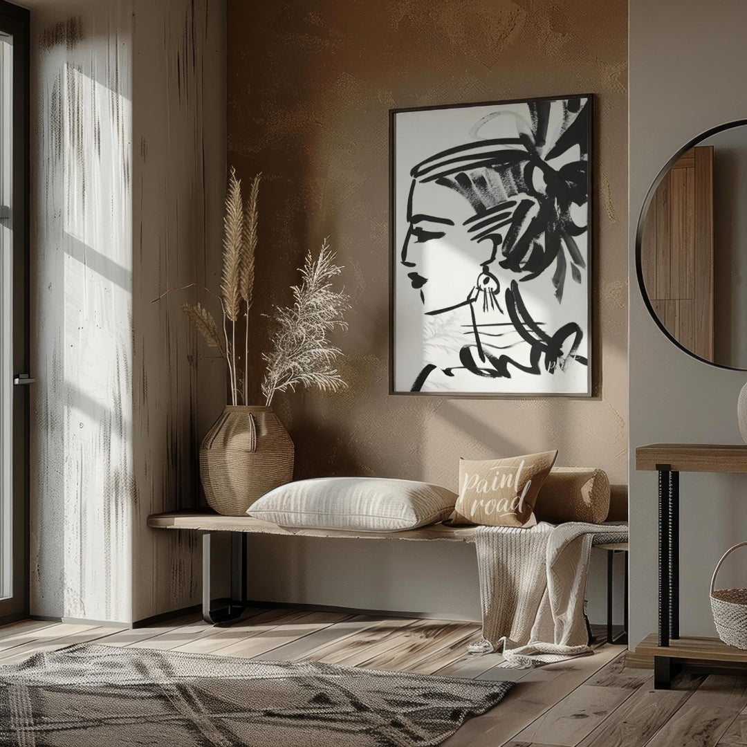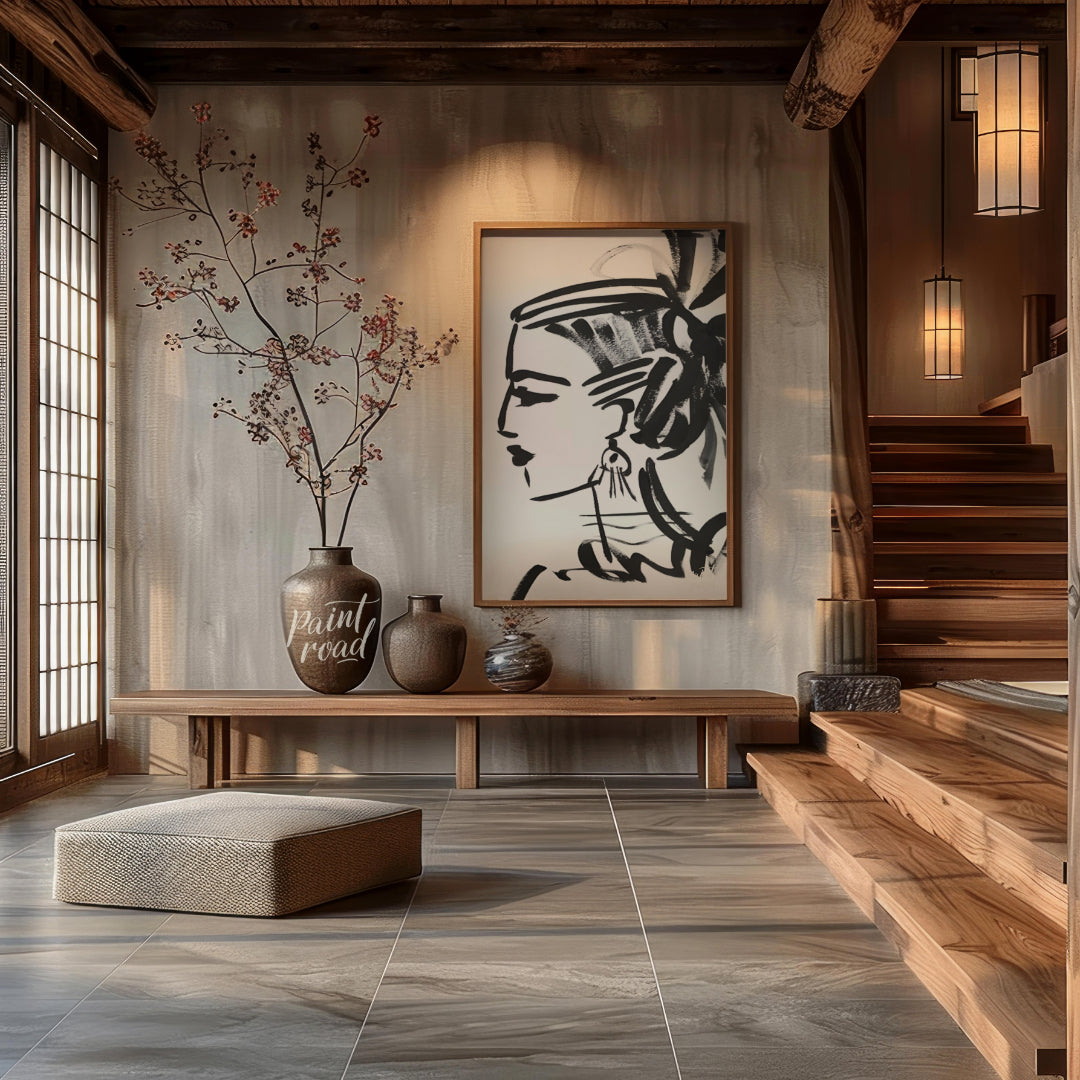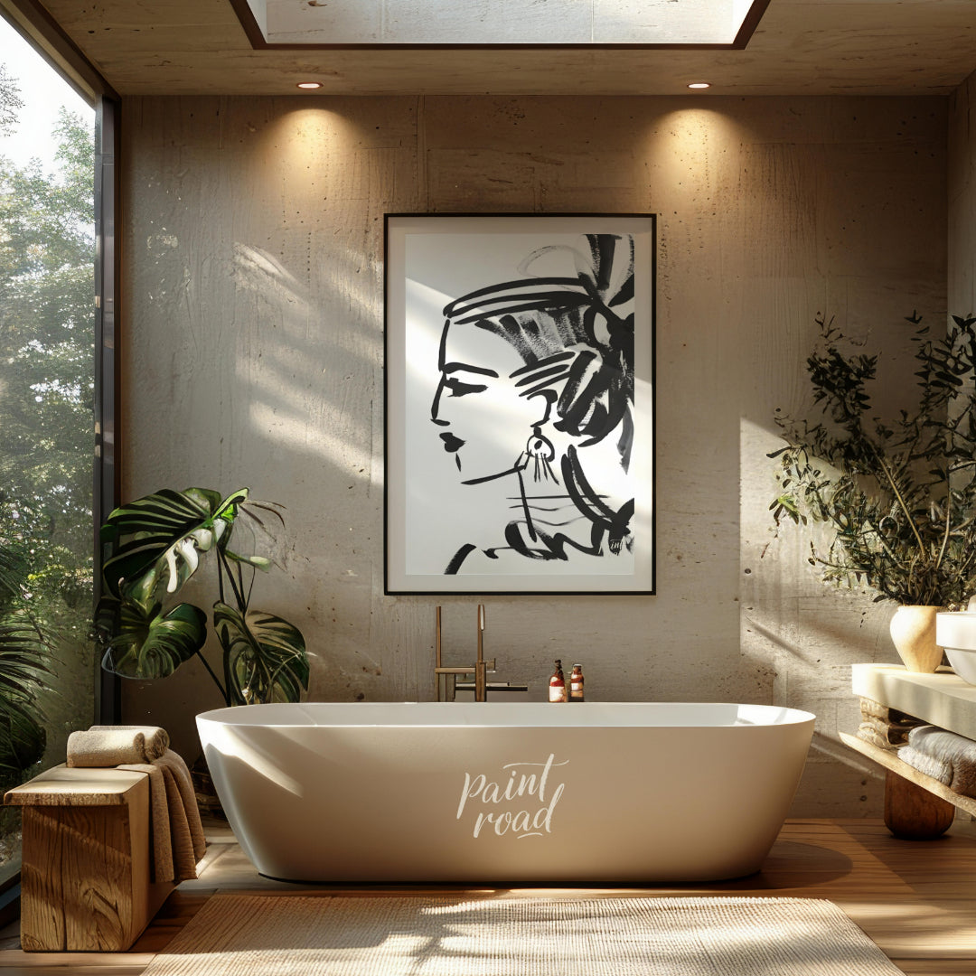 """Ink Profile"" presents a striking portrait sketch rendered in bold black ink against a clean white background. The subject's profile is captured with expressive, gestural strokes, highlighting their elegant features and stylish hairstyle. The flowing lines and varying line weights create a sense of movement and depth. The minimalist composition and high contrast evoke a sense of modern sophistication. This piece balances a sense of spontaneity with a refined aesthetic, making it a captivating study in line and form."
