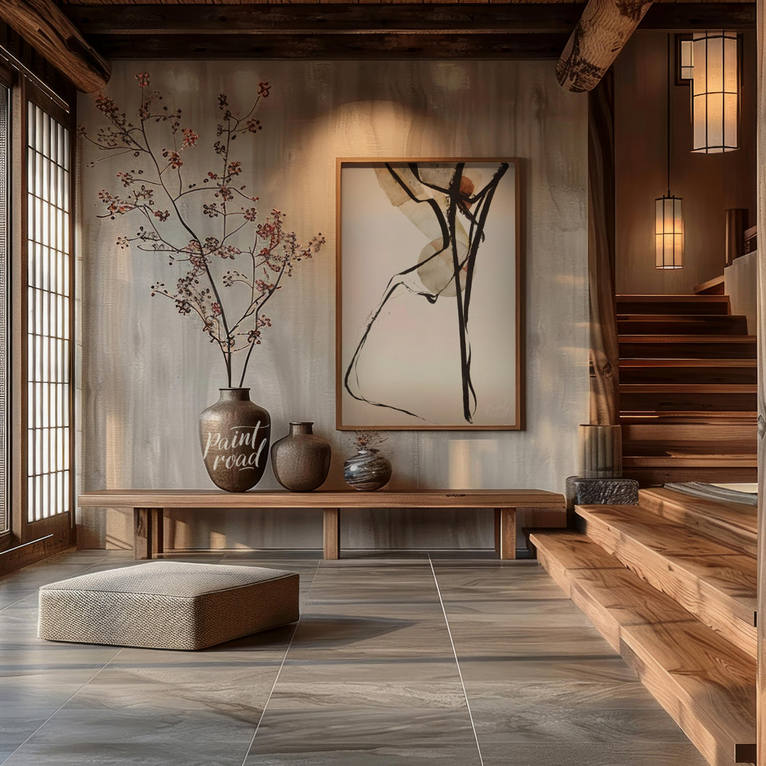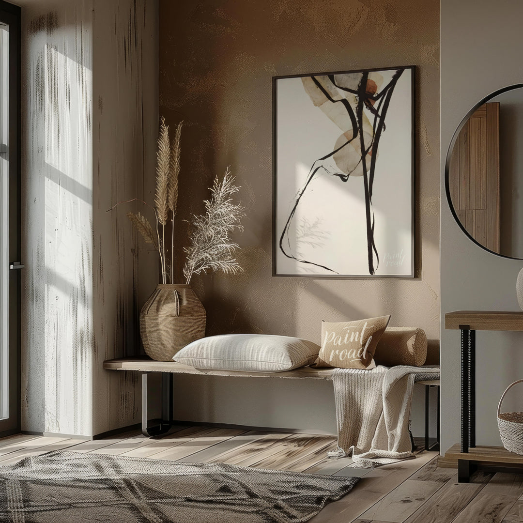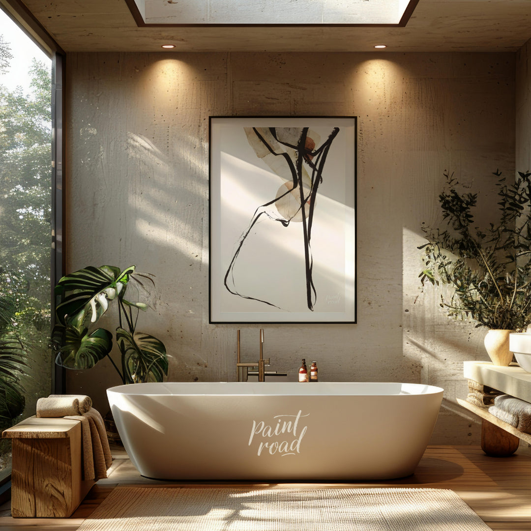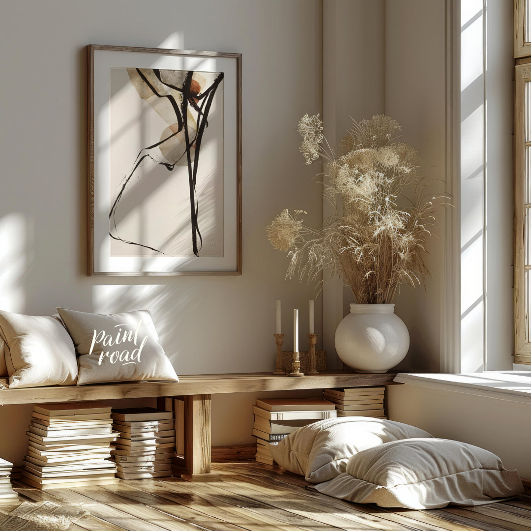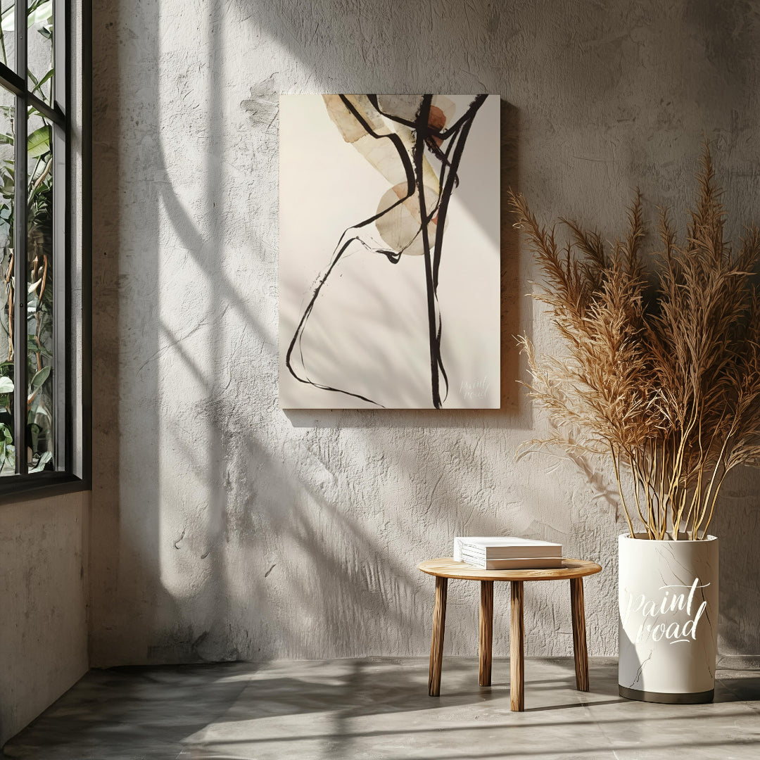 """Intersecting Limbs"" presents an abstract composition with a focus on dynamic lines and fragmented forms. The artwork features bold black lines that intersect and curve, suggesting the contours of limbs or organic shapes against a light, neutral background. The subtle washes of color and textured elements add depth and a sense of movement. This piece balances a sense of spontaneity with a deliberate composition, inviting the viewer to interpret the interplay of line, form, and space. The artwork's minimalist palette and expressive strokes create a visually intriguing experience."