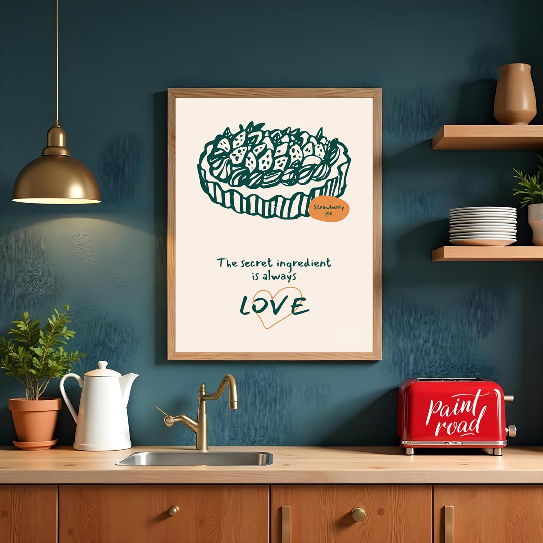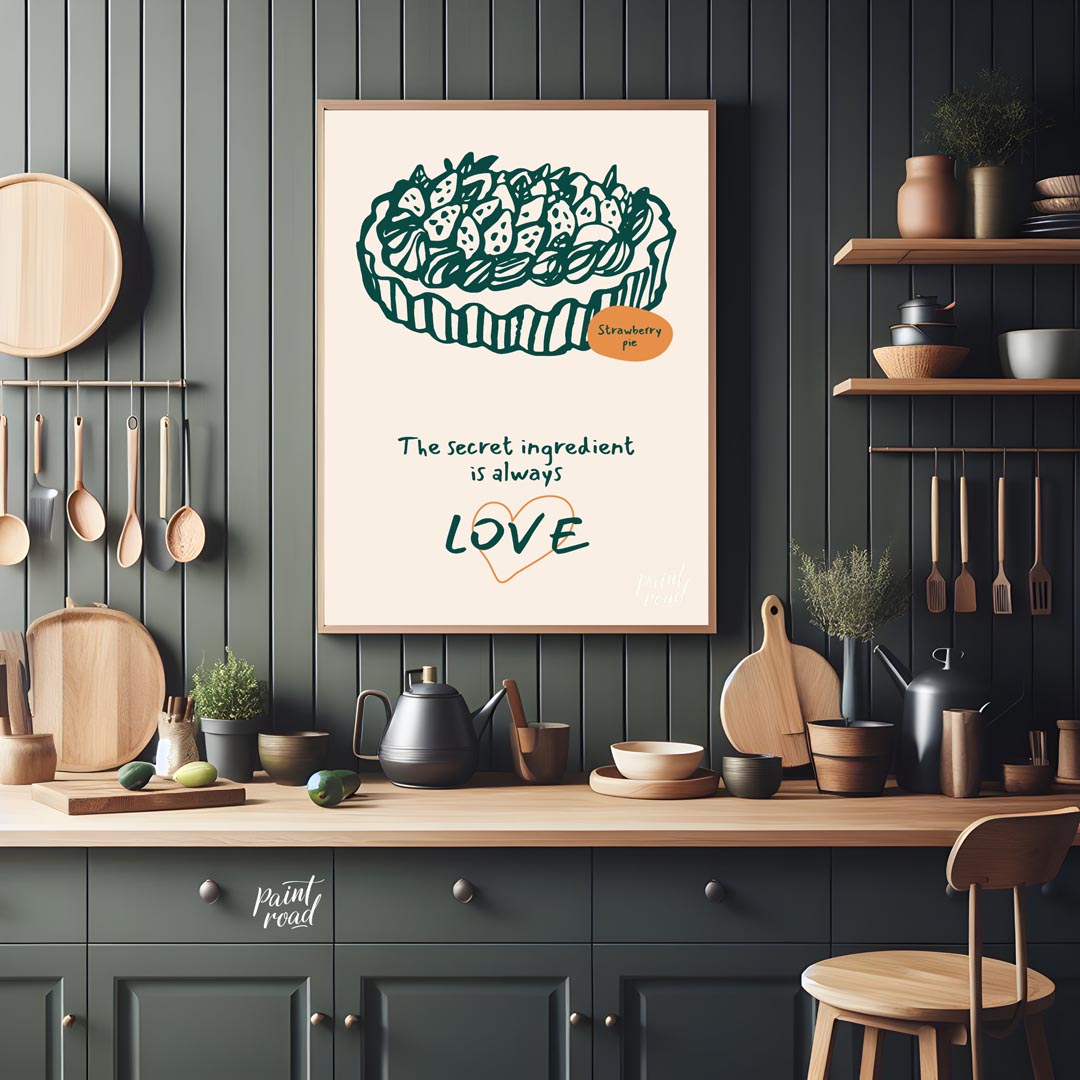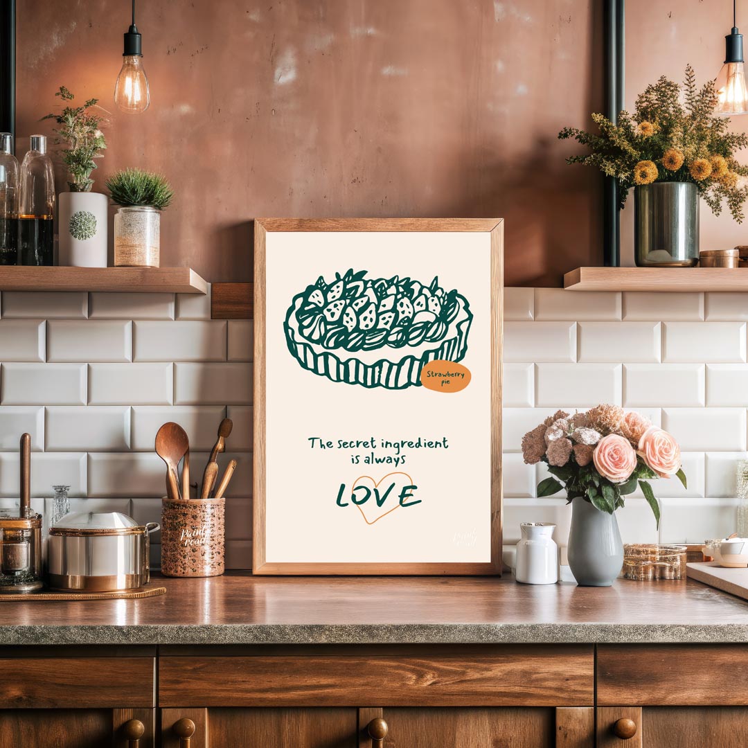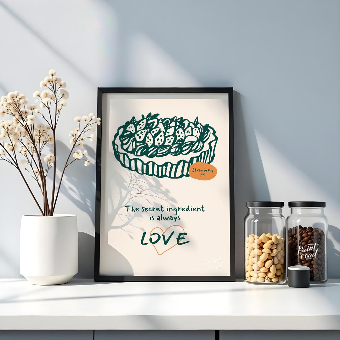 This heartwarming poster showcases a delightful line art illustration of a generously topped strawberry pie, rendered in a deep green against a soft, light background. The intricate details of the strawberries and crust are charmingly depicted. A small orange oval labels the dessert "Strawberry pie," adding a touch of color and clarity. Below the appetizing illustration, the profound message "The secret ingredient is always LOVE" is inscribed in a flowing, handwritten font. The word "LOVE" is notably larger and stands out with a subtle orange heart outline, emphasizing the emotional core of the message. This poster celebrates the sentiment that homemade food, especially desserts, is made more special with affection. It's an ideal piece for a kitchen, dining room, bakery, or a cozy living space, appealing to bakers, home cooks, and anyone who cherishes the heartfelt aspect of food and family.