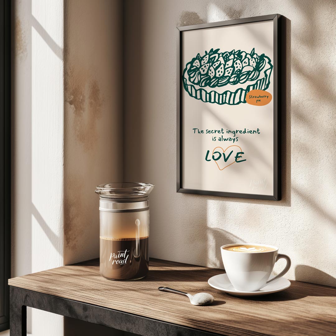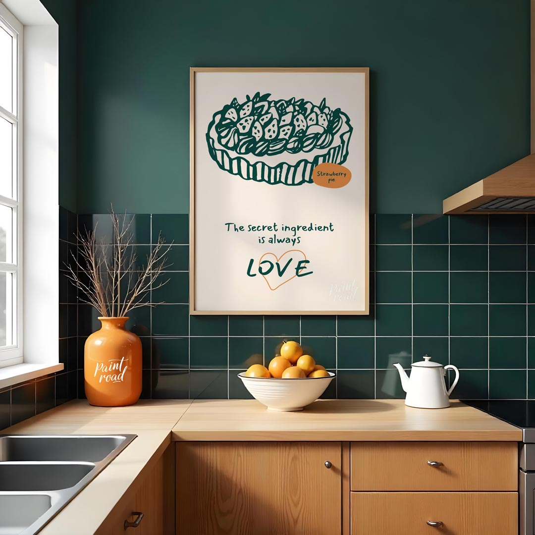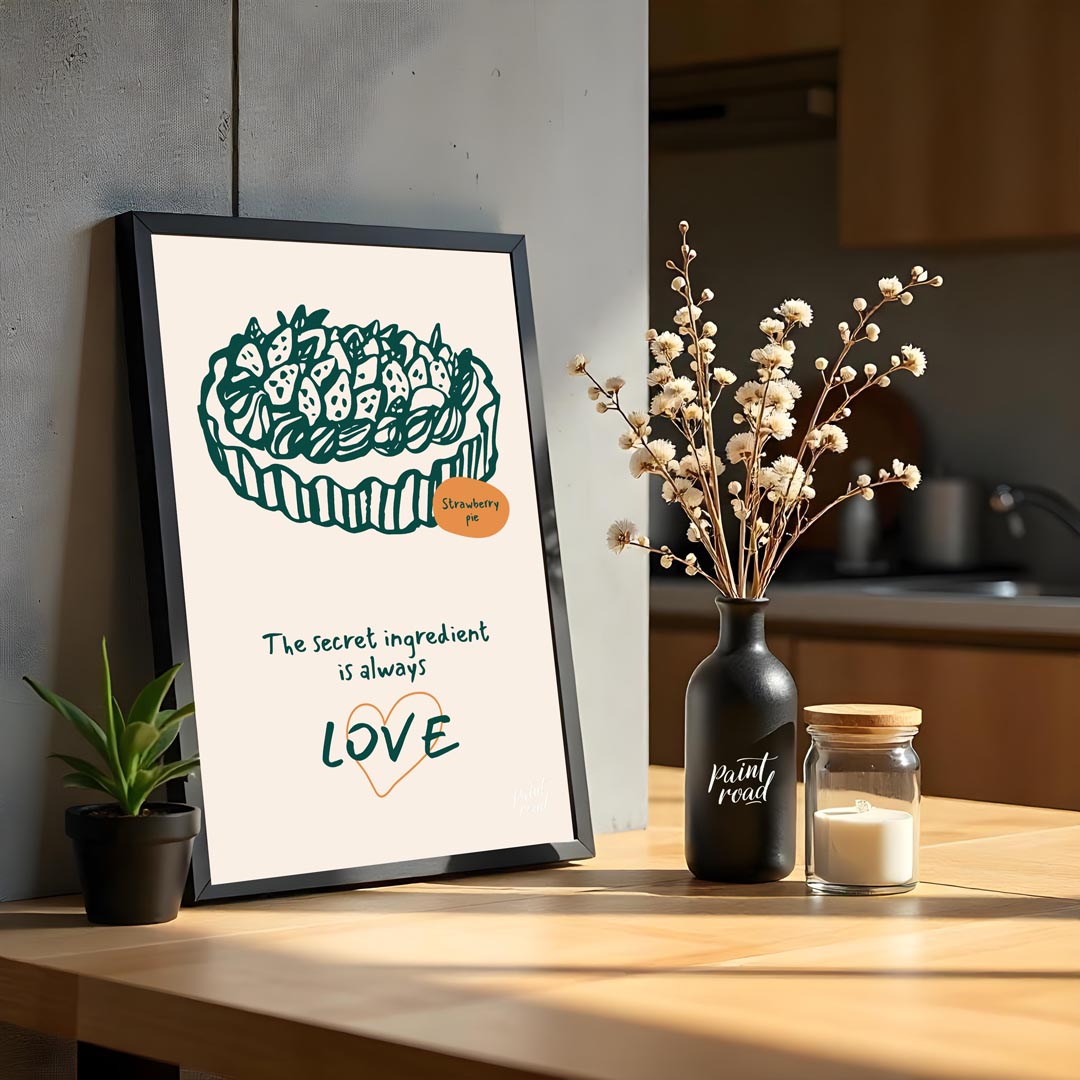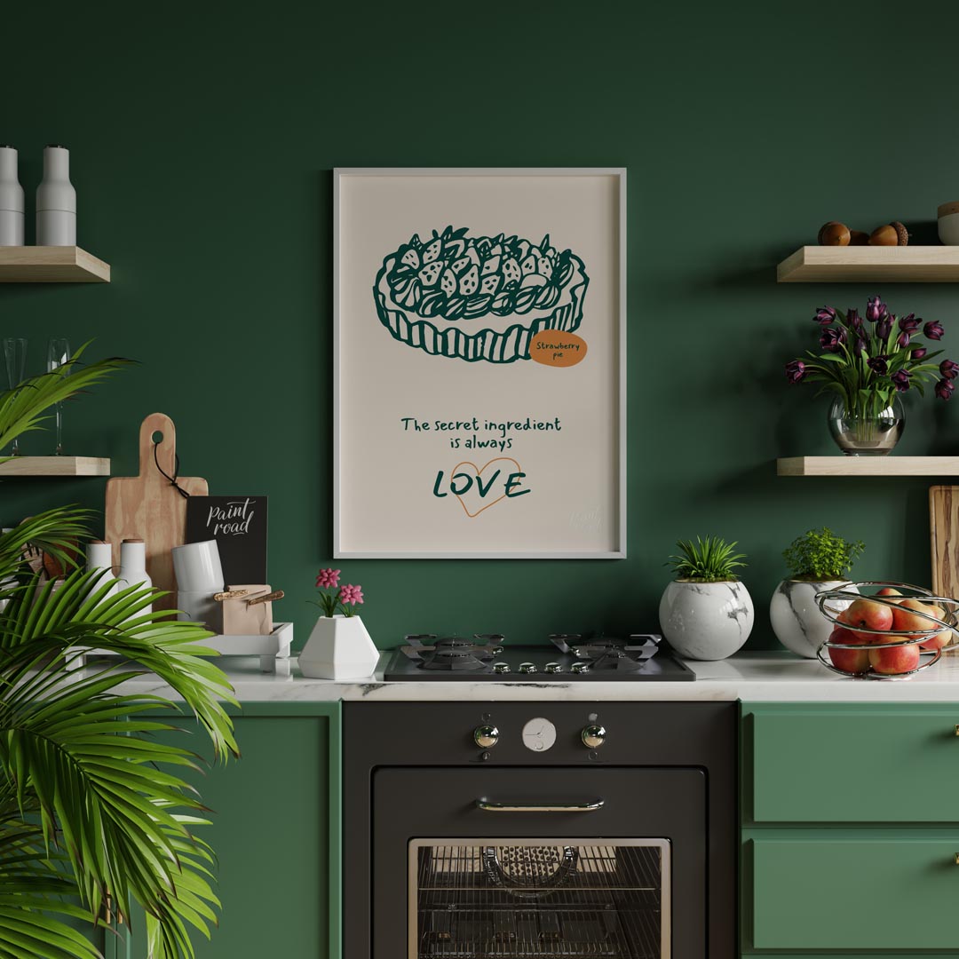 This heartwarming poster showcases a delightful line art illustration of a generously topped strawberry pie, rendered in a deep green against a soft, light background. The intricate details of the strawberries and crust are charmingly depicted. A small orange oval labels the dessert "Strawberry pie," adding a touch of color and clarity. Below the appetizing illustration, the profound message "The secret ingredient is always LOVE" is inscribed in a flowing, handwritten font. The word "LOVE" is notably larger and stands out with a subtle orange heart outline, emphasizing the emotional core of the message. This poster celebrates the sentiment that homemade food, especially desserts, is made more special with affection. It's an ideal piece for a kitchen, dining room, bakery, or a cozy living space, appealing to bakers, home cooks, and anyone who cherishes the heartfelt aspect of food and family.