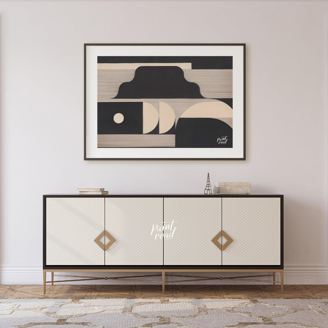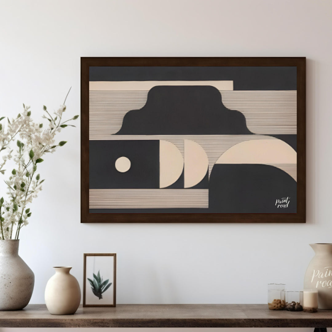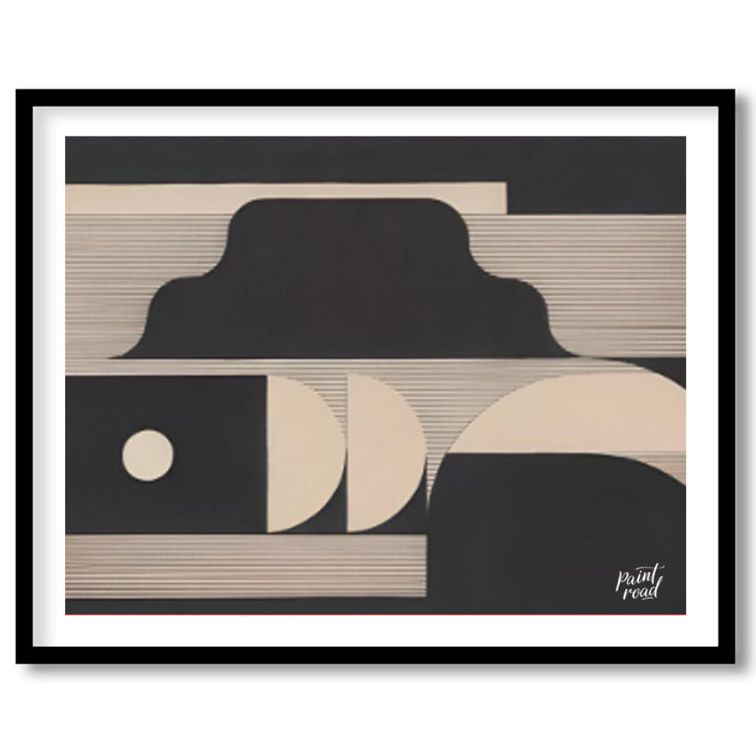 """Lunar Geometry"" presents a striking composition of geometric shapes in contrasting black and light tones, creating a visually compelling abstract design. The artwork features a combination of solid forms, semi-circles, and linear patterns, evoking a sense of structured elegance and modern design. The interplay of light and dark areas creates a sense of depth and balance, while the precise arrangement of shapes adds a dynamic quality to the overall composition. This piece is a testament to the power of geometric abstraction in creating visually engaging and thought-provoking art."