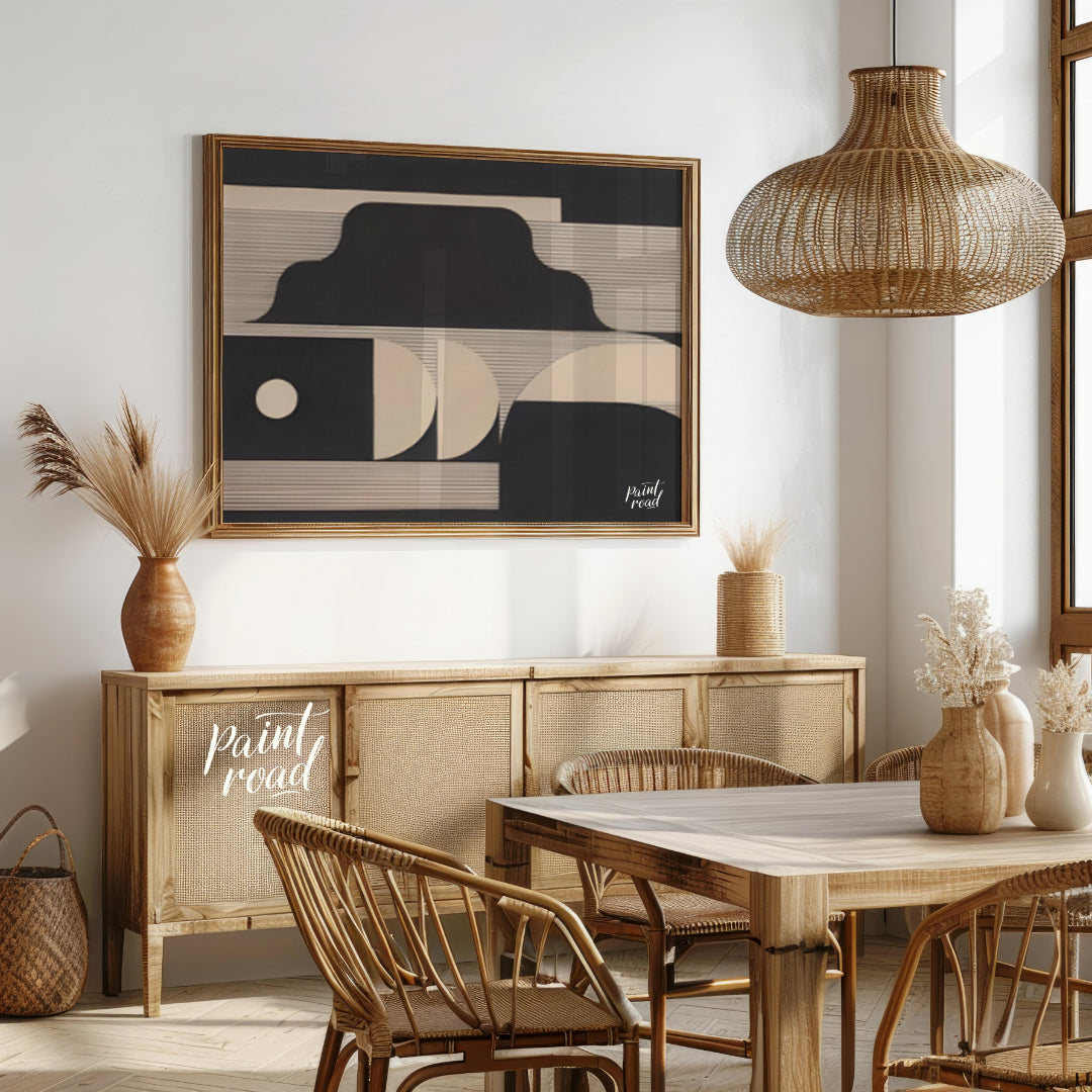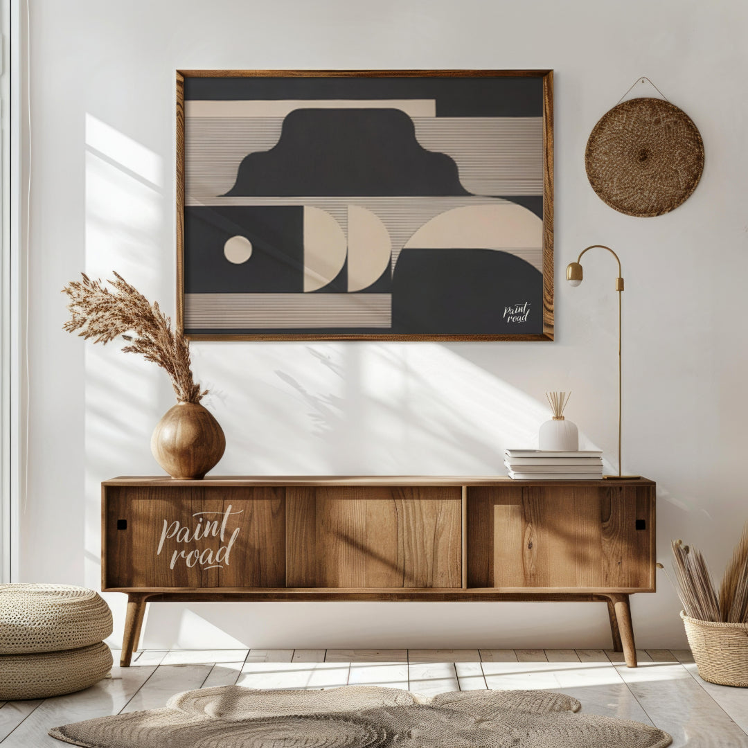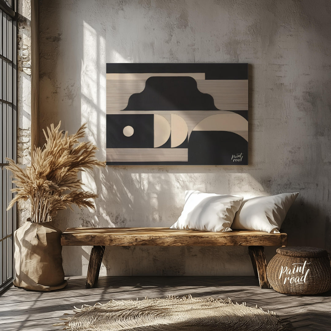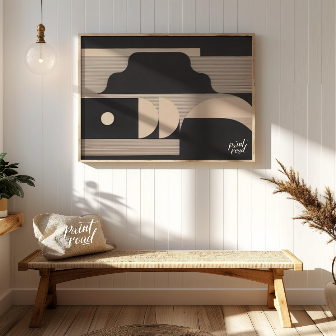 """Lunar Geometry"" presents a striking composition of geometric shapes in contrasting black and light tones, creating a visually compelling abstract design. The artwork features a combination of solid forms, semi-circles, and linear patterns, evoking a sense of structured elegance and modern design. The interplay of light and dark areas creates a sense of depth and balance, while the precise arrangement of shapes adds a dynamic quality to the overall composition. This piece is a testament to the power of geometric abstraction in creating visually engaging and thought-provoking art."