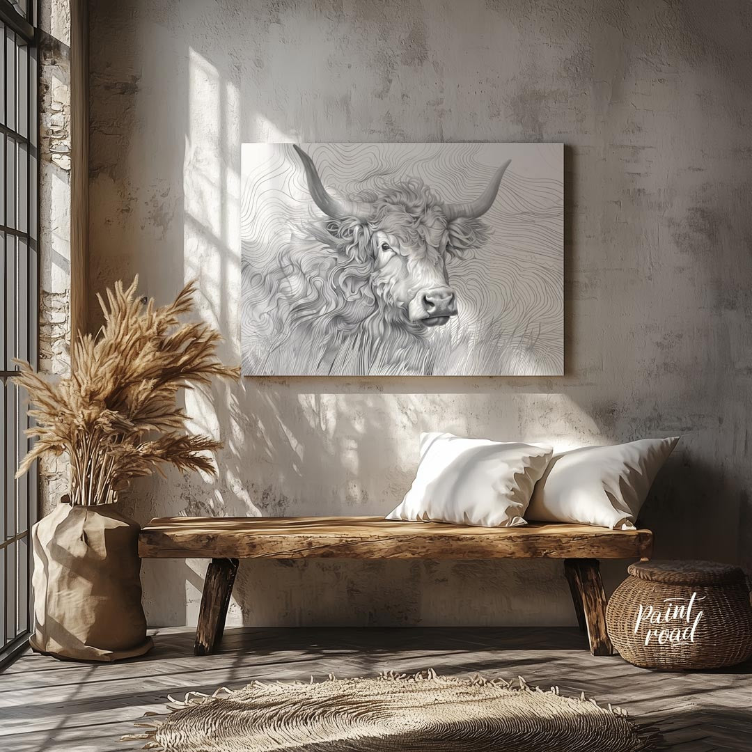 This captivating line art illustration features the head of a Highland cow, renowned for its long, shaggy hair and impressive horns. The artwork uses a combination of precise linework and intricate patterns to depict the cow's distinctive features. The swirling lines define its voluminous, curly fur, creating a sense of texture and movement, while the eyes are rendered with a more realistic detail, offering a piercing gaze. The background is subtly integrated with abstract wavy lines, hinting at a natural environment like grass or wind, without distracting from the main subject. The monochromatic palette emphasizes the intricate details and the strong form of the animal, making it a modern and elegant interpretation of this beloved breed.