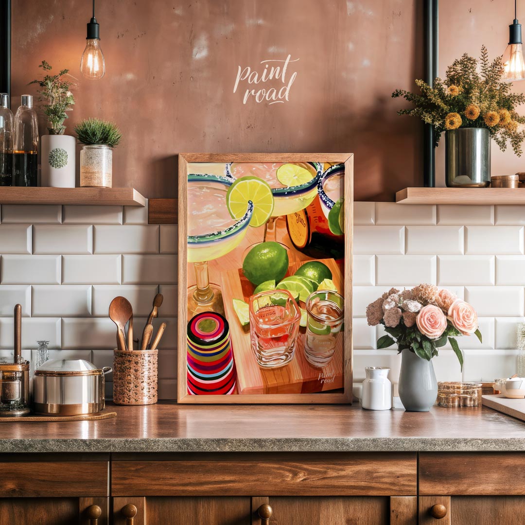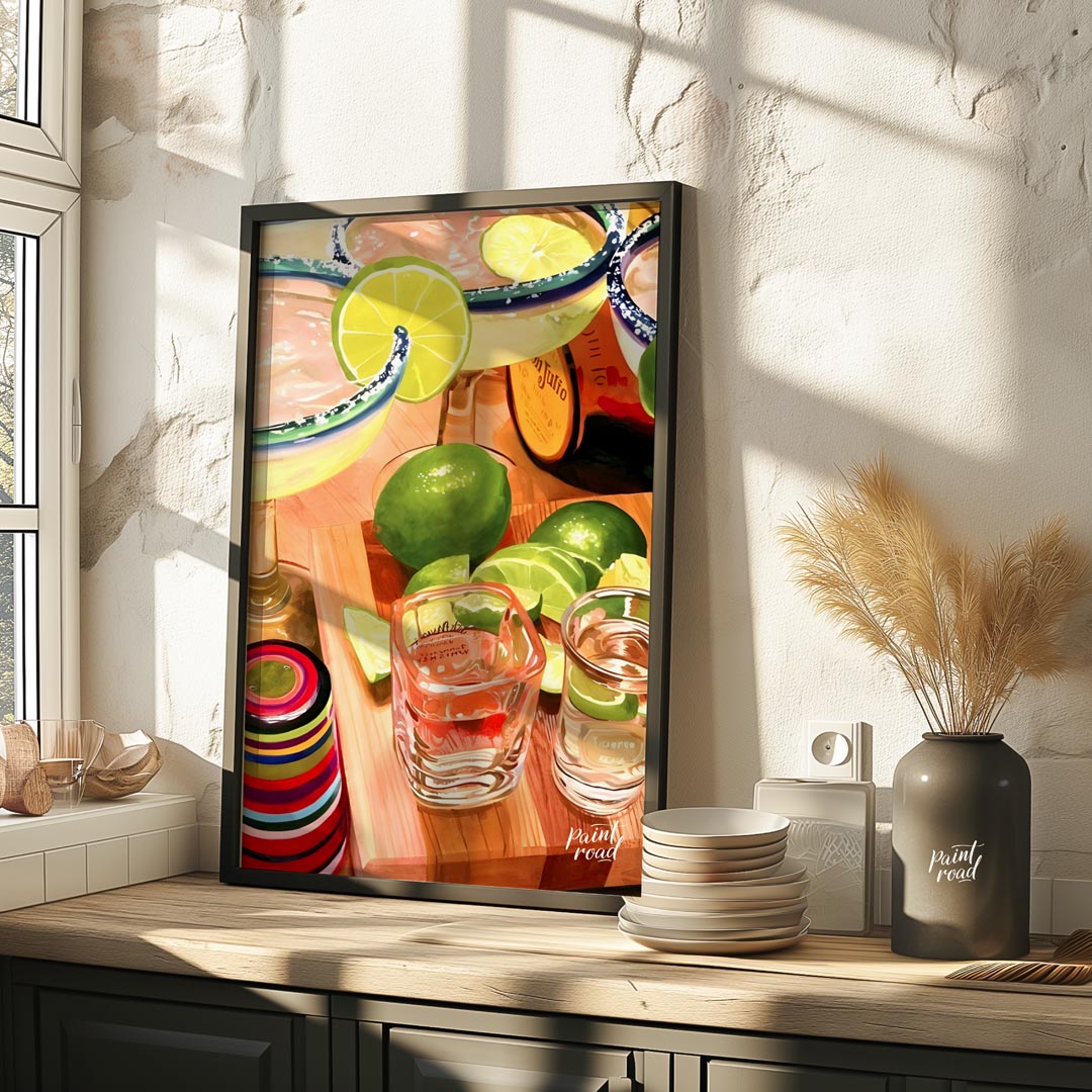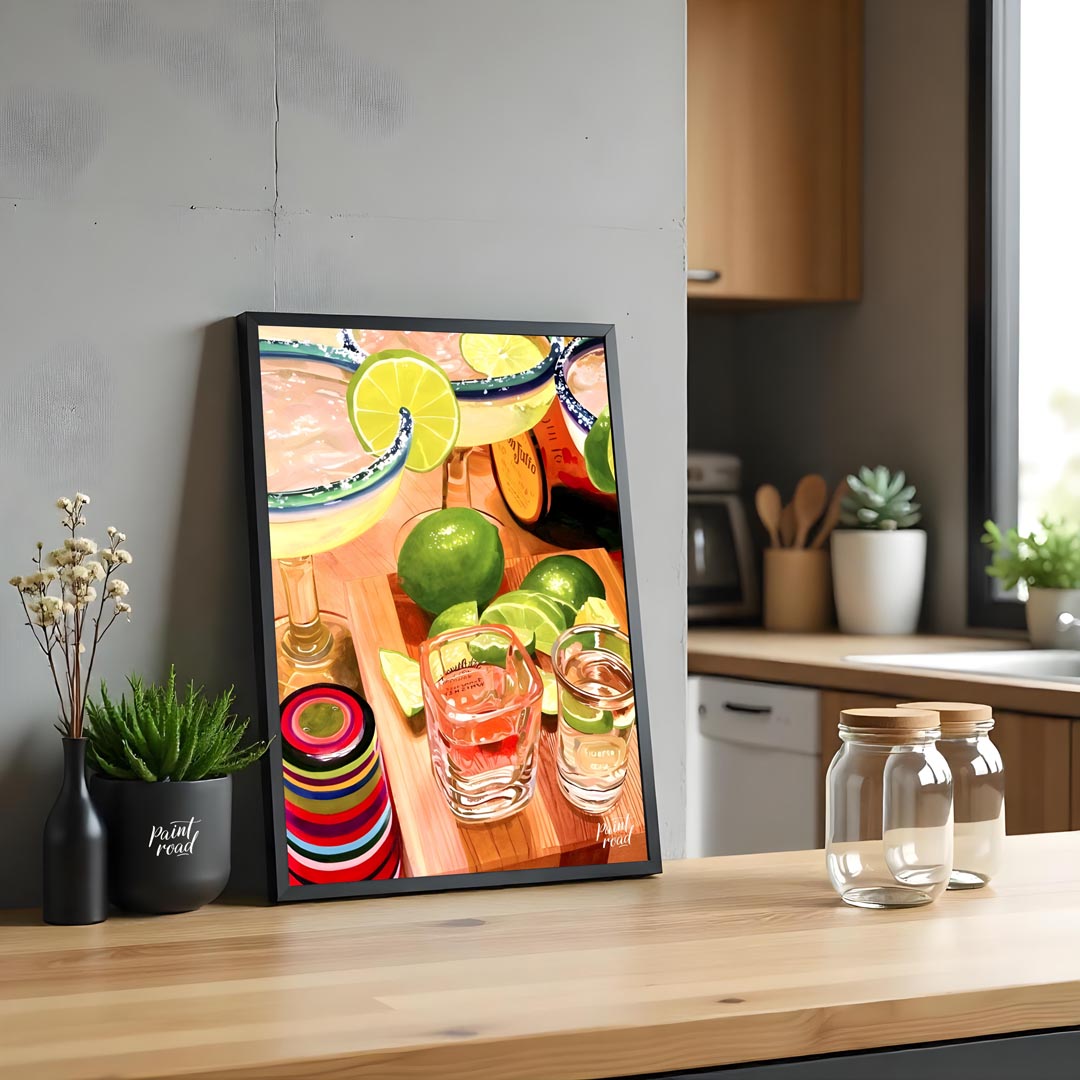 This incredibly vibrant and detailed poster captures the lively essence of a Mexican fiesta, centered around refreshing Margaritas. The artwork is rich with color and texture, depicting multiple margarita glasses with salt rims and lime garnishes, filled with a pale green liquid that shimmers invitingly. In the foreground, two shot glasses, one filled with a red liquid and another clear, sit on a rustic wooden board, alongside whole and cut limes, emphasizing the fresh ingredients. A colorful, striped Mexican blanket draped over the wooden surface adds a layer of rich pattern and cultural authenticity. In the background, hints of other festive elements like a bottle of spirits, a glass of water, and a dish with chopped vegetables or salsa complete the lively scene. The artistic style is expressive and painterly, with bold brushstrokes and a highly saturated color palette that evokes a joyful, energetic atmosphere. This poster is perfect for anyone who loves Mexican culture, festive gatherings, and delicious cocktails. It would be an outstanding focal point in a home bar, dining room, kitchen, patio, or any entertainment area, instantly transforming the space into a vibrant party setting.