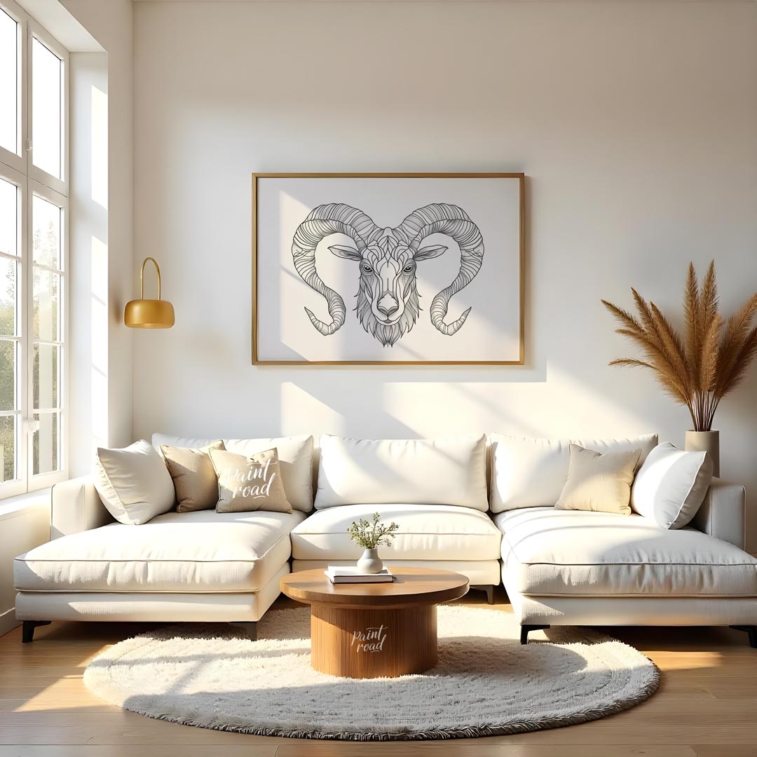 This highly detailed black and white illustration presents the head of a ram, characterized by its impressive, curving horns and an ornate, stylized design. The ram's face and horns are intricately filled with complex patterns, including stripes, dots, and swirling lines, creating a mesmerizing texture. The eyes are rendered with a piercing intensity, drawing the viewer's gaze. Subtle stippling and line work provide shading and depth, particularly around the beard and the contours of the face, enhancing the majestic and powerful appearance of the animal. The symmetrical composition of the horns frames the face beautifully, making it a captivating piece that blends realism with intricate decorative elements, reminiscent of traditional engraving or tribal art.