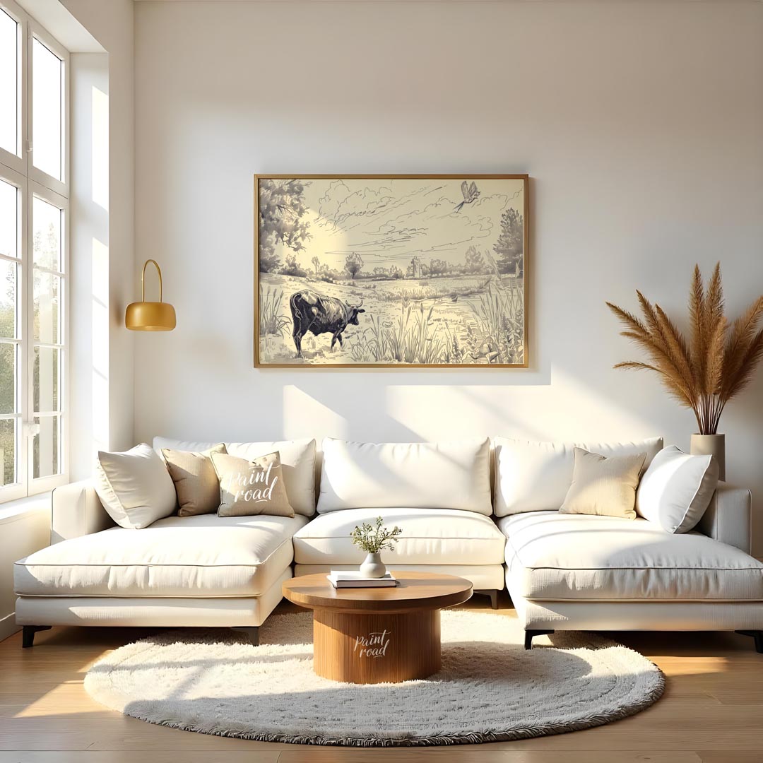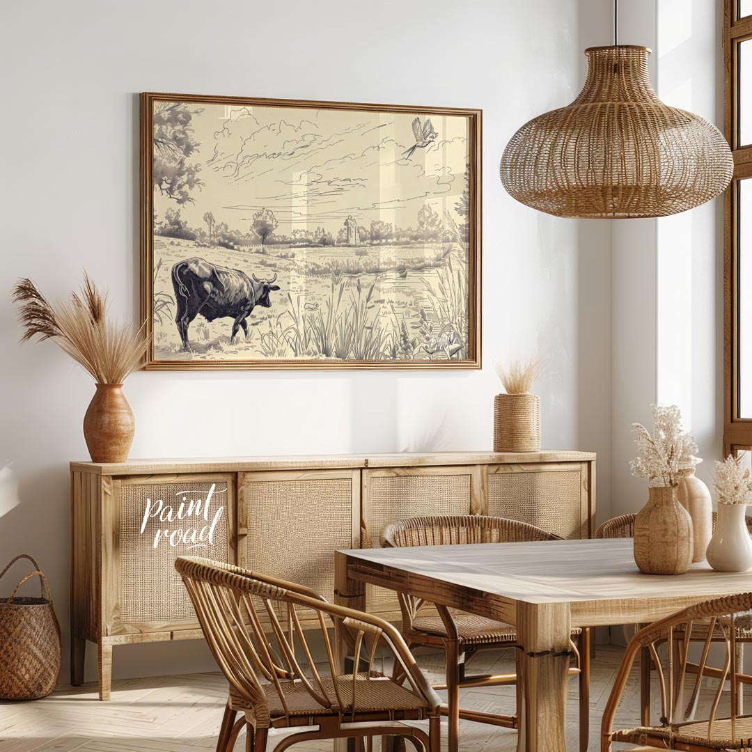 This detailed pen-and-ink drawing portrays a serene pastoral landscape, rich with intricate details and a timeless quality. In the foreground, a cow with distinctive markings walks through a field of tall grasses and wildflowers, its back turned slightly towards the viewer. The middle ground features a calm body of water with small boats and various aquatic plants. The background reveals a rolling landscape dotted with trees, a distant building, and hints of a rural village or town under a vast, expressive sky. A bird soars gracefully in the upper right, adding a touch of life to the scene. The entire illustration is rendered with fine linework, creating texture and depth, and the sepia tone of the paper enhances its classic, almost antique, aesthetic, evoking a sense of peaceful countryside.
