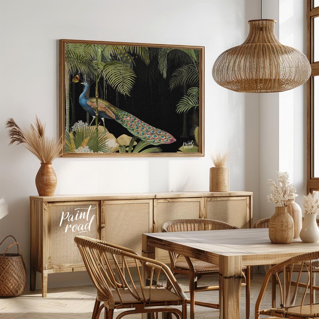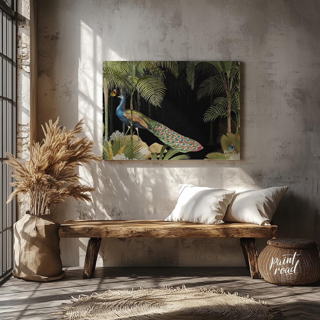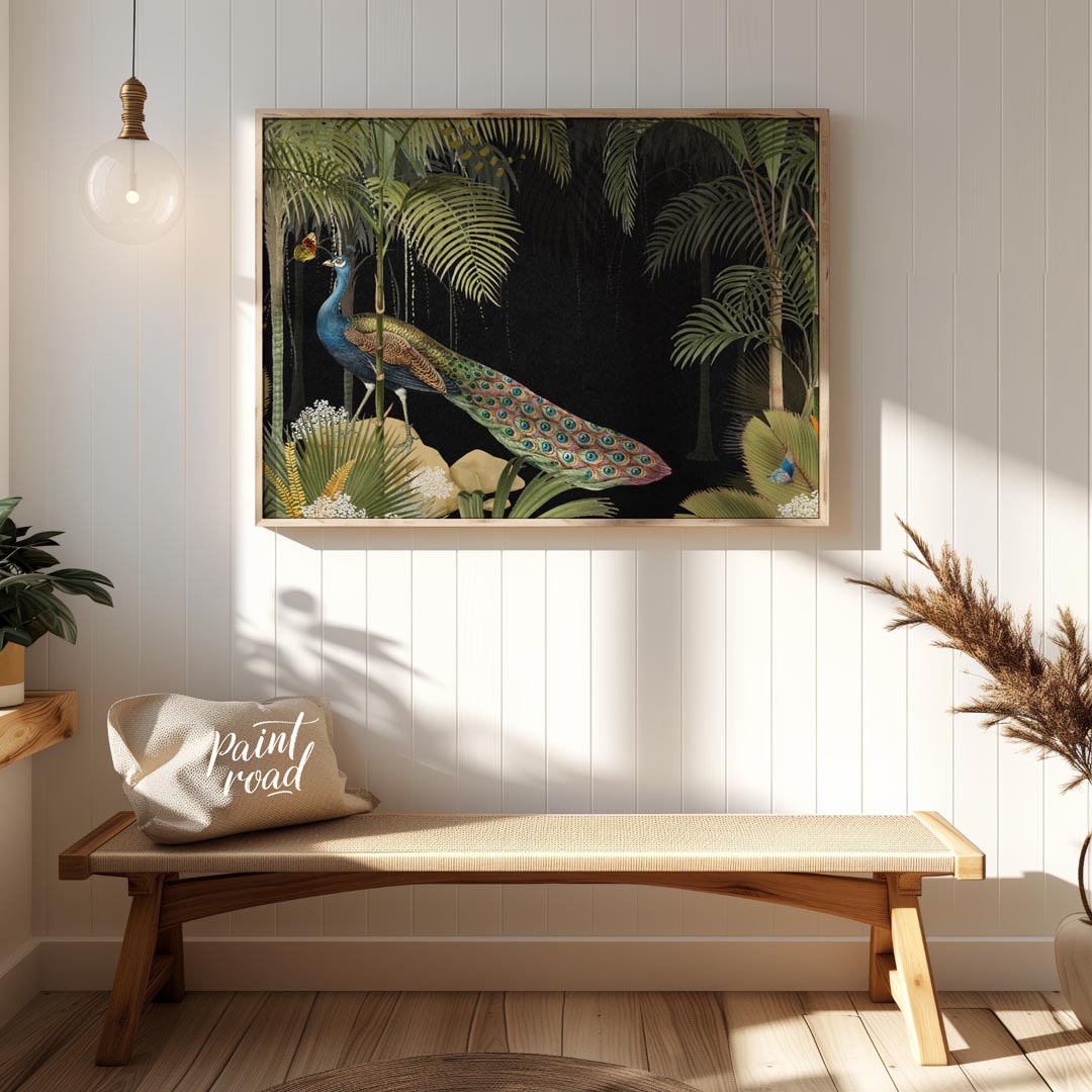This captivating artwork presents a magnificent peacock nestled within a dense, dark tropical jungle, illuminated by soft, natural light. The peacock, with its vibrant blue body and a long, elaborate tail fanning out with numerous iridescent "eyes," is the focal point. A small yellow butterfly delicately rests on its head, adding a touch of whimsical interaction. The background is a rich tapestry of lush green palm fronds and other tropical foliage, rendered in deep, mysterious tones against a dark, almost black, backdrop, suggesting a moonlit or deep jungle setting. White blossoms and smaller blue butterflies are subtly incorporated into the foreground, enhancing the natural beauty and depth of the scene. This piece evokes an atmosphere of exotic wonder and nocturnal serenity.