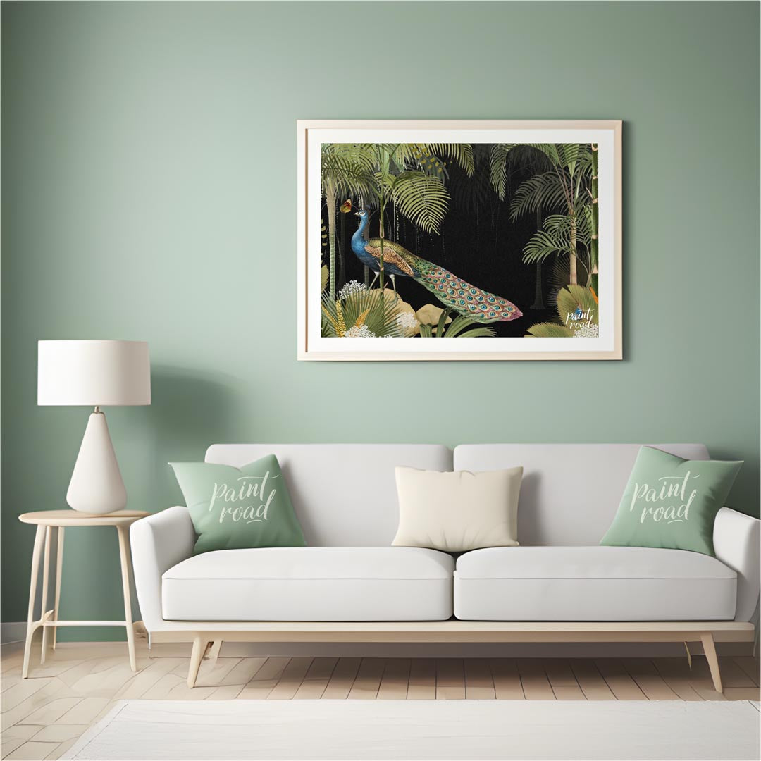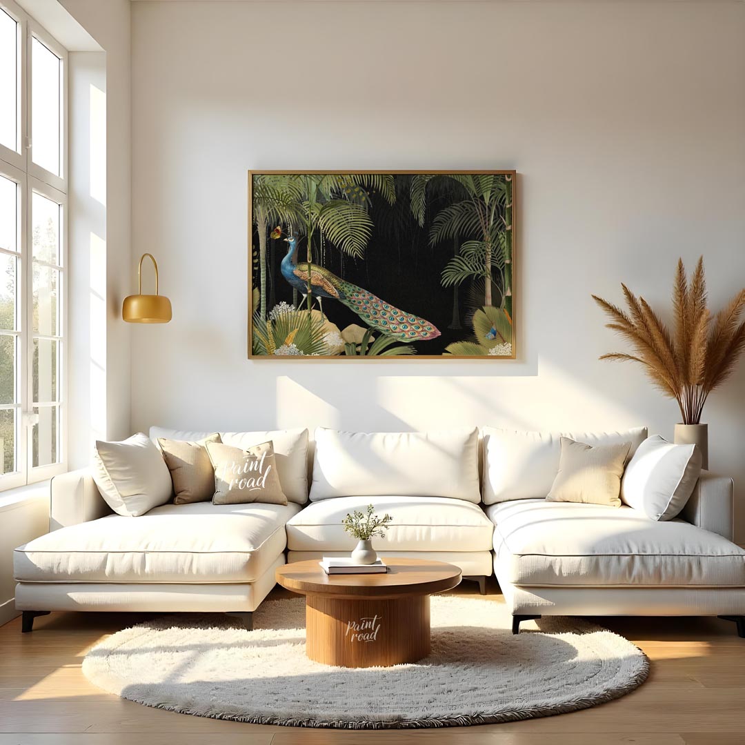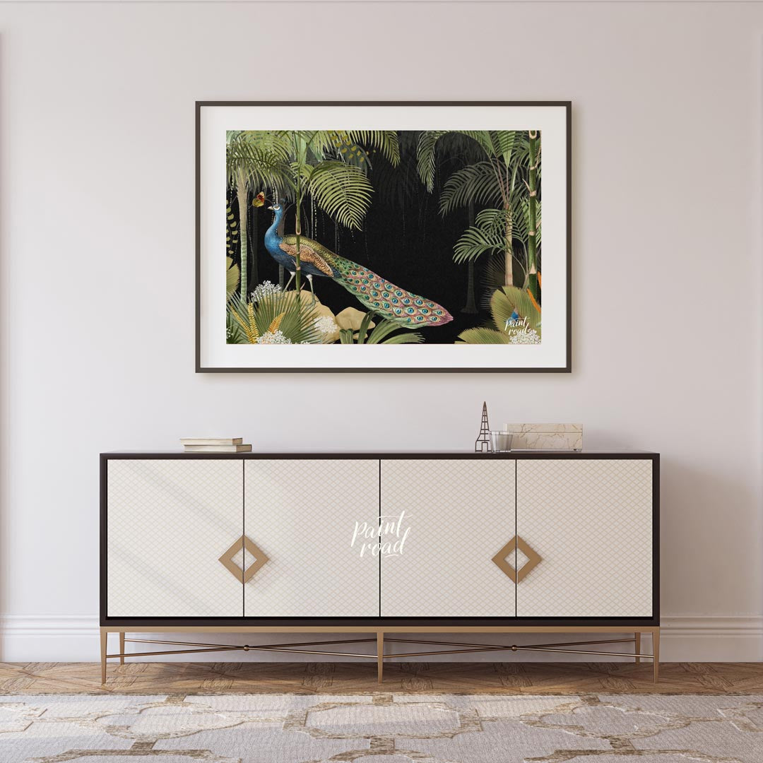 This captivating artwork presents a magnificent peacock nestled within a dense, dark tropical jungle, illuminated by soft, natural light. The peacock, with its vibrant blue body and a long, elaborate tail fanning out with numerous iridescent "eyes," is the focal point. A small yellow butterfly delicately rests on its head, adding a touch of whimsical interaction. The background is a rich tapestry of lush green palm fronds and other tropical foliage, rendered in deep, mysterious tones against a dark, almost black, backdrop, suggesting a moonlit or deep jungle setting. White blossoms and smaller blue butterflies are subtly incorporated into the foreground, enhancing the natural beauty and depth of the scene. This piece evokes an atmosphere of exotic wonder and nocturnal serenity.
