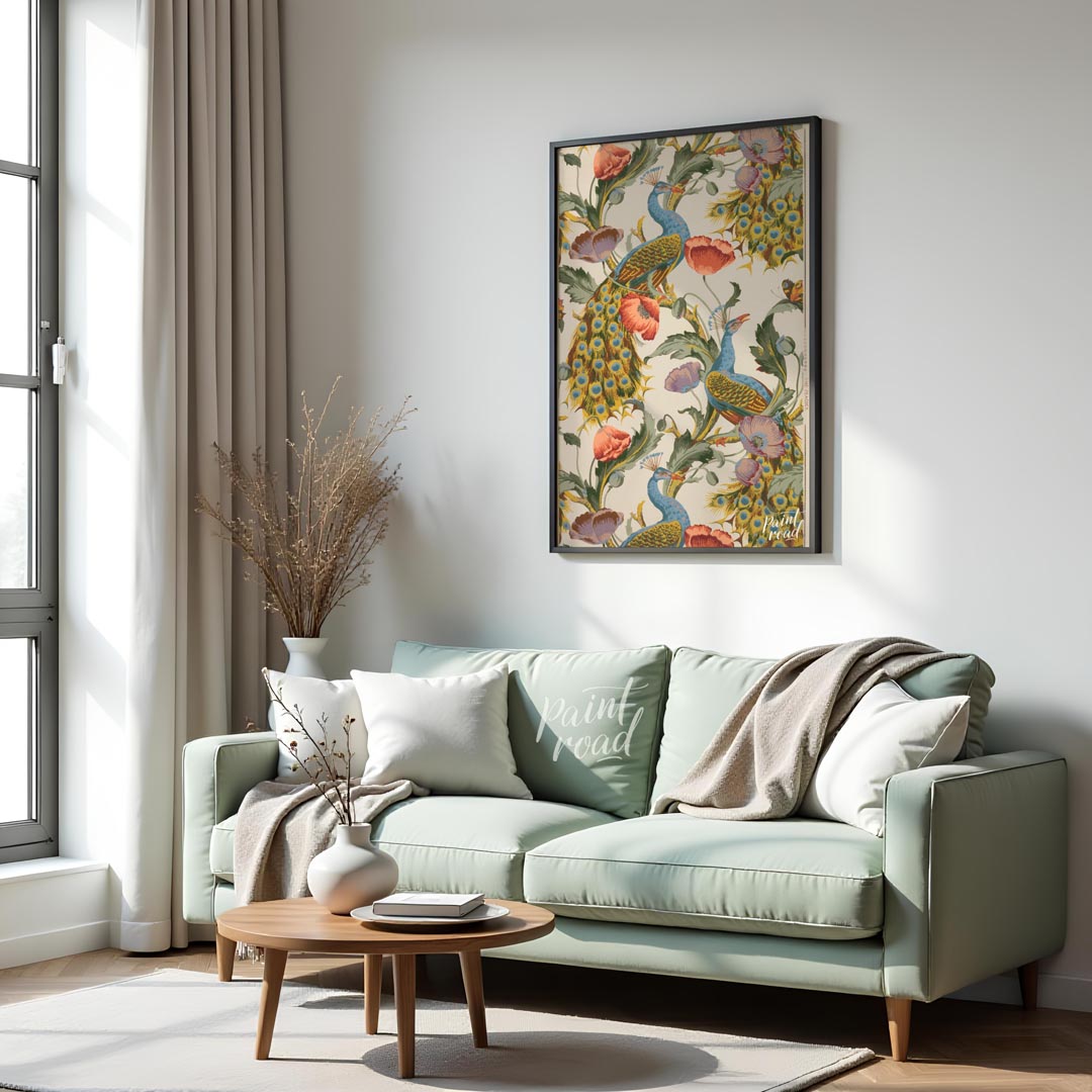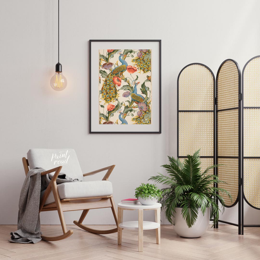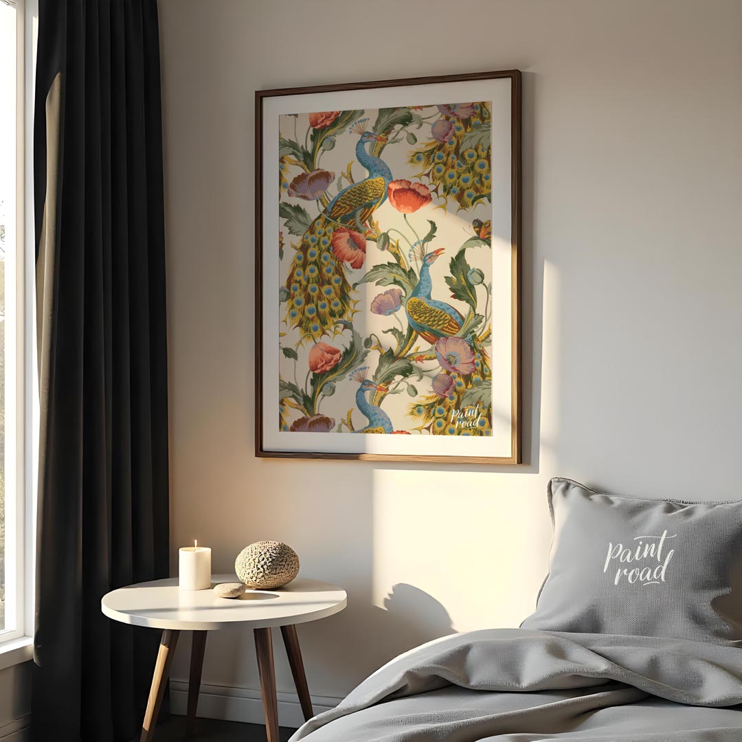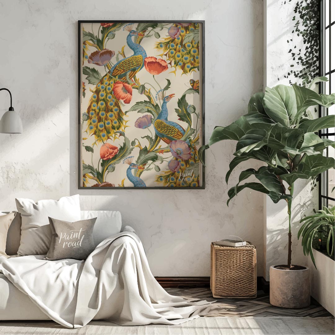 This vibrant and intricate pattern showcases majestic peacocks gracefully integrated with large, blooming poppies and other rich foliage against a light background. The peacocks are rendered in striking blues and greens, with their iconic tail feathers fanning out in a glorious display of "eyes." Lush red and purple poppies, along with verdant leaves and twisting vines, create a dense and flowing botanical design that complements the birds. The artwork has a distinct decorative and illustrative quality, reminiscent of classic textile designs or wallpaper from the Arts and Crafts movement. The repeating motif creates a sense of continuous beauty and natural abundance, making it a captivating and visually rich piece.