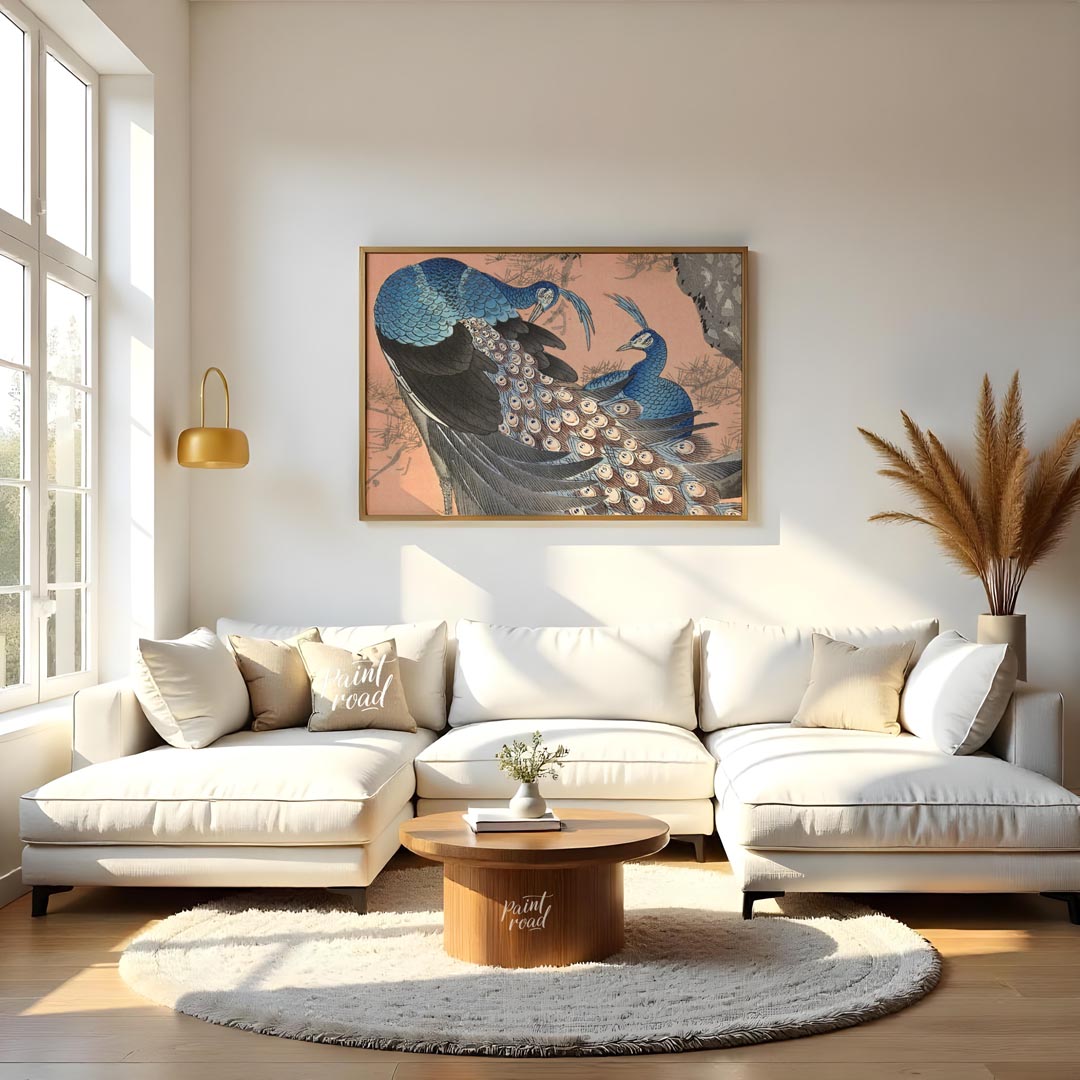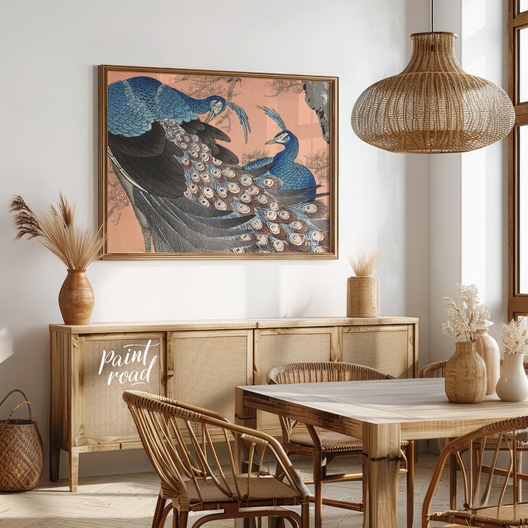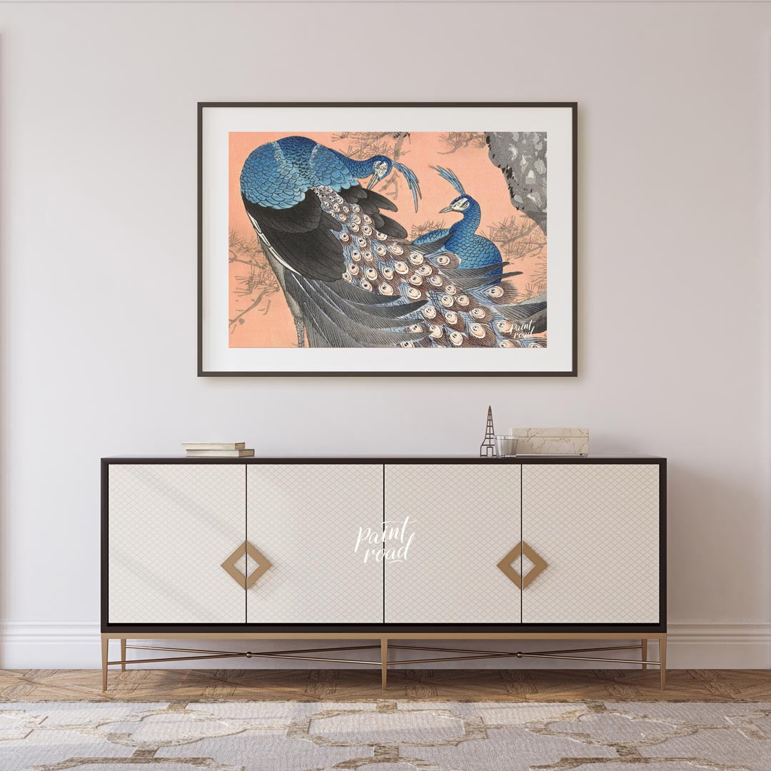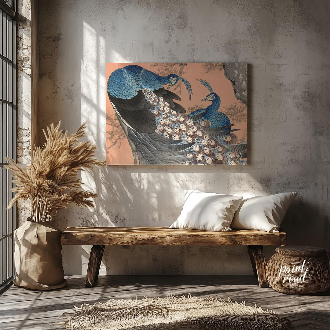 This vibrant artwork, possibly inspired by traditional Japanese or Chinese art, portrays two beautiful peacocks perched within the branches of a pine tree. The peacocks are rendered in stunning shades of blue, with one in the foreground showcasing its magnificent tail feathers, adorned with numerous iridescent "eyes." The other peacock is partially visible, complementing the composition. The pine tree's branches, with their distinct needles, are depicted in a muted grey and subtle green, providing a natural and contrasting frame for the colorful birds. The background is a soft, warm peach or coral tone, which beautifully highlights the blues and greens of the peacocks. The overall impression is one of natural elegance, prosperity, and striking beauty, characteristic of East Asian aesthetic traditions.